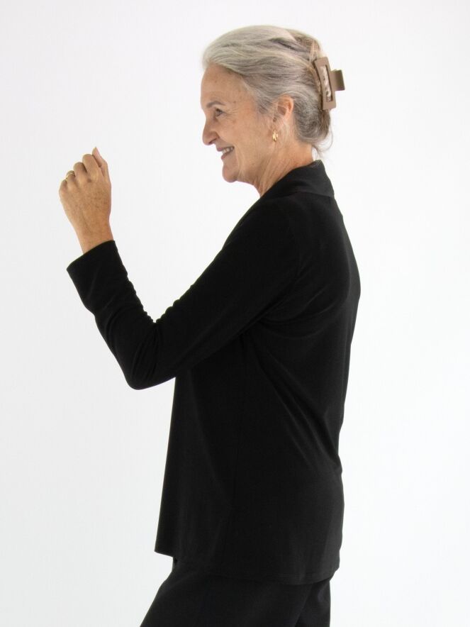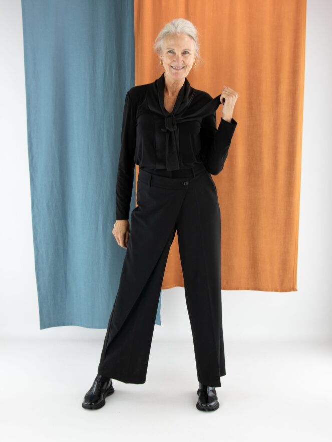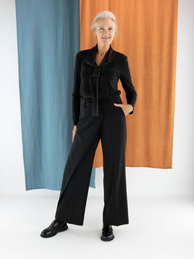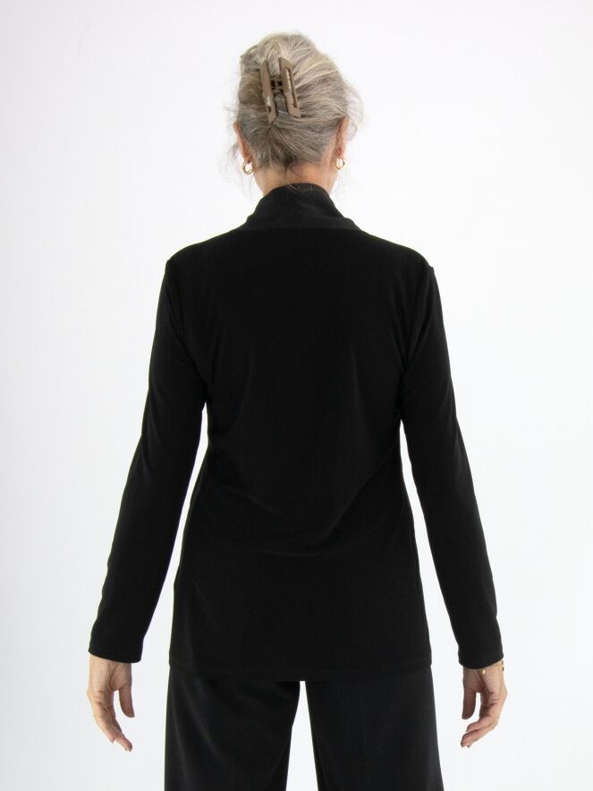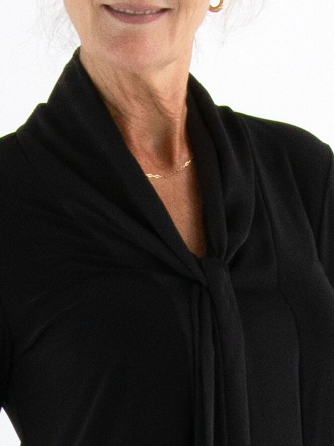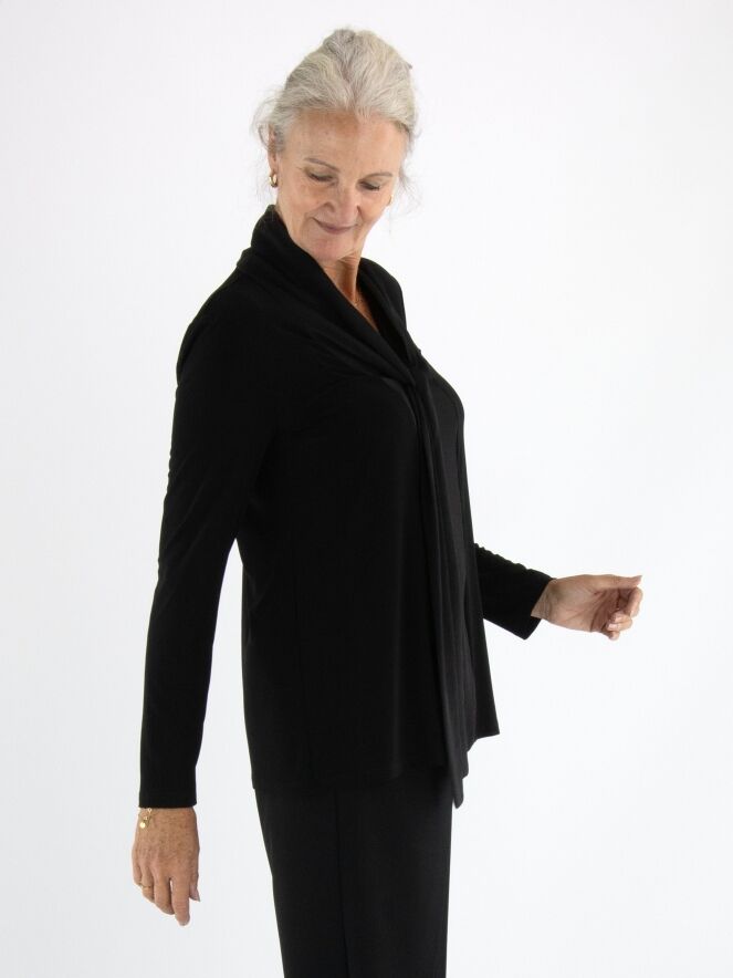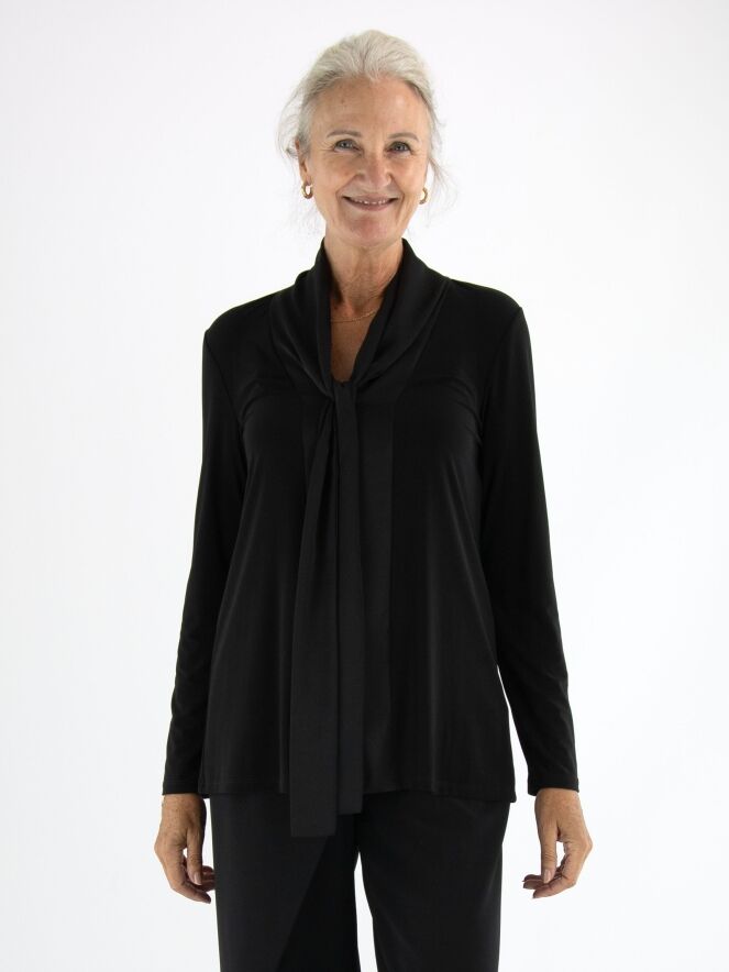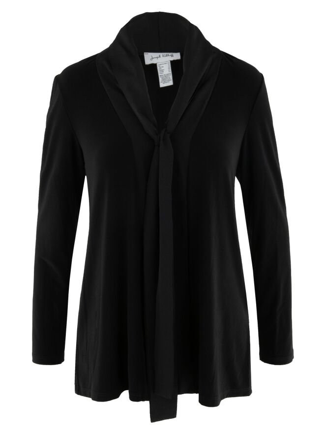 T-shirt noir de Joseph Ribkoff. Il présente un col foulard en satin mat, dont le tissu se prolonge depuis le col en V jusqu'en bas sous forme d’un large parement. Deux rubans décoratifs partent de l’encolure en V. Le t-shirt a des manches longues et doit être lavé à la main.