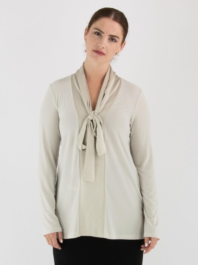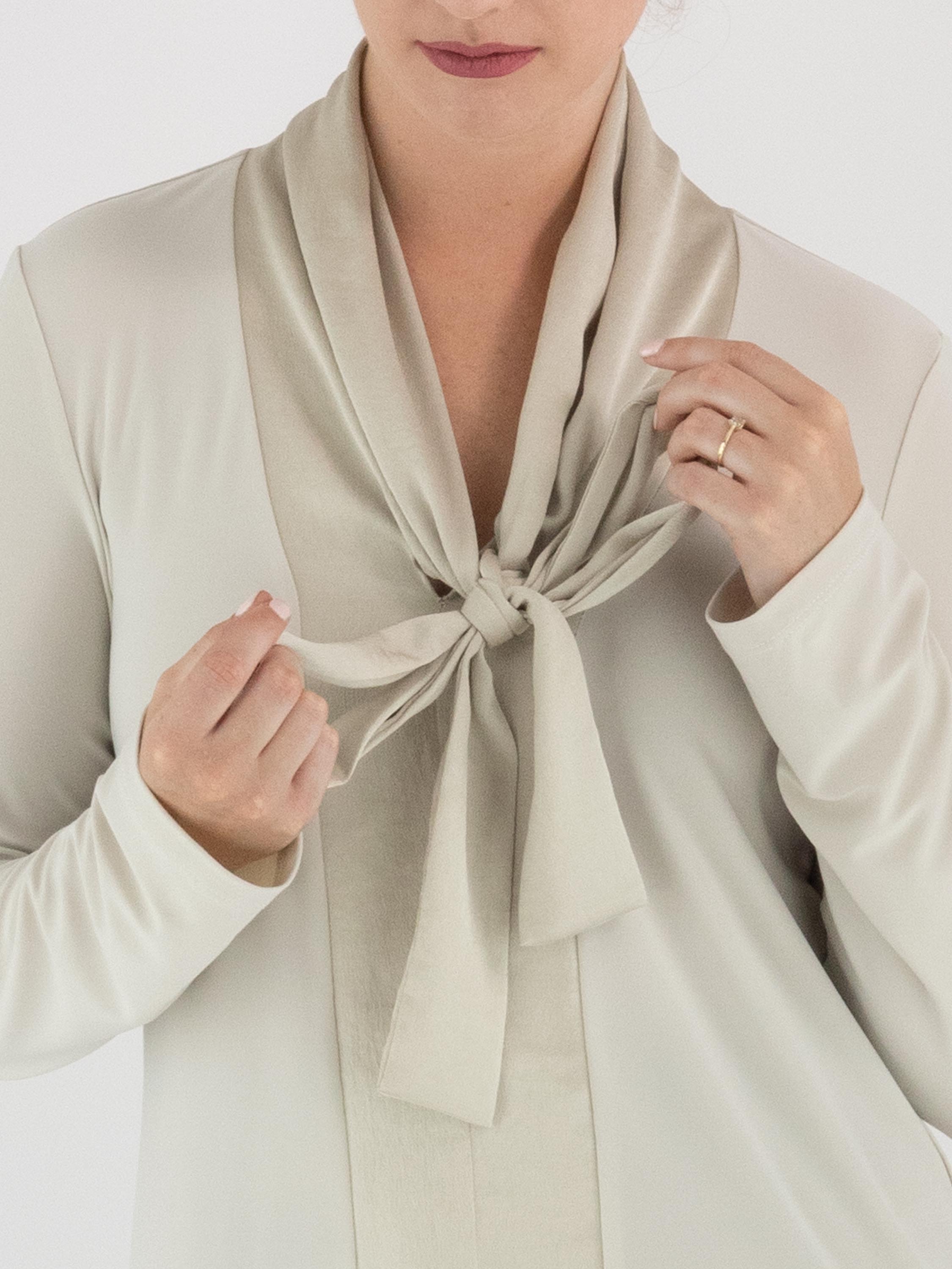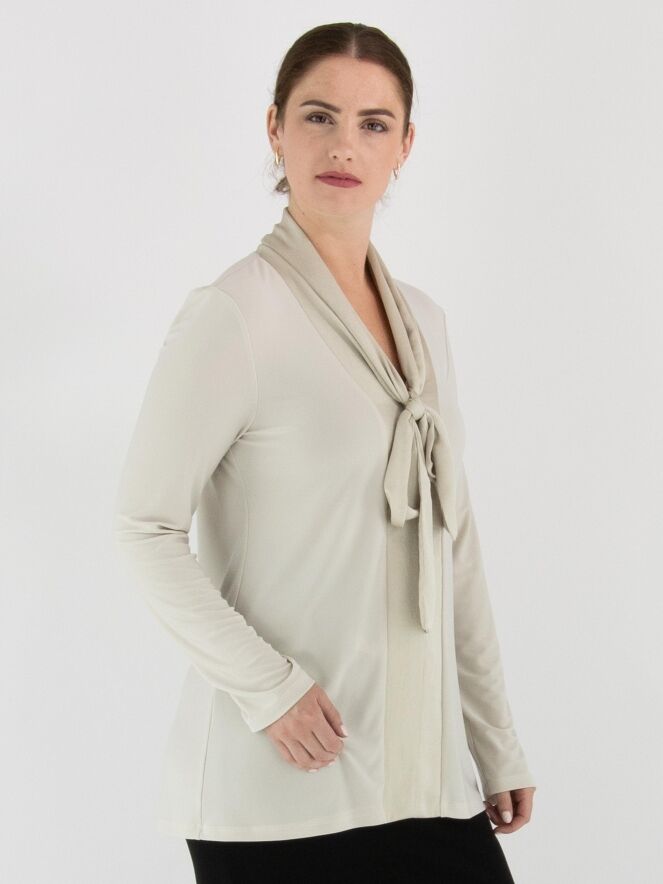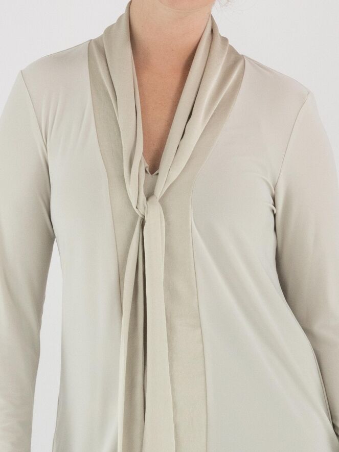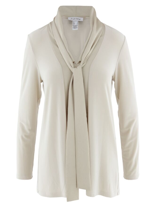 Un haut beige de Joseph Ribkoff avec un col châle en satin mat. Le tissu descend depuis l’encolure en V jusqu’en bas en formant un large ruban. Deux liens décoratifs tombent depuis l’encolure. Le haut a des manches longues et doit être lavé à la main.