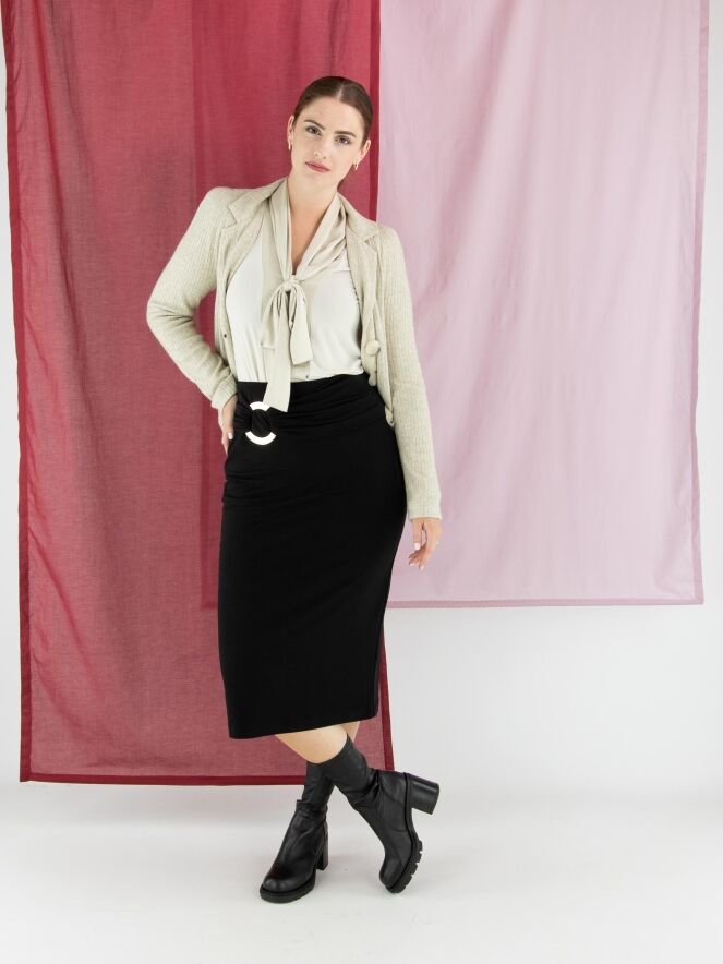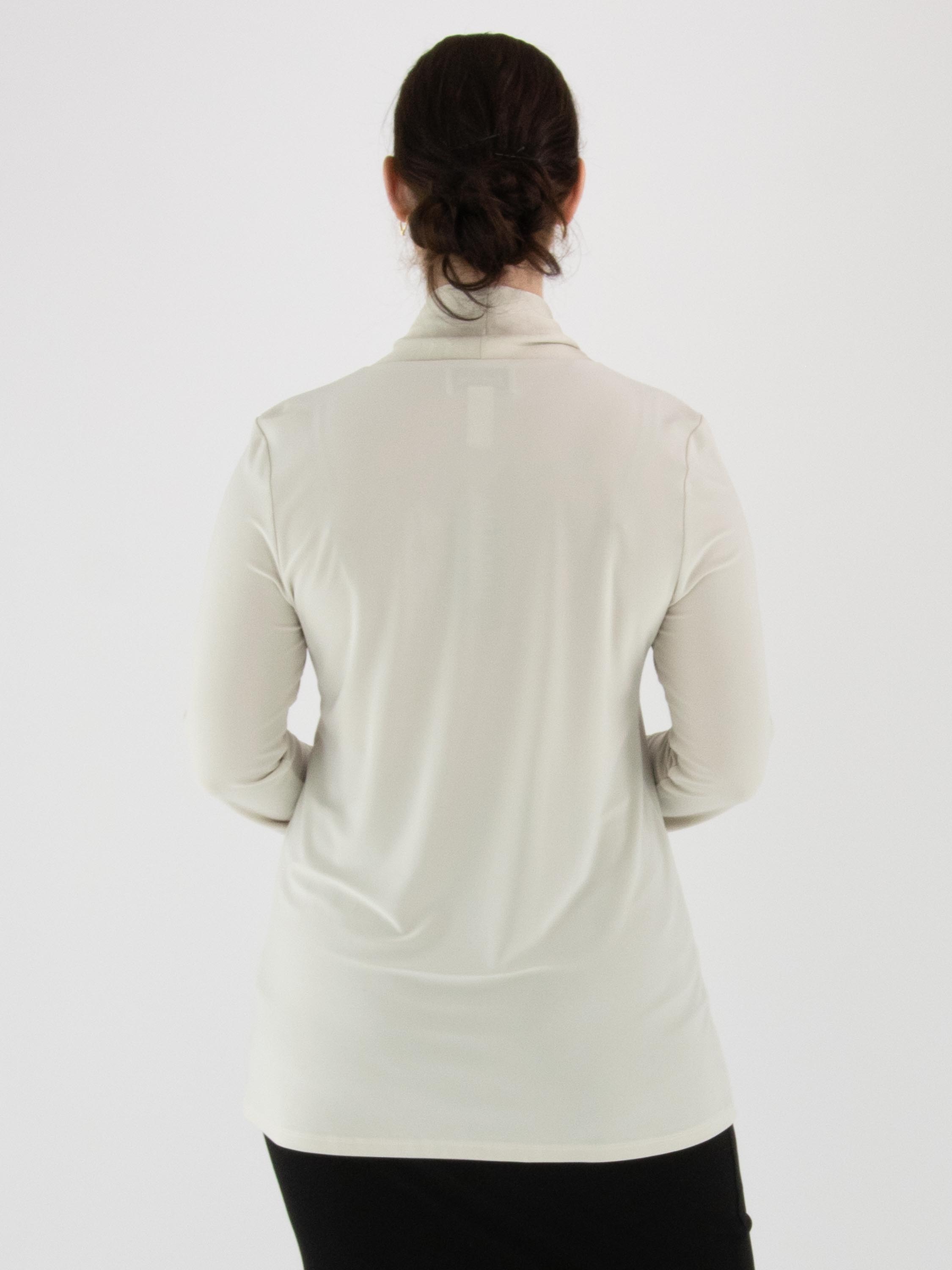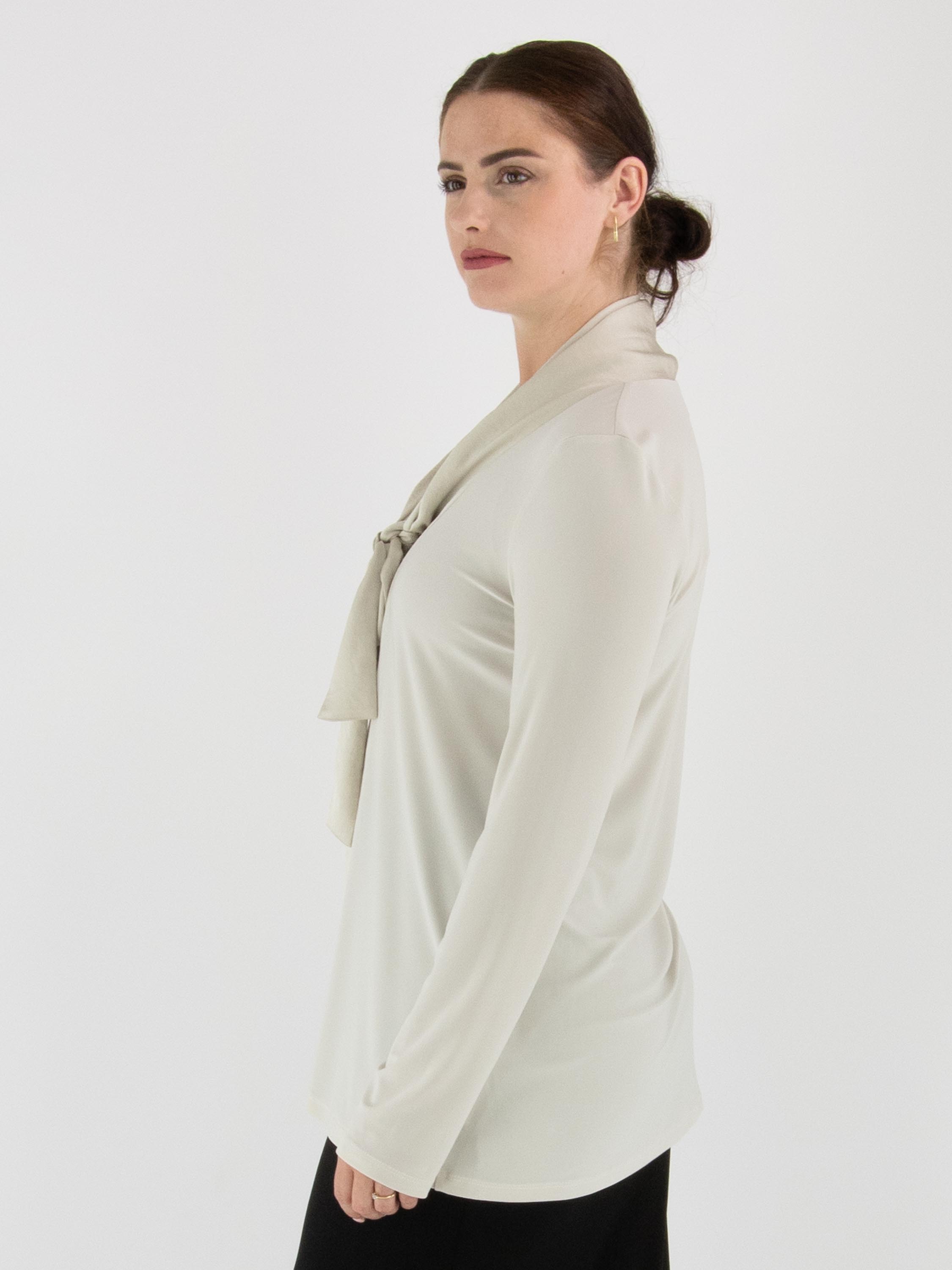 Un haut beige de Joseph Ribkoff avec un col châle en satin mat. Le tissu descend depuis l’encolure en V jusqu’en bas en formant un large ruban. Deux liens décoratifs tombent depuis l’encolure. Le haut a des manches longues et doit être lavé à la main.