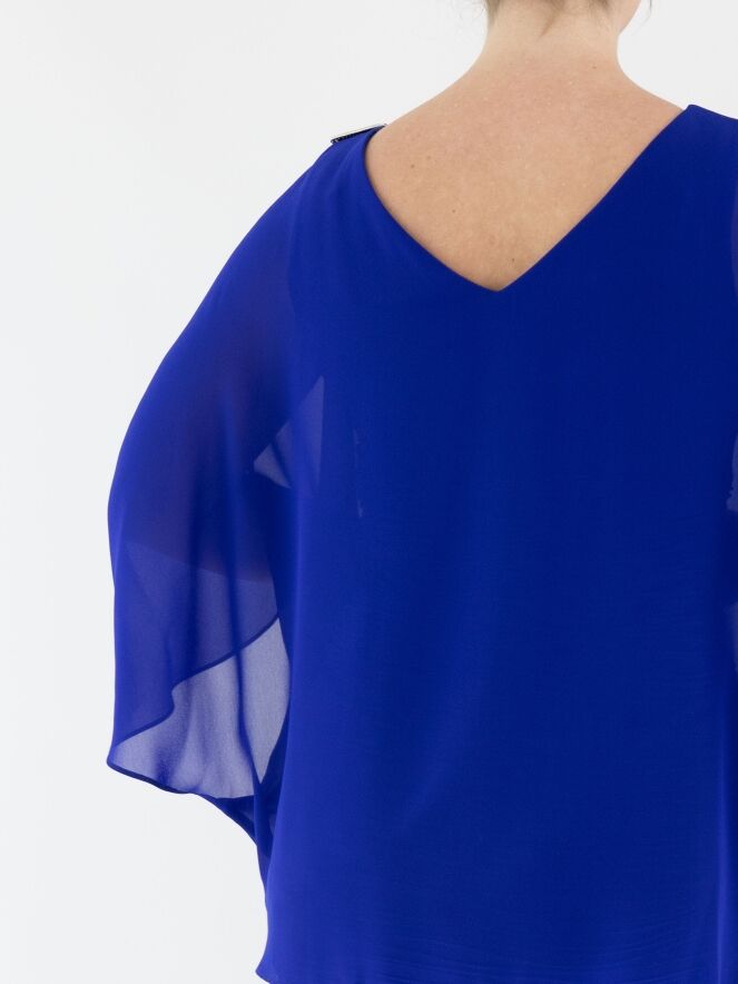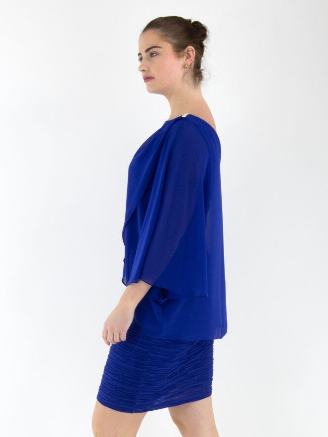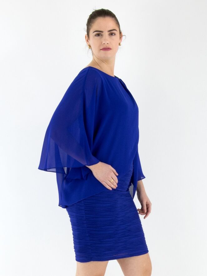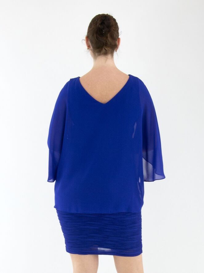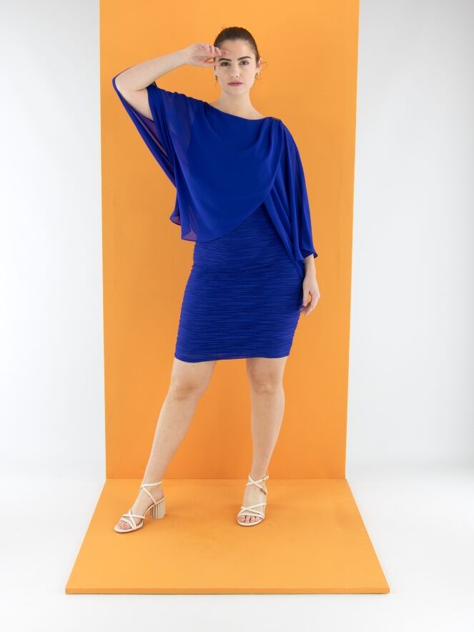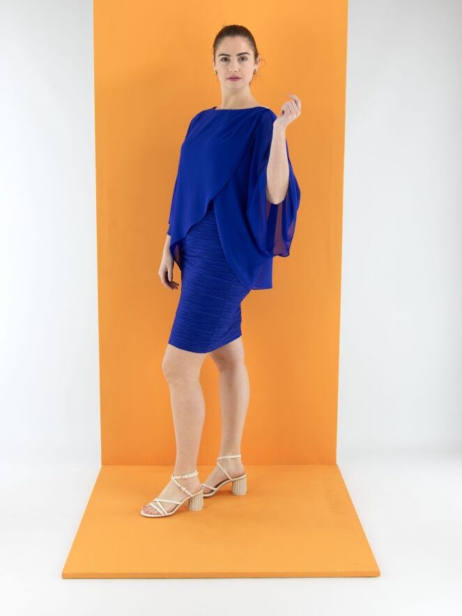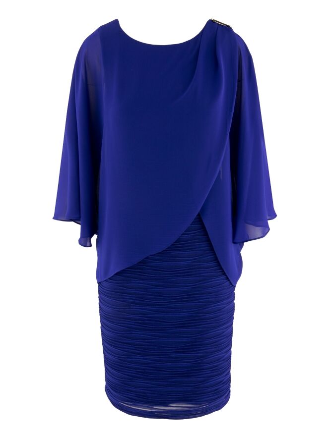 Une robe de Joseph Ribkoff en bleu cobalt. Le tissu présente une texture côtelée avec un fil doré tissé dans les lignes des côtes. La robe est doublée. Un voile superposé descend jusqu'à la taille, drapé depuis les épaules avec de délicats plis et fixé par une boucle décorative. Cette robe doit être lavée à la main.