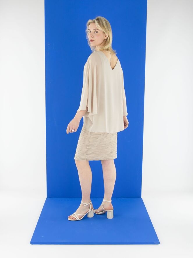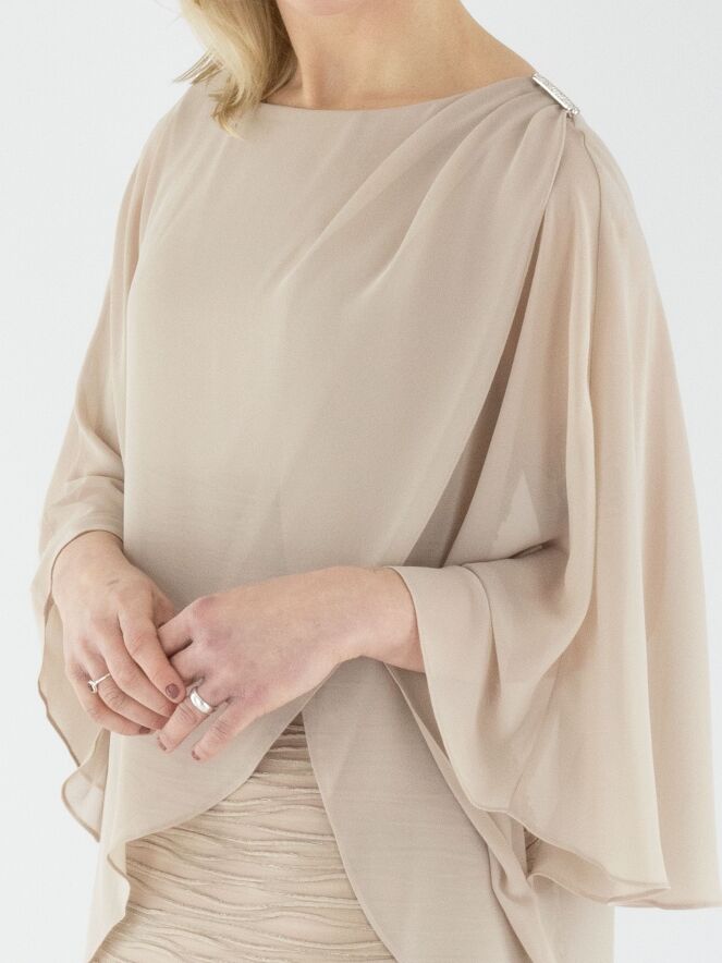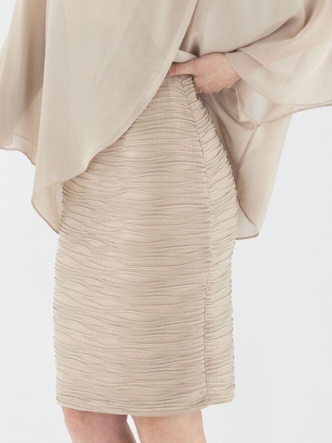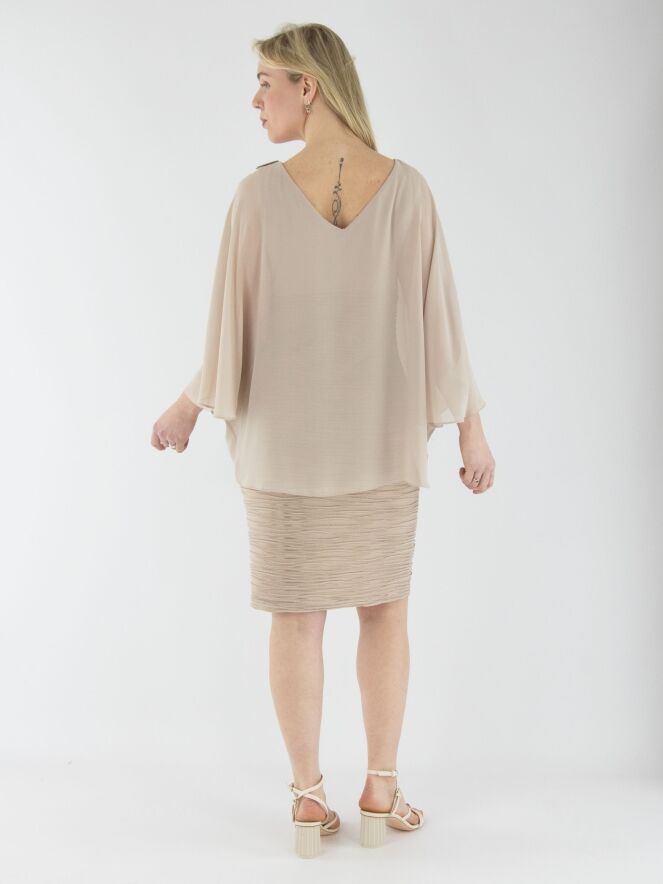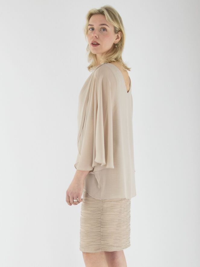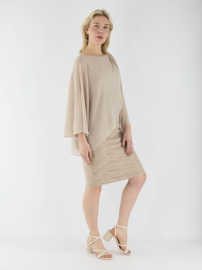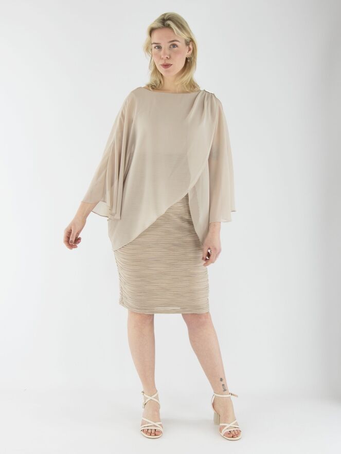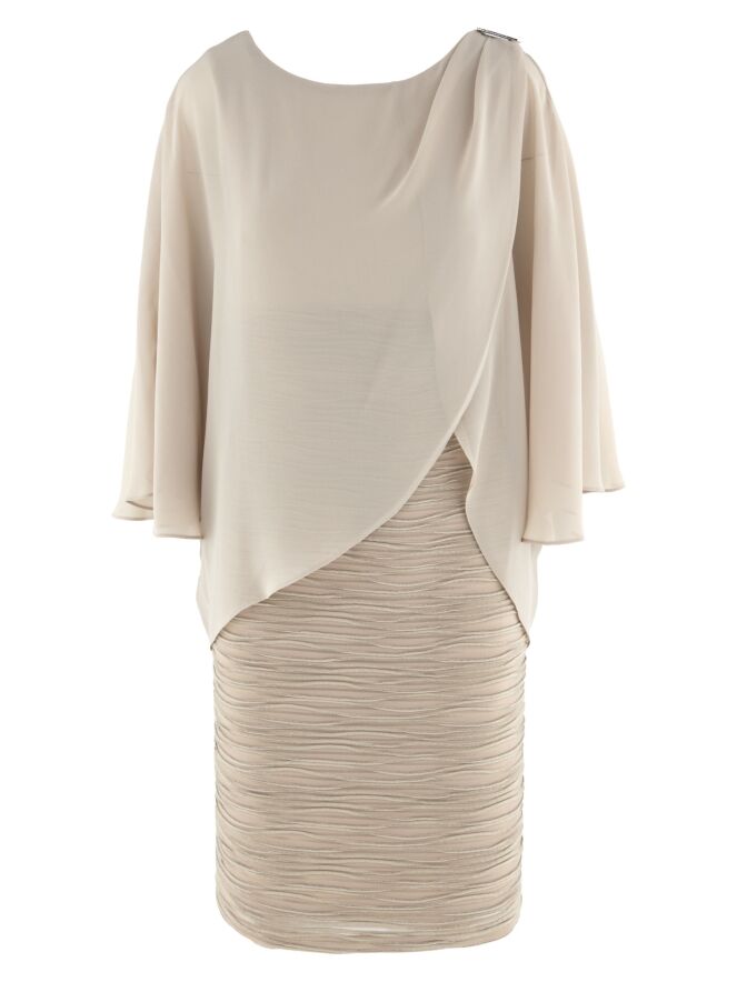 Une robe de Joseph Ribkoff de couleur sable. Le tissu présente une texture côtelée avec un fil doré intégré dans les lignes des côtes. La robe est doublée. Un voile superposé s’étend jusqu'à la taille, drapé depuis les épaules avec quelques plis et une boucle décorative. Cette robe doit être lavée à la main.
