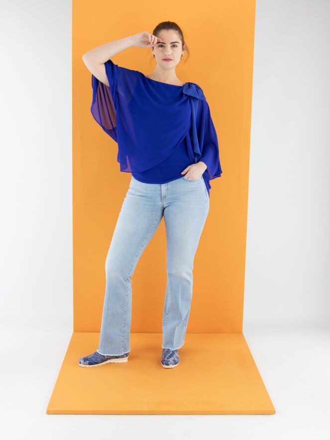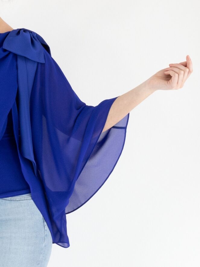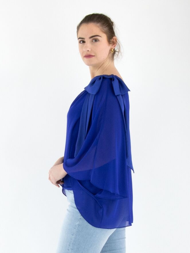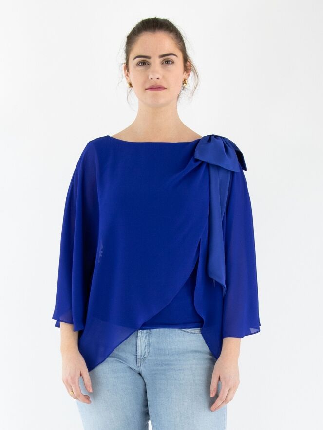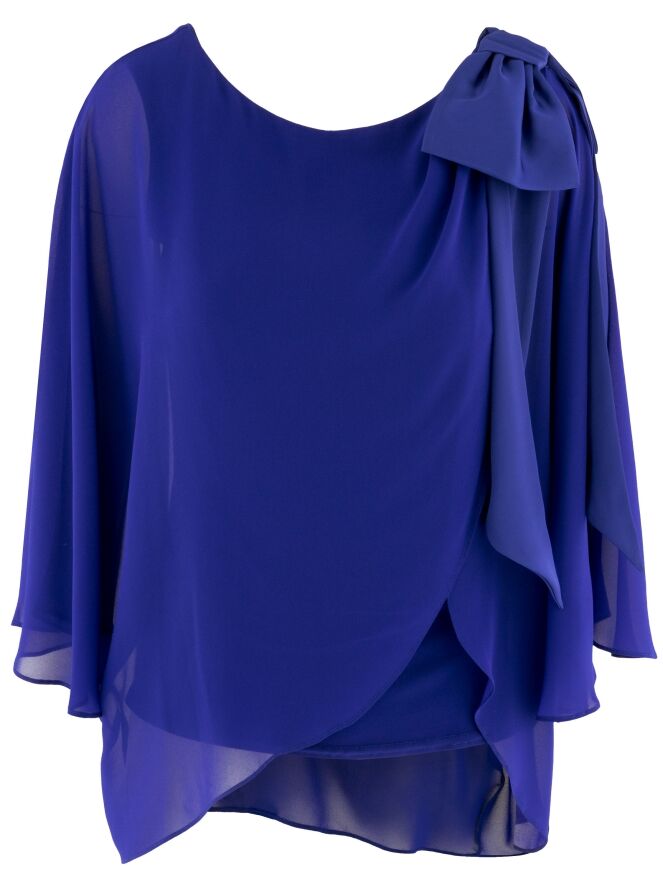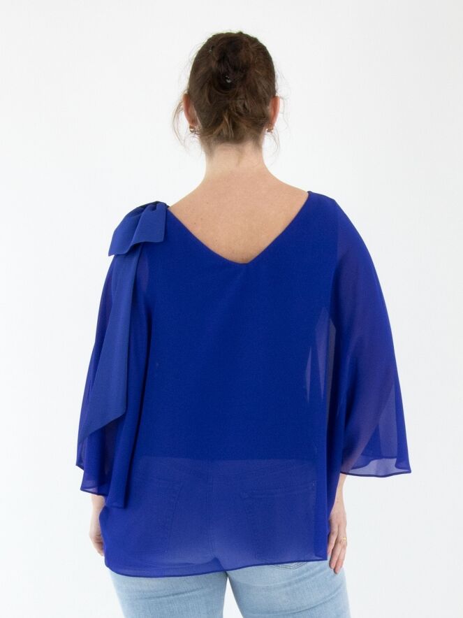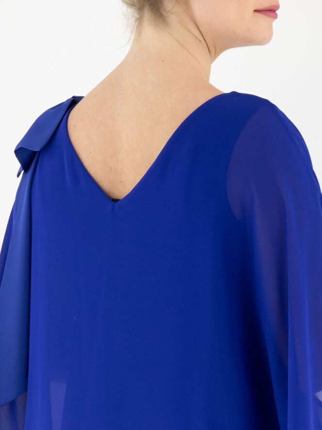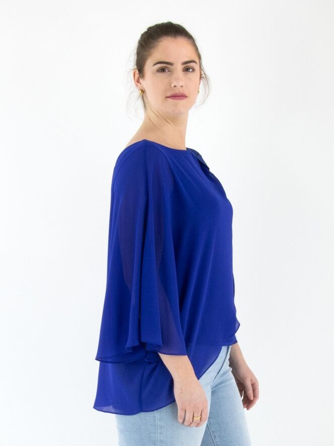 Un t-shirt de Joseph Ribkoff en bleu cobalt. La couche supérieure est transparente et se superpose en un drapé fluide sur le top de base en dessous. À l’avant, au niveau de l’épaule gauche, une boucle décorative est ajoutée. Ce t-shirt doit être lavé à la main.