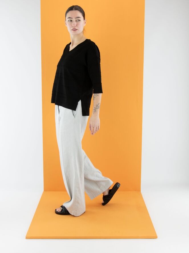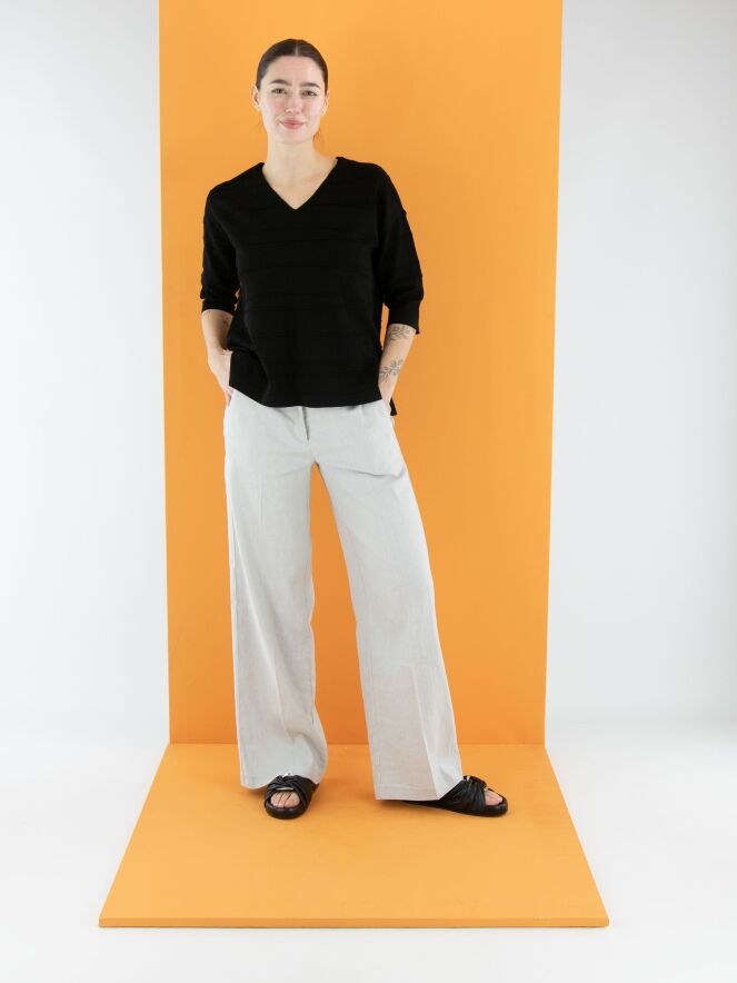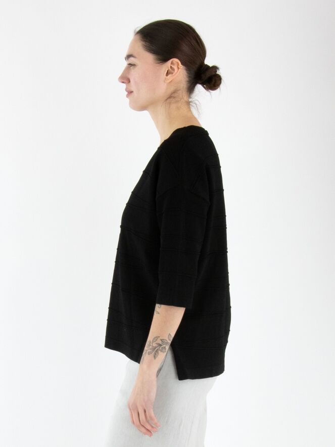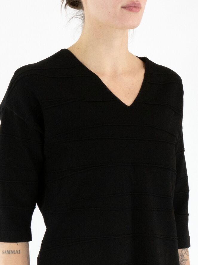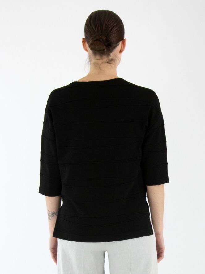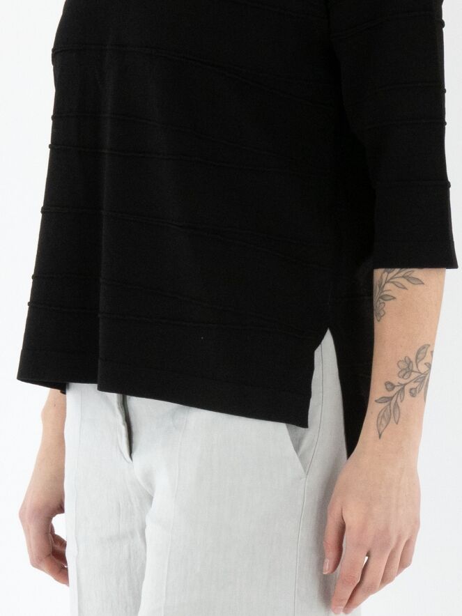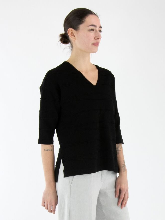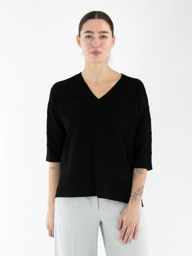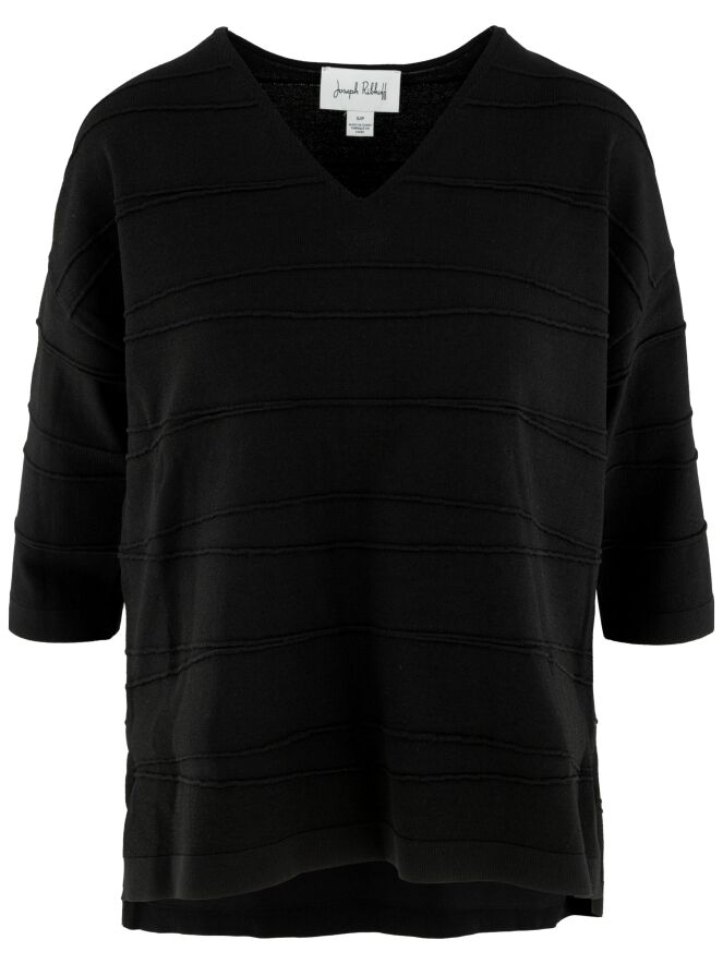 Un t-shirt de Joseph Ribkoff en noir. Le t-shirt présente un col en V et de subtiles rayures horizontales. De chaque côté en bas, une petite fente est ajoutée. Ce t-shirt doit être lavé à la main.