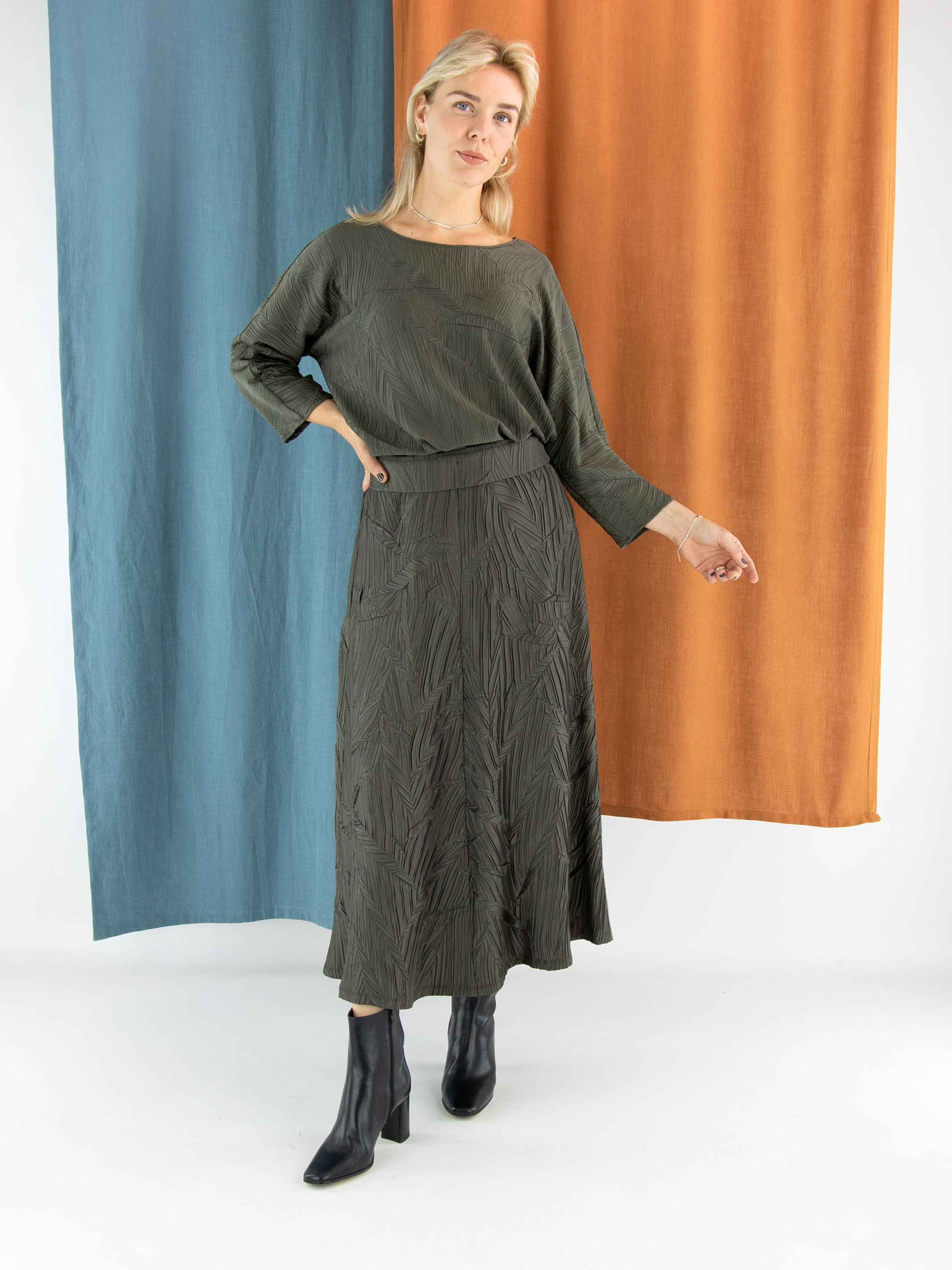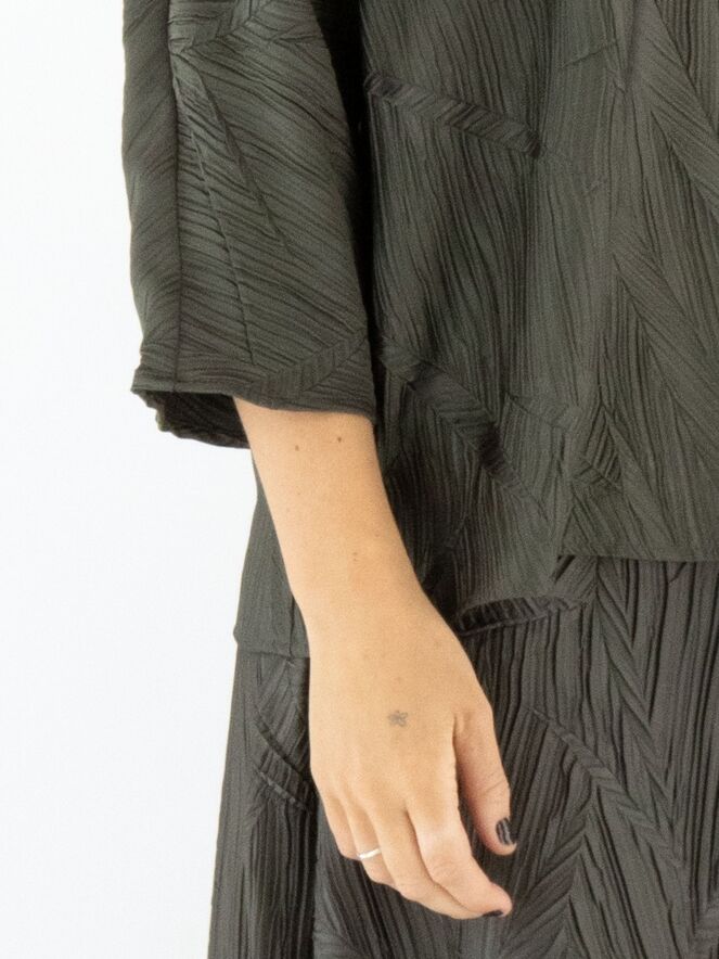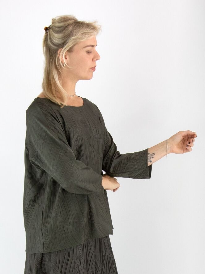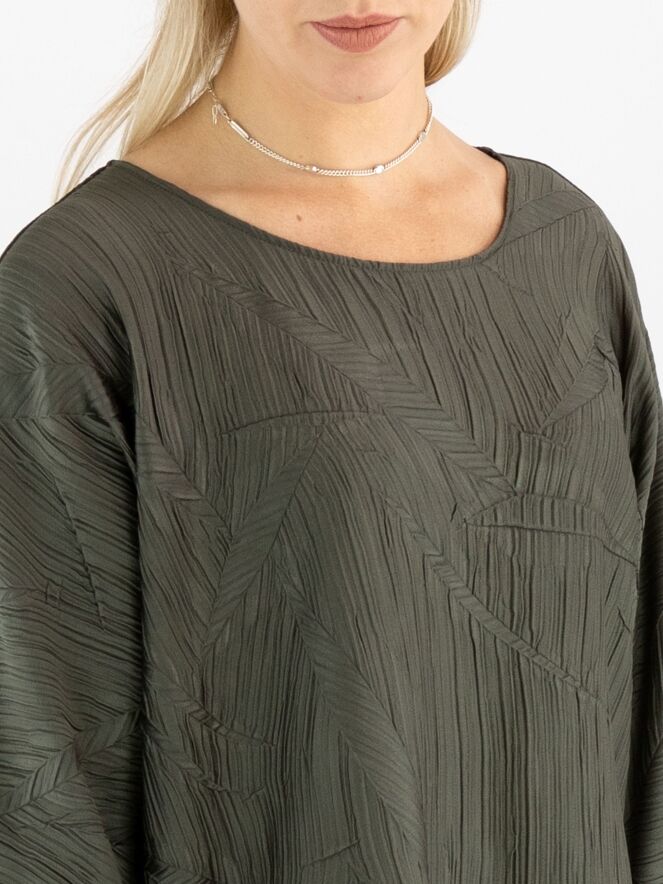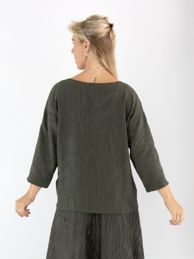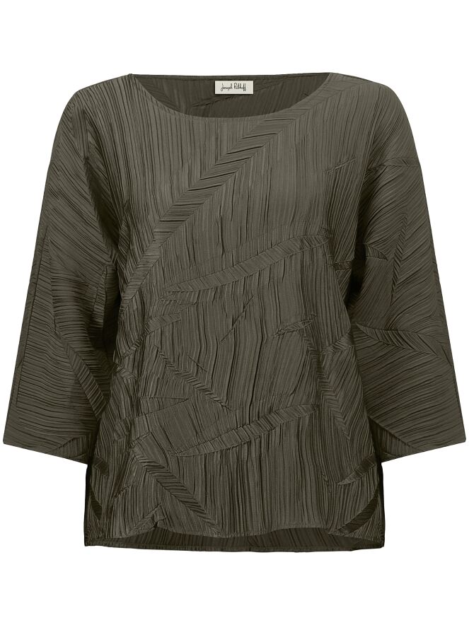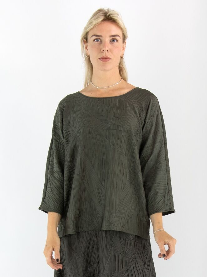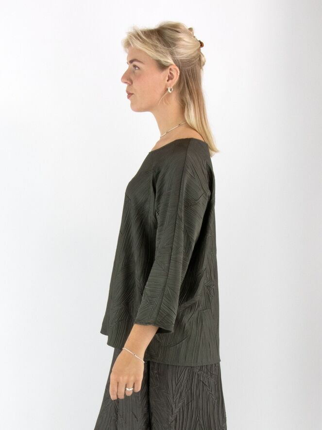 Un haut de Joseph Ribkoff en vert olive. Le tissu est finement plissé dans un motif en forme de feuille. Le haut présente une encolure ronde et des manches mi-longues. Ce haut doit être lavé à la main.