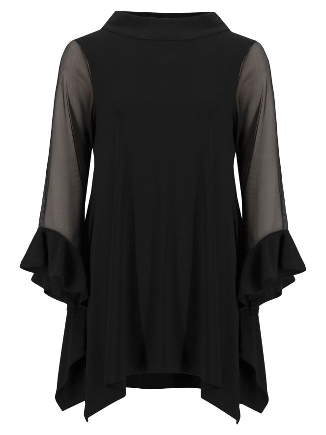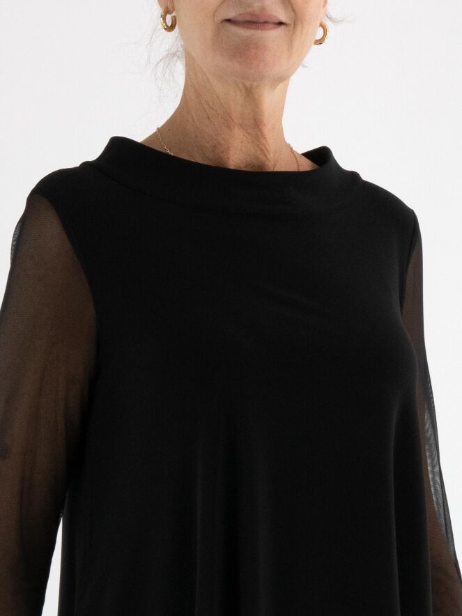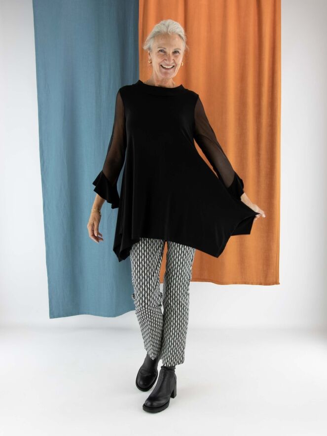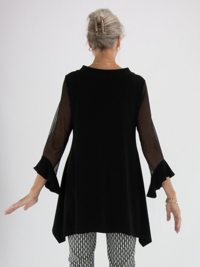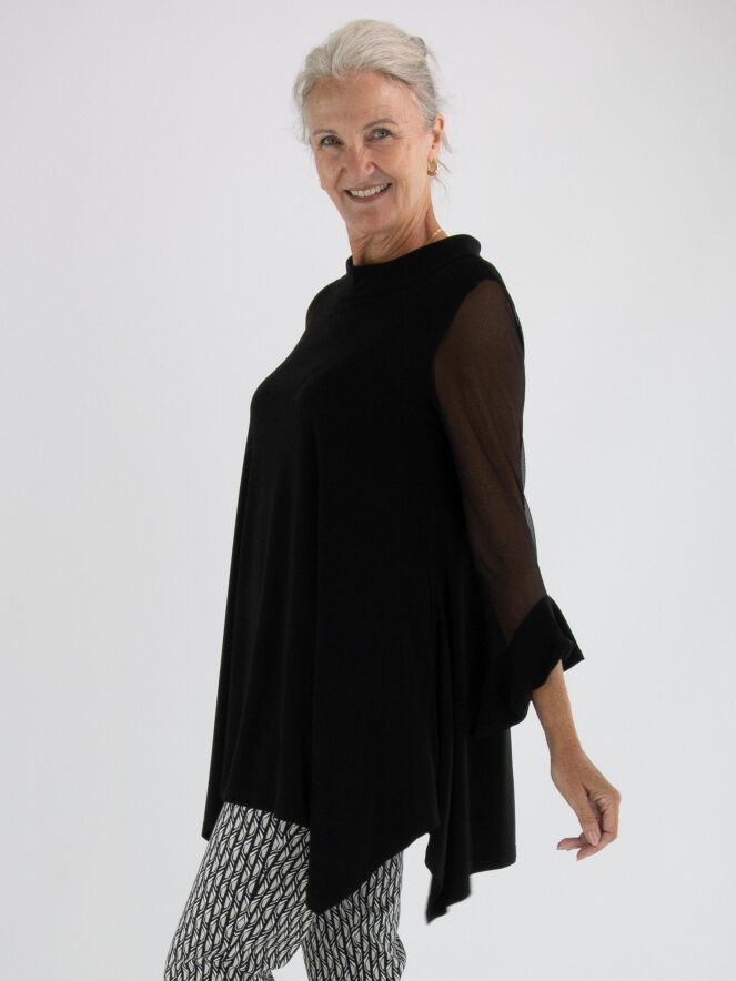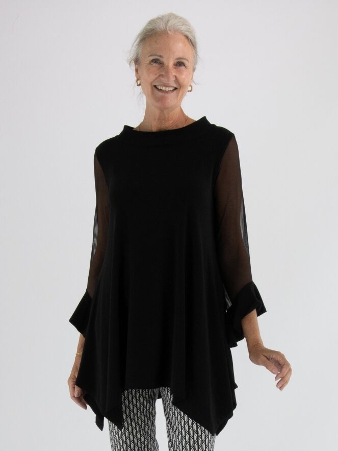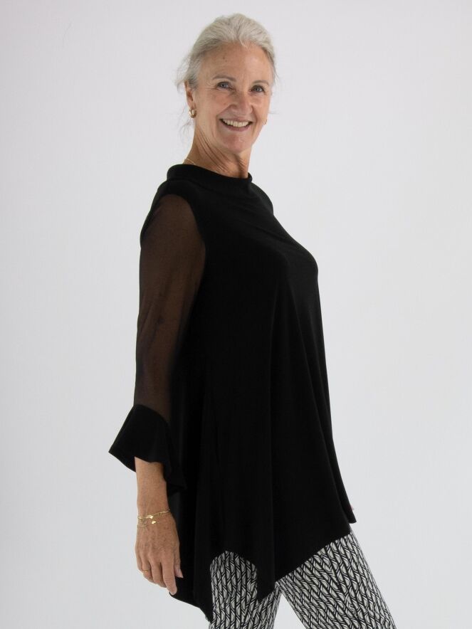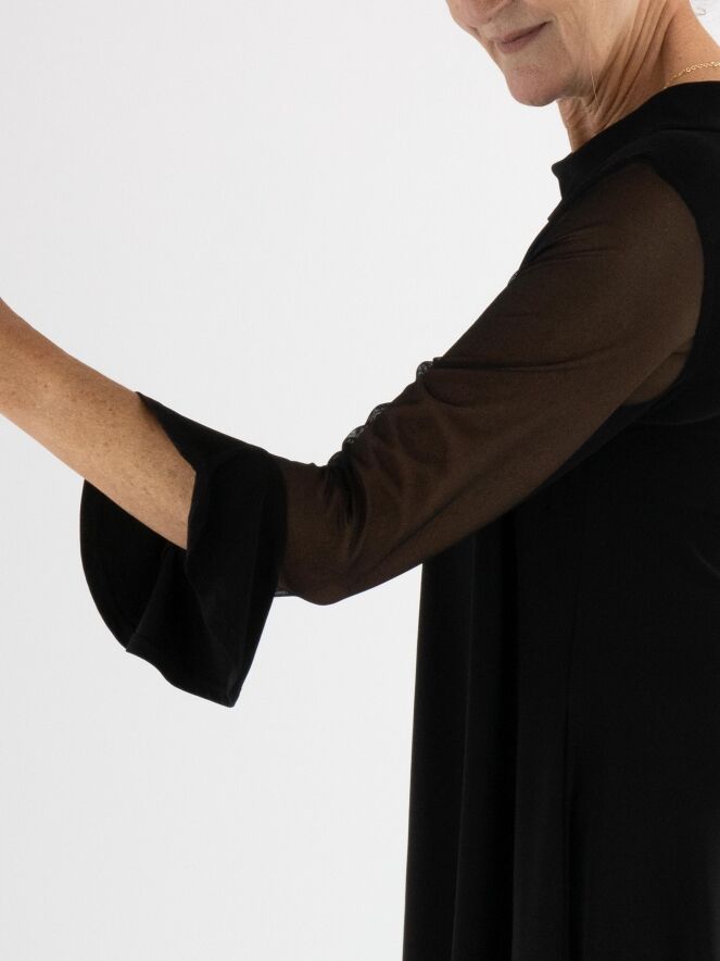 Un haut noir de Joseph Ribkoff. Ce haut a une coupe évasée et des manches longues transparentes avec des poignets larges aux extrémités. L’encolure ronde est bordée d’un large parement. Ce haut doit être lavé à la main.