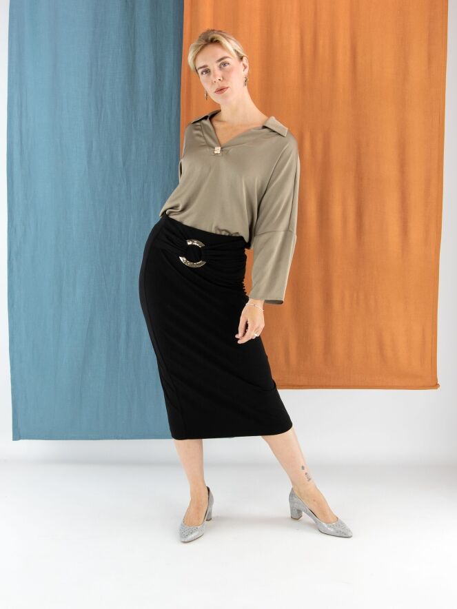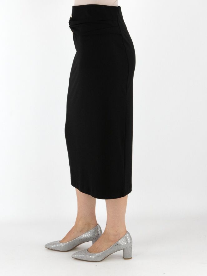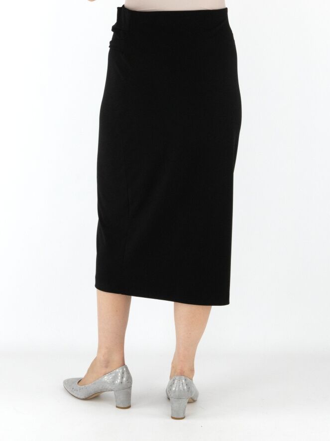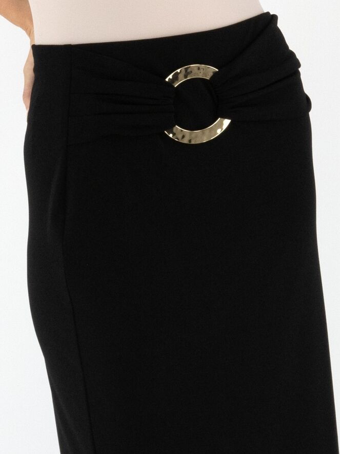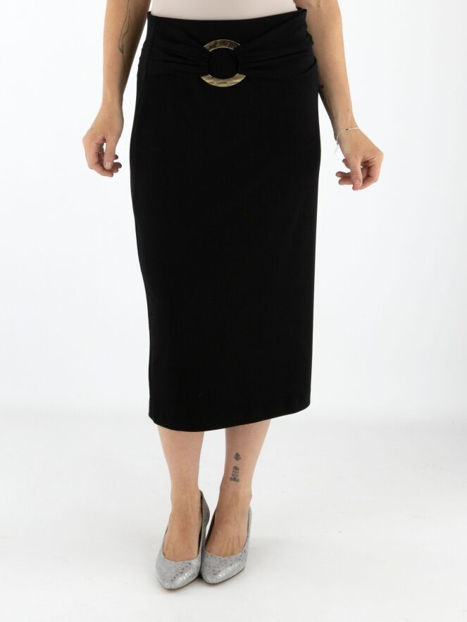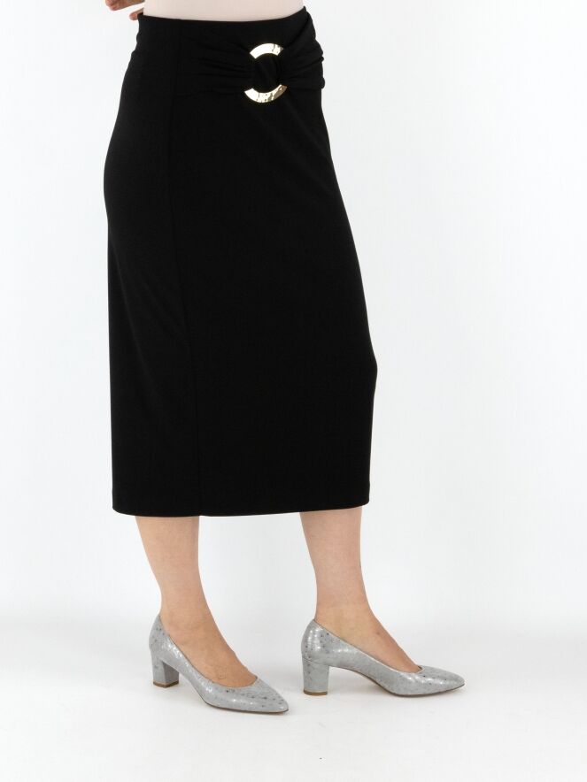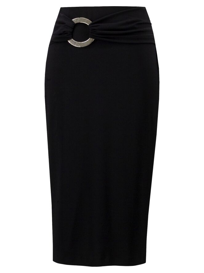 Une jupe droite de Joseph Ribkoff en noir. La taille est dotée d’une large ceinture élastique. Un tissu plissé recouvre l’avant de la taille avec, légèrement décentré à droite, une boucle décorative dorée. Cette jupe doit être lavée à la main.
