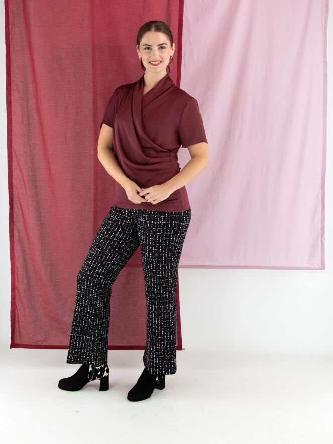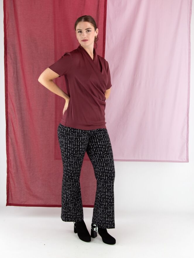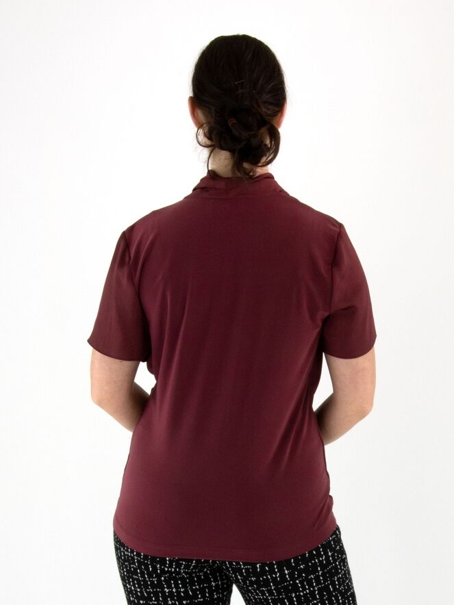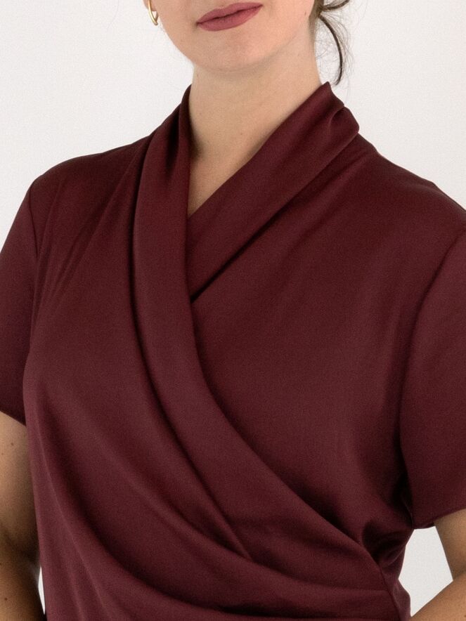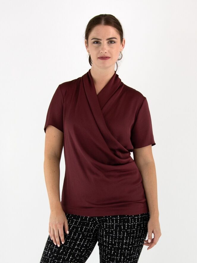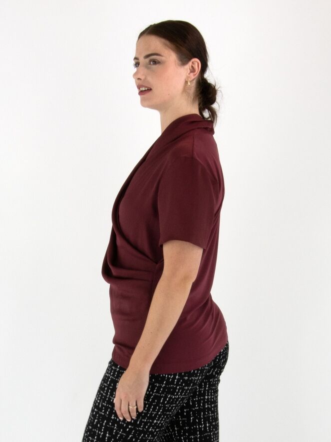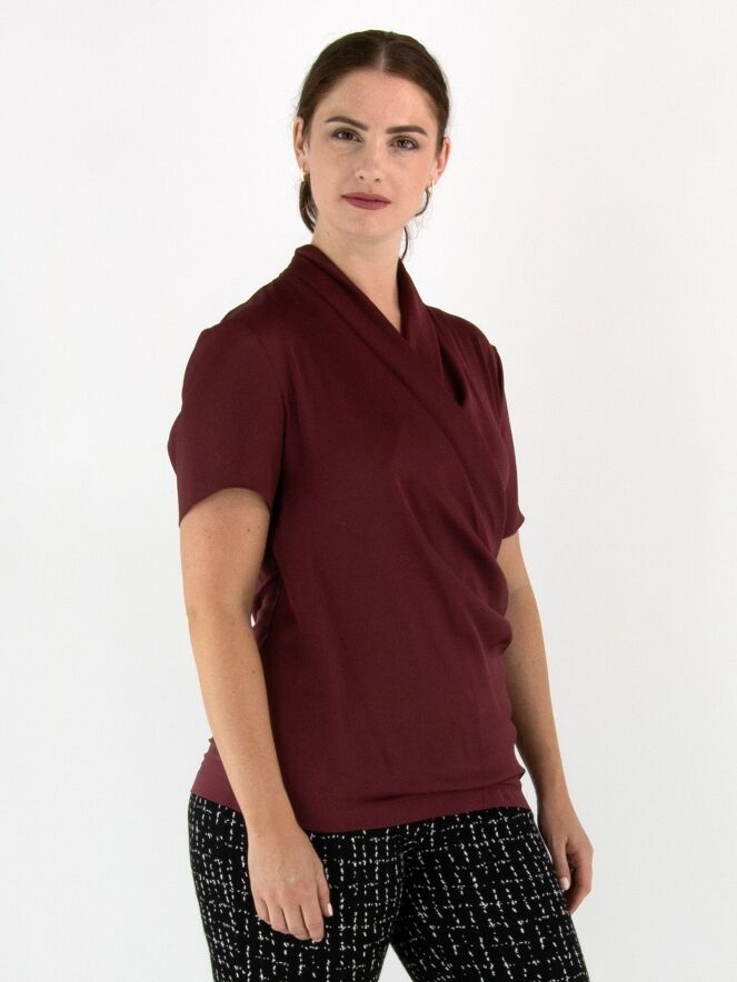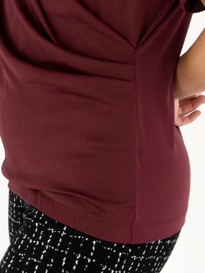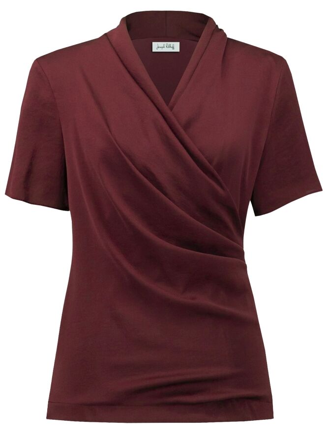 Top cache-cœur de Joseph Ribkoff dans une teinte rouge aubergine. Le drapé est maintenu par plusieurs plis sur le côté gauche de la taille, créant un effet fluide et élégant. Le haut a des manches courtes et se lave à la main.