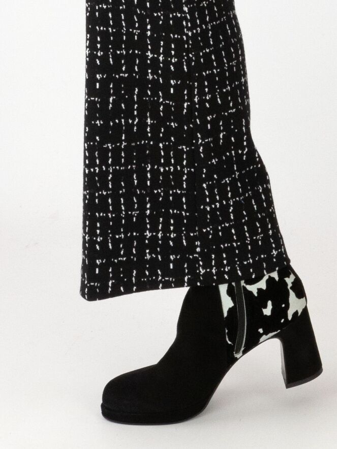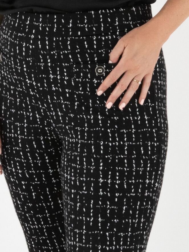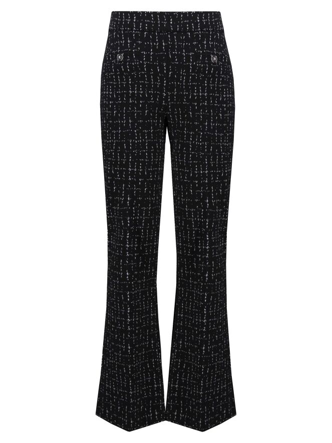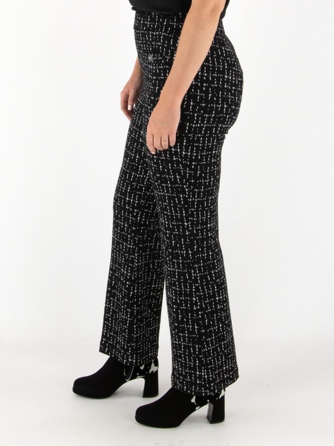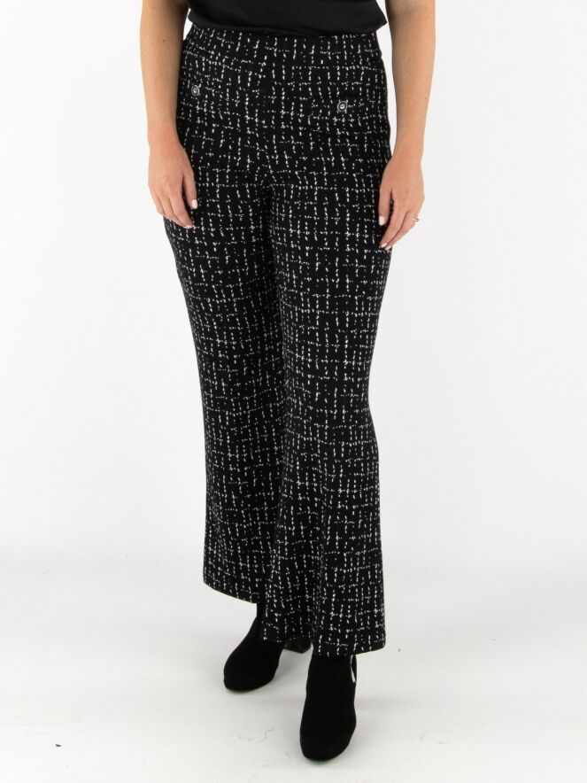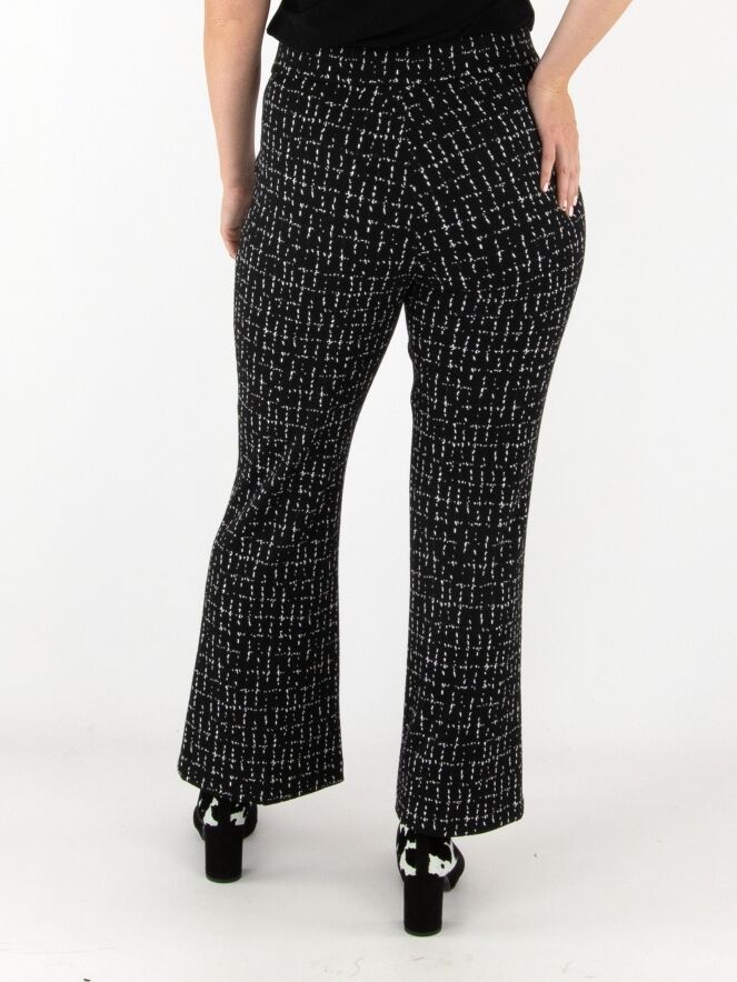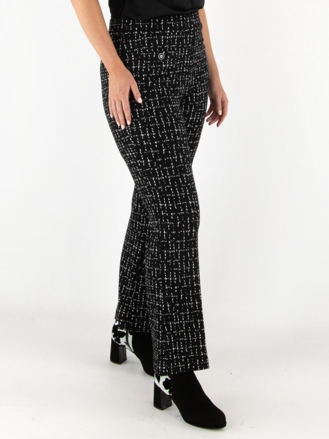 Un pantalon évasé de Joseph Ribkoff avec un imprimé graphique en noir et blanc. La taille est élastique. Ce pantalon doit être lavé à la main.