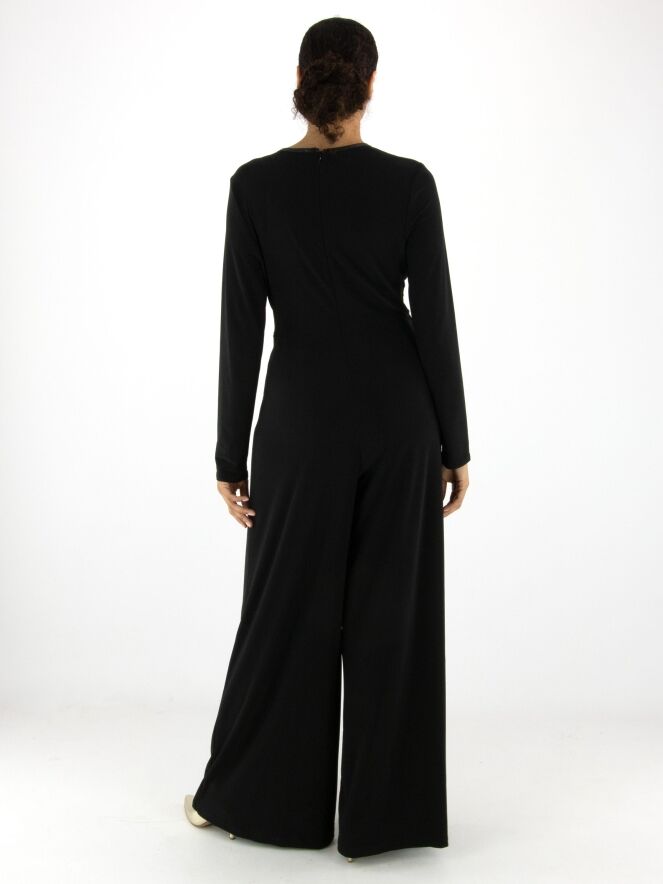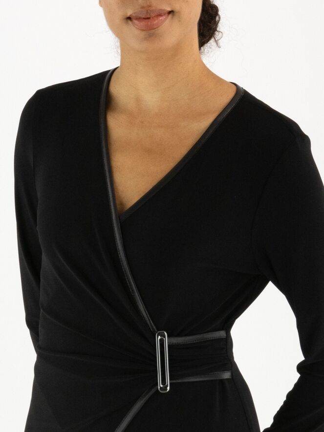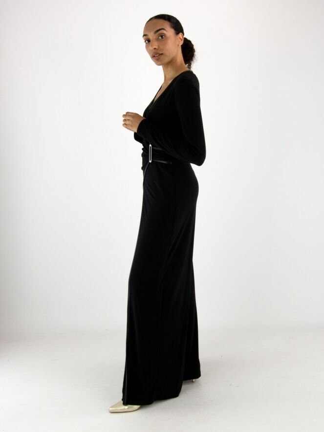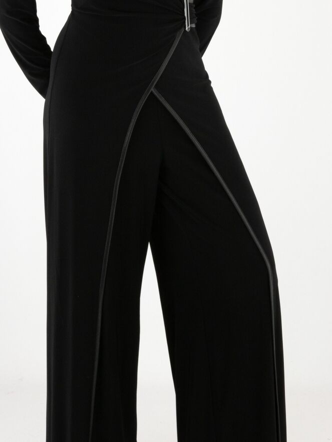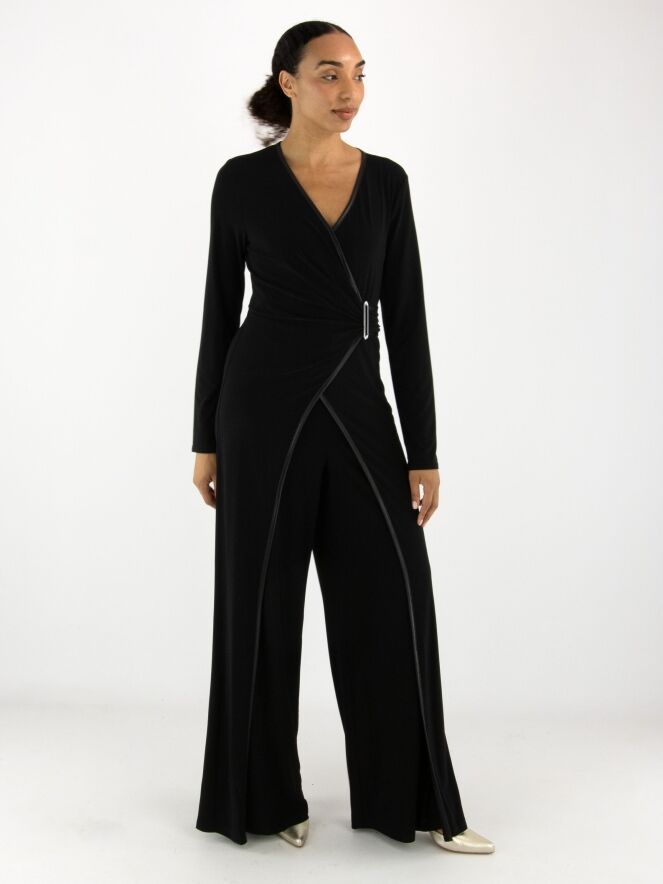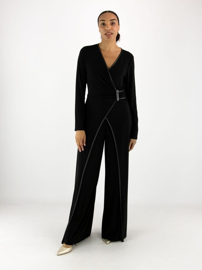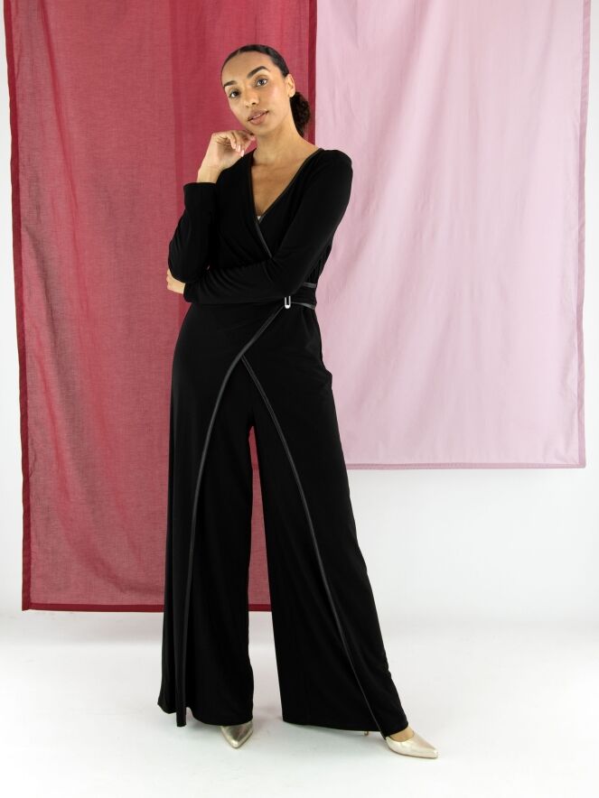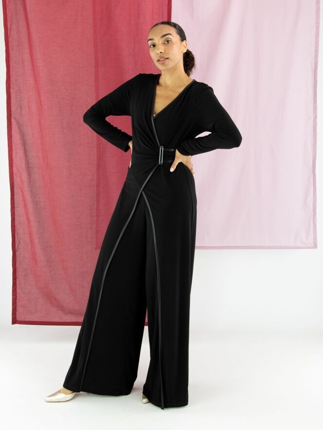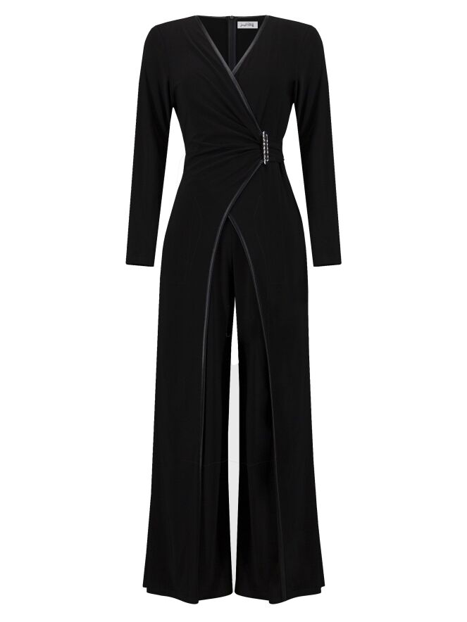 Combinaison portefeuille de Joseph Ribkoff en noir. Un passepoil en similicuir longe l’encolure jusqu’en bas. À la taille se trouve une fine boucle rectangulaire. Cette combinaison se lave à la main.