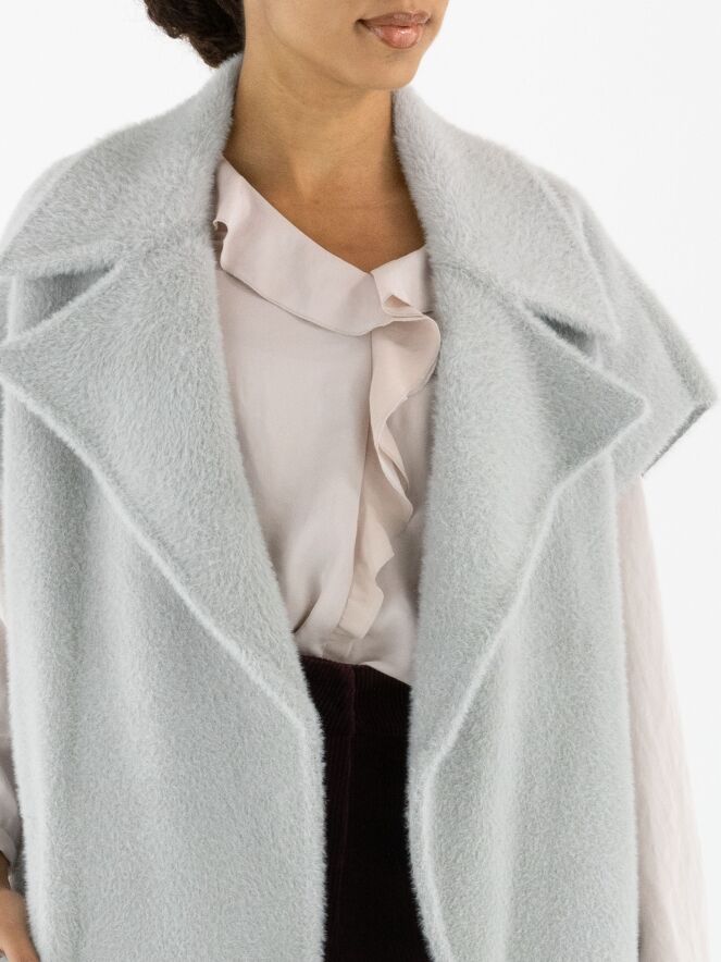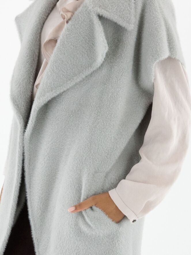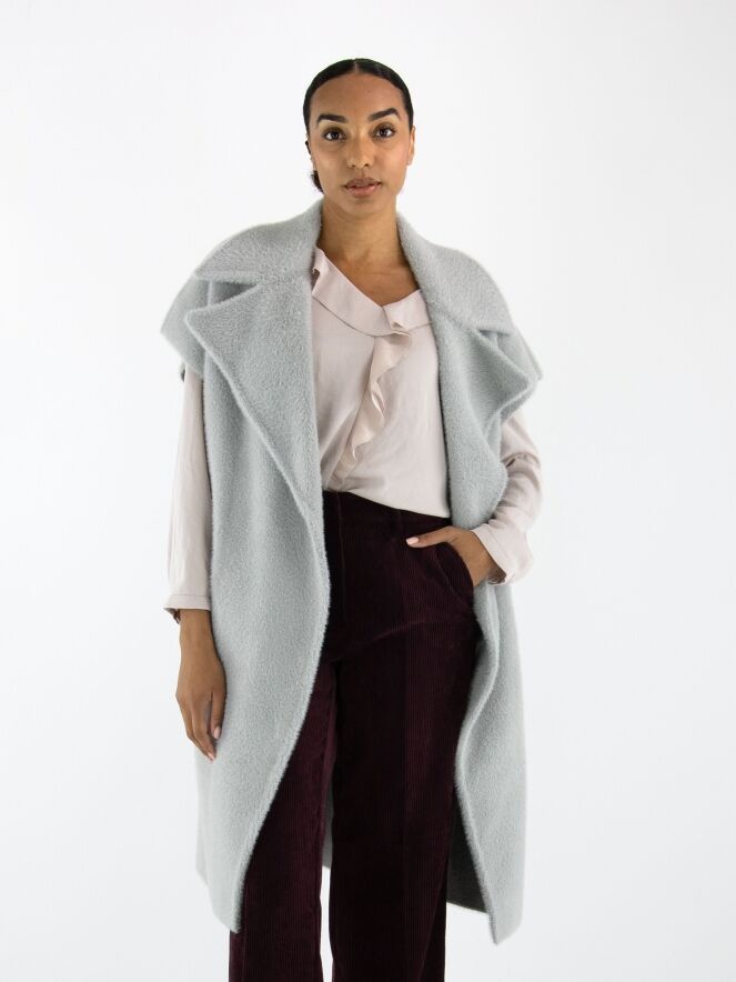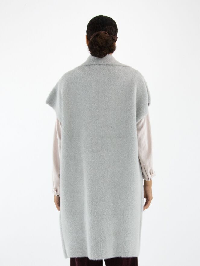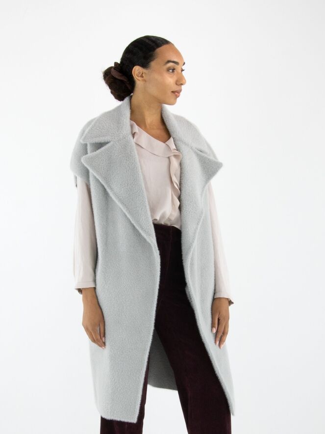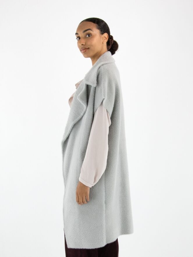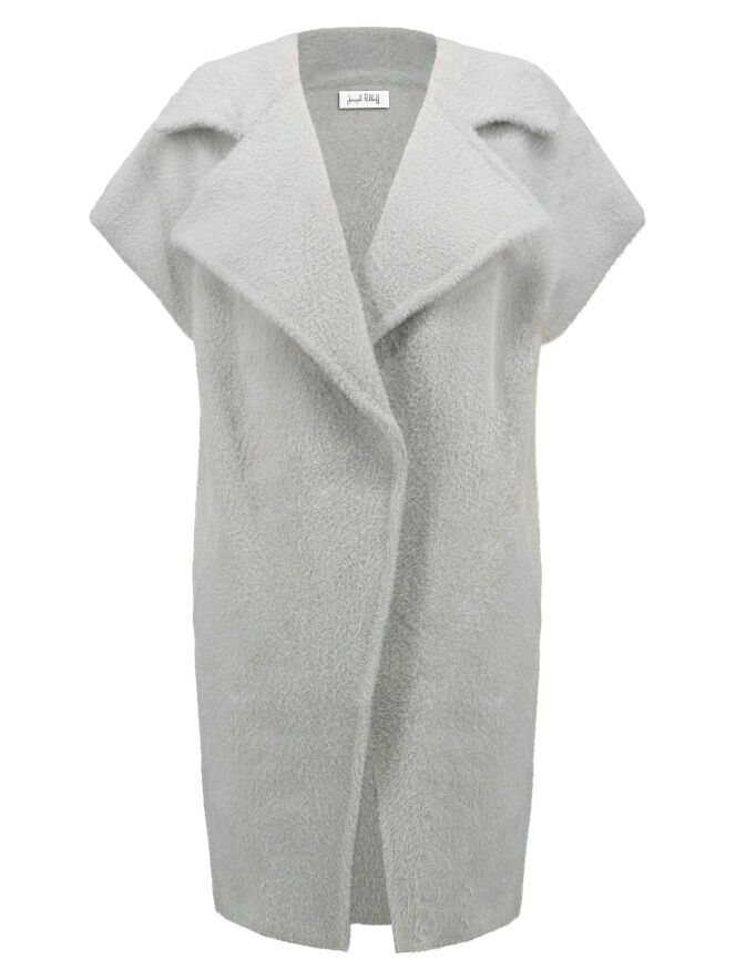 Un gilet mi-long de Joseph Ribkoff en gris clair. Il présente un large col et ne possède pas de fermeture. Des poches fendues se trouvent au niveau de la taille. Ce gilet doit être lavé à la main.