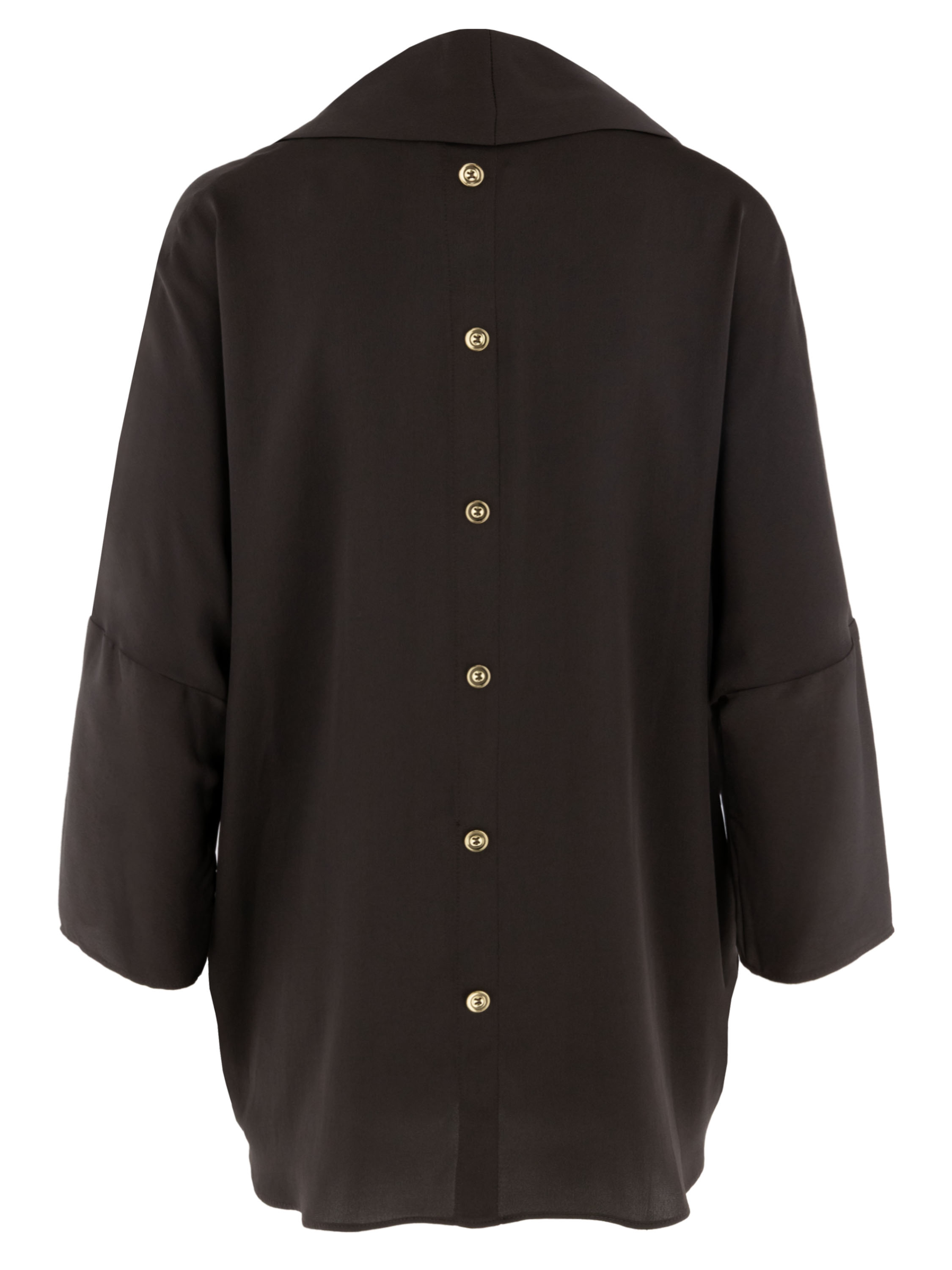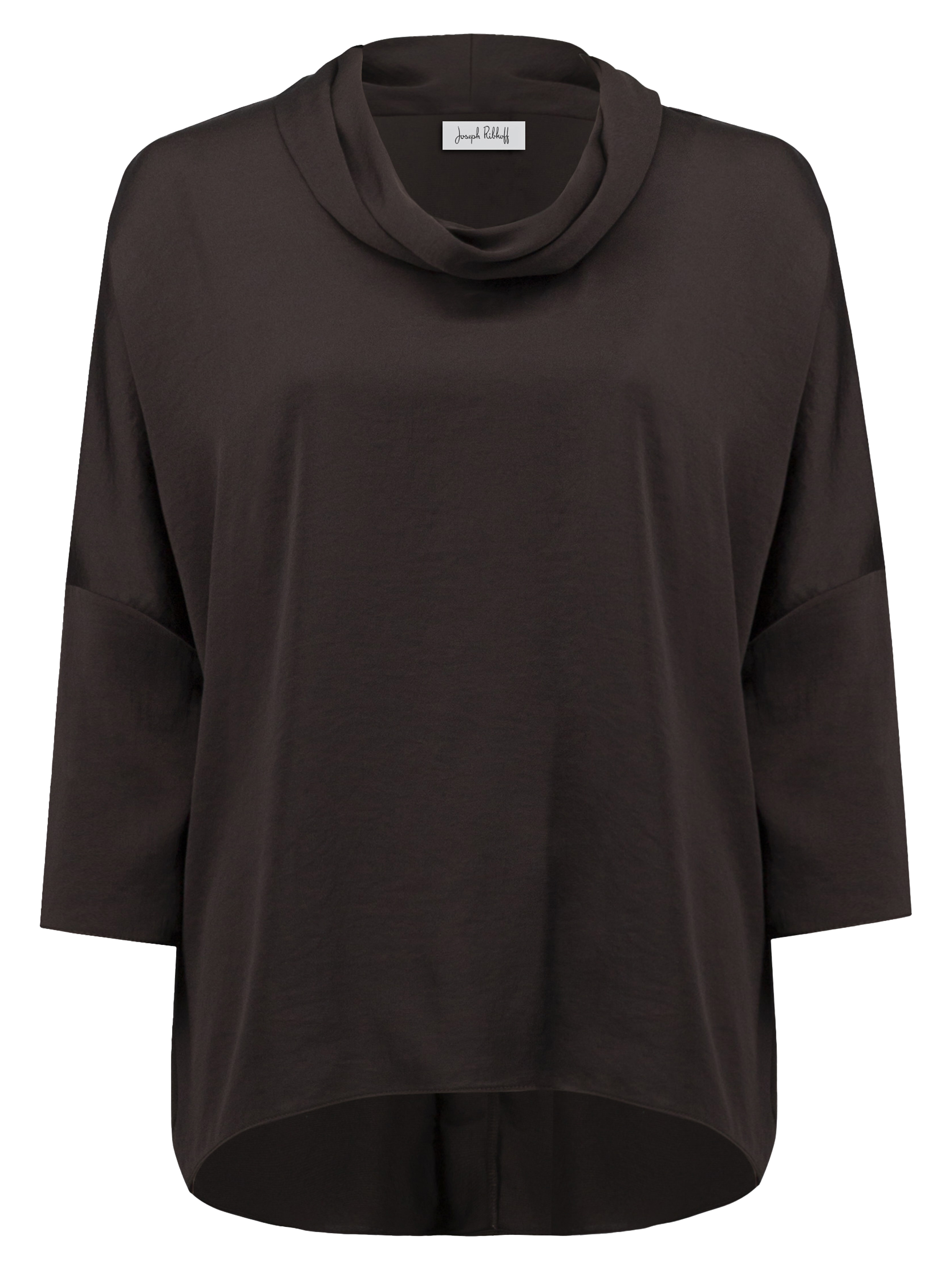 Un shirt en satin mat de Joseph Ribkoff en brun moka. Il présente un col drapé élégant et des manches mi-longues, offrant une allure féminine et raffinée. Ce shirt peut être lavé à la main.