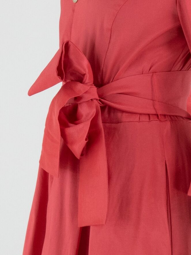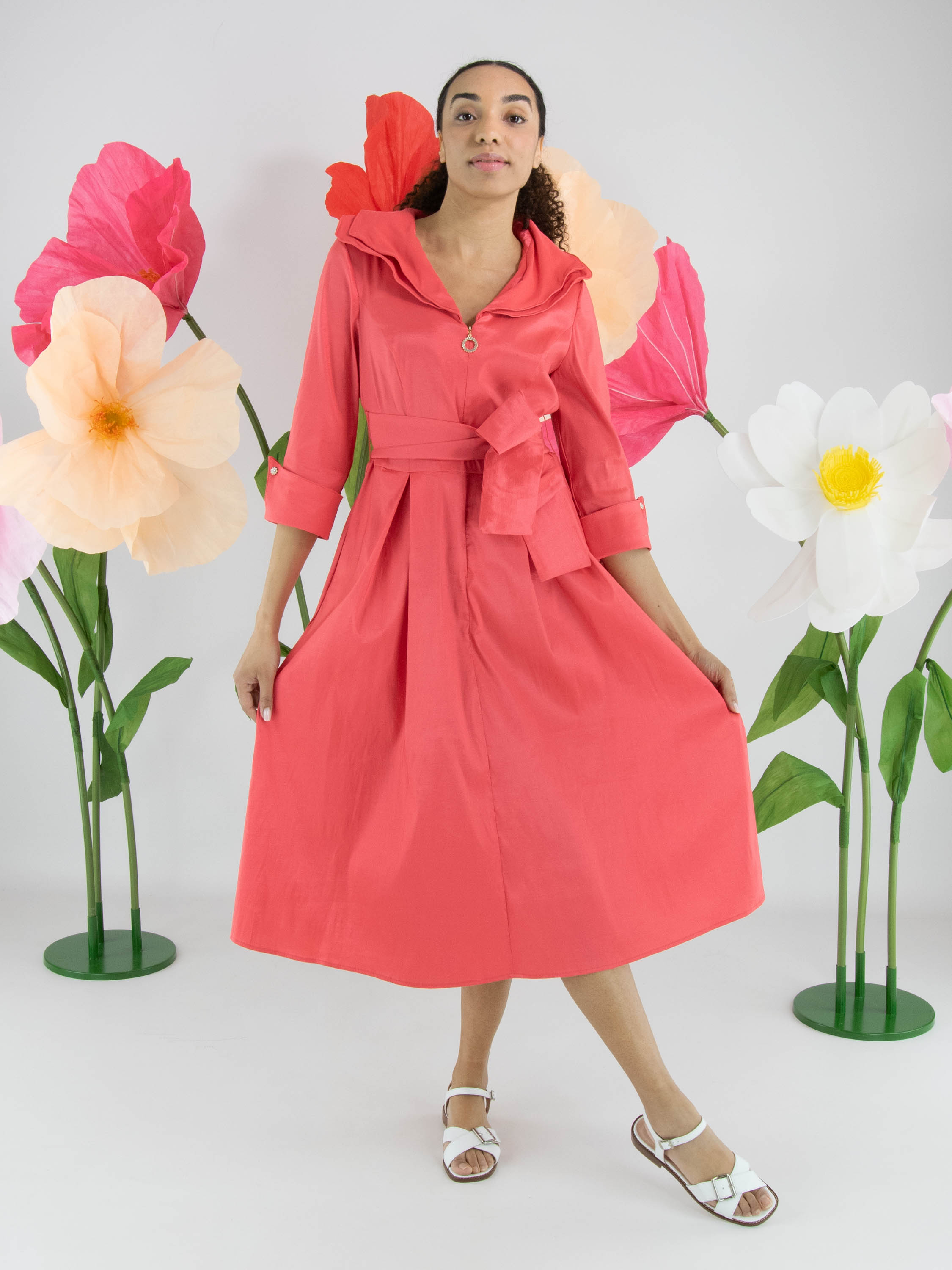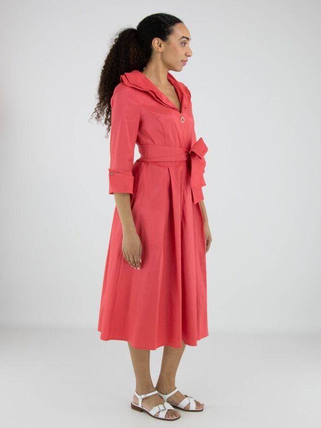 Robe de Joseph Ribkoff en satin mat dans une teinte corail éclatante. Le bord du col double intègre un fil flexible permettant de modeler le col selon la forme souhaitée pour une allure personnalisée et affirmée. Les manches mi-longues sont terminées par de larges poignets retournés ornés de boutons imitation diamants, apportant une touche raffinée et luxueuse. Une large ceinture à la taille permet de nouer un élégant nœud décoratif. Plusieurs plis à la taille créent un effet ondulant et fluide vers le bas. Cette robe de créateur exclusive doit être lavée à la main.