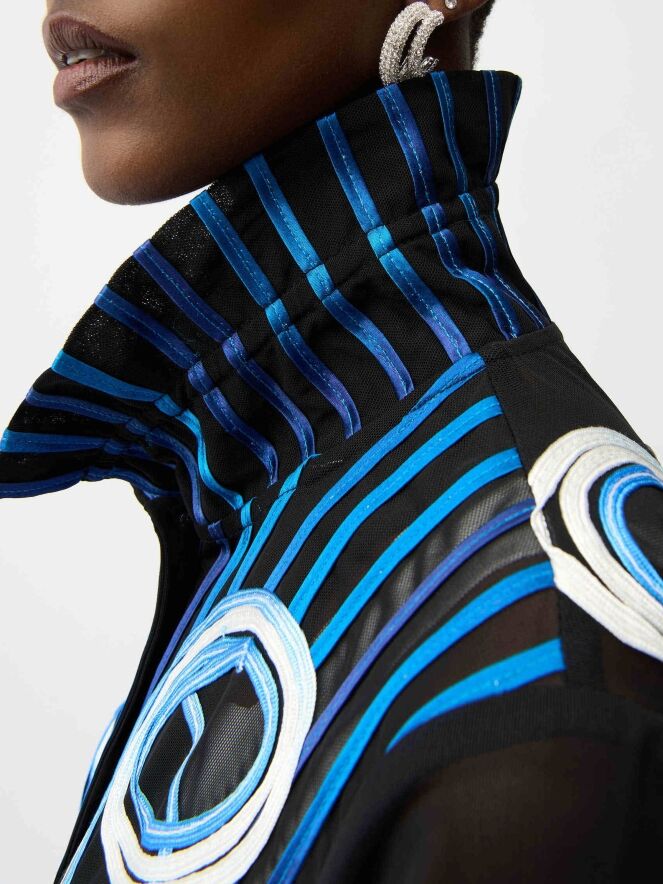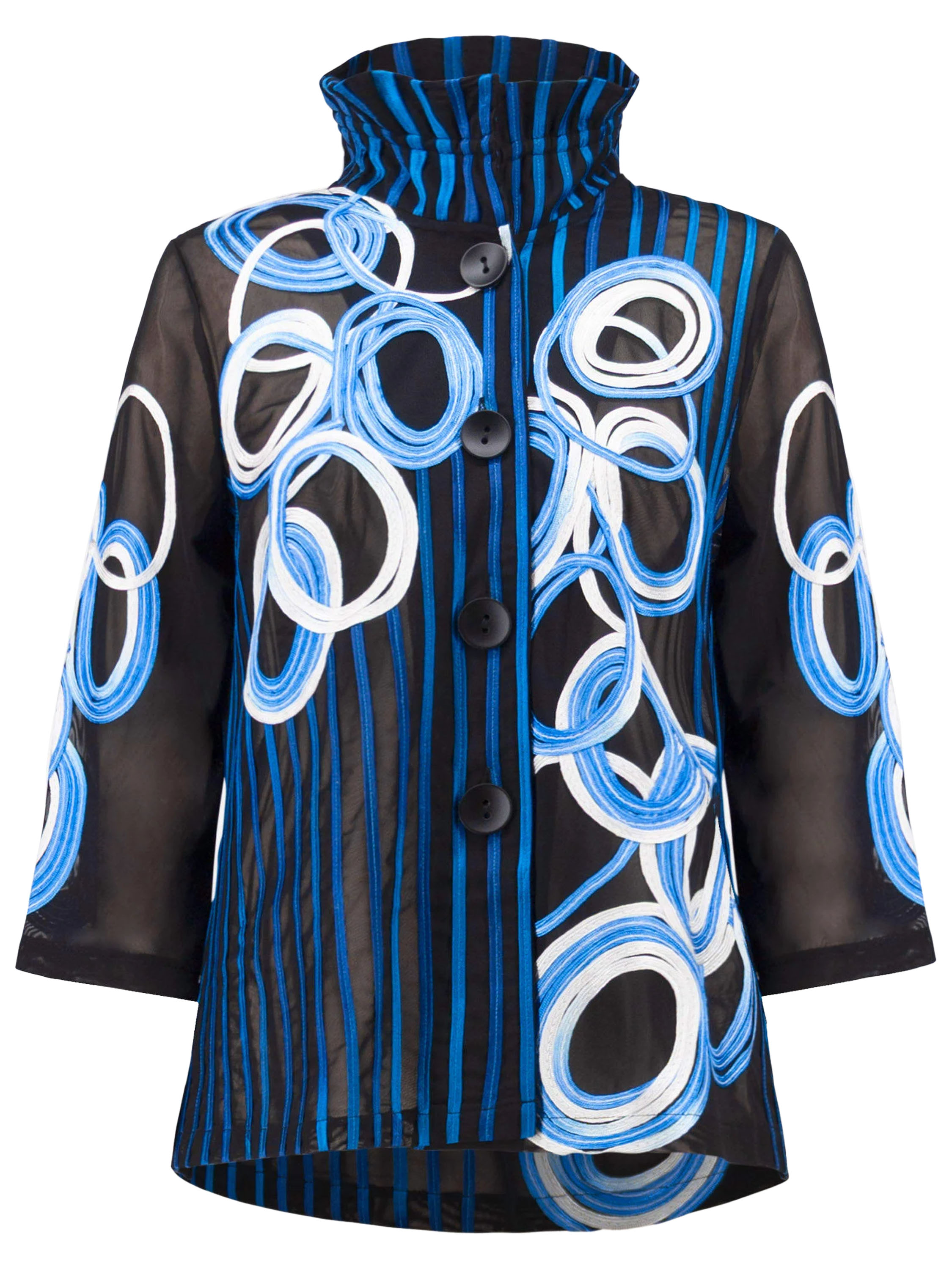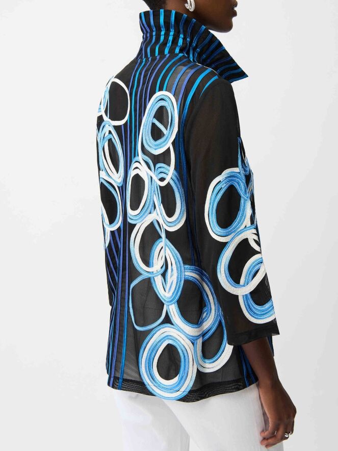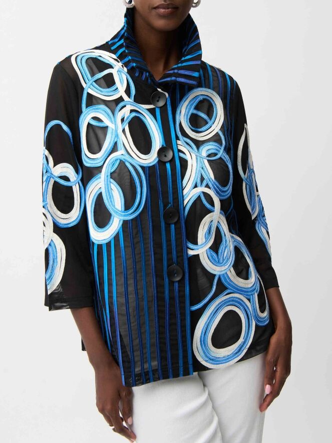 Un blazer légèrement transparent de Joseph Ribkoff avec un motif de lignes verticales et de lignes circulaires dans plusieurs nuances de bleu et de blanc sur fond noir. Le blazer est doté d’une fermeture à deux boutons et de manches mi-longues. Ce blazer peut être lavé à la main.