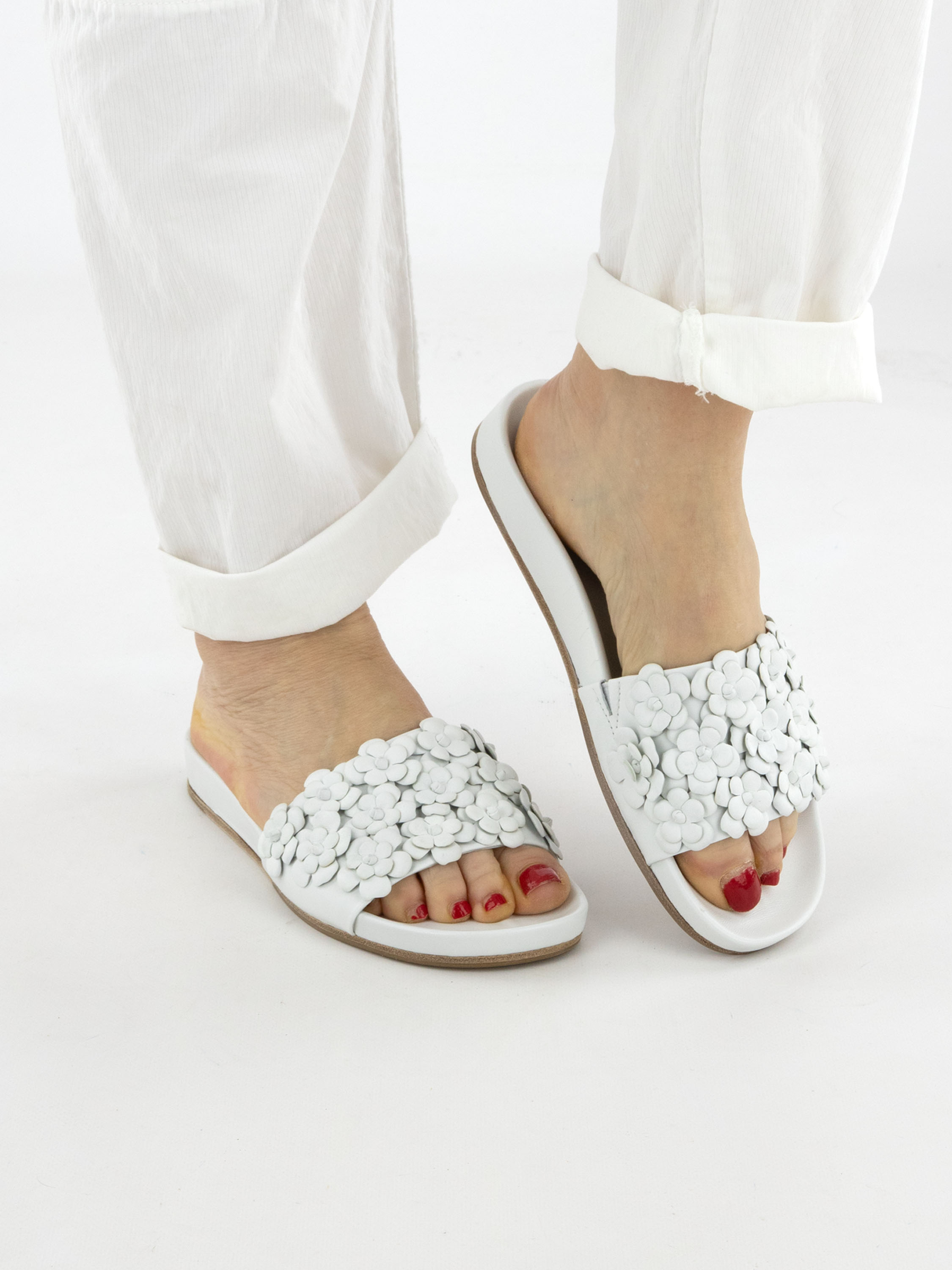 Sandale de Kennel & Schmenger dans une élégante teinte blanc crème. Une large bride sur l’avant du pied est ornée de délicates fleurs décoratives, apportant une touche féminine et estivale.