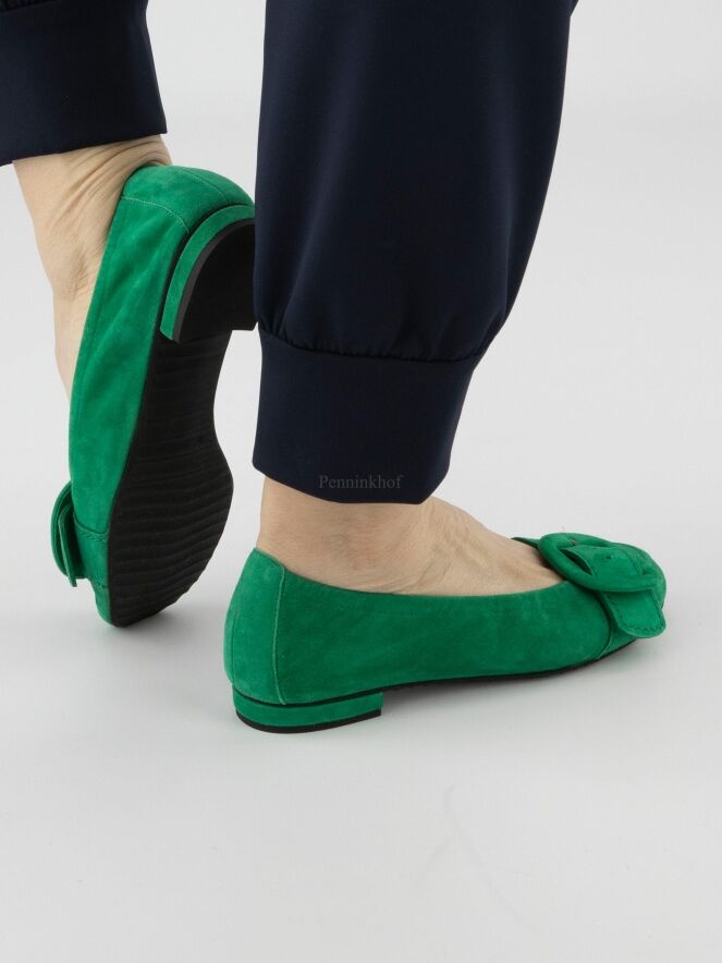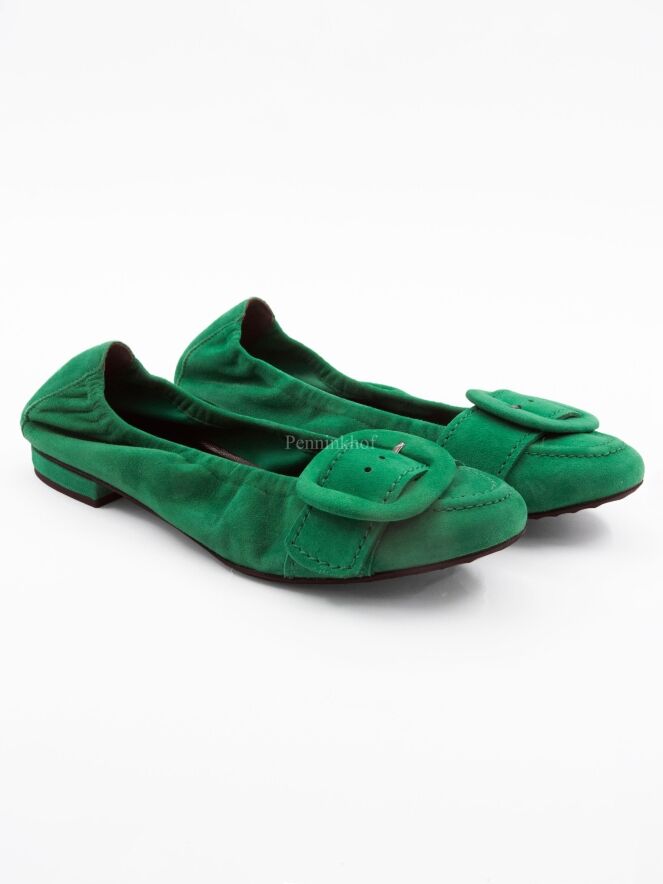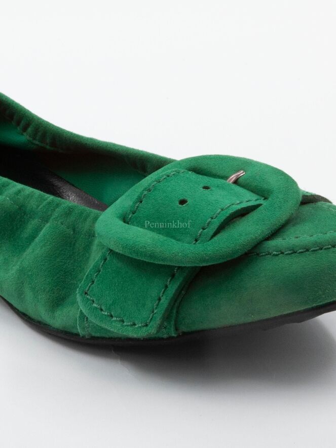 Ballerine de la marque Kennel & Schmenger, en daim camoscio vert émeraude. L'avant-pied est orné d'une boucle carrée en daim. Le bord de la tige est élastique.
