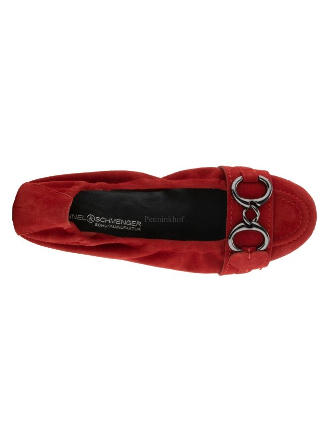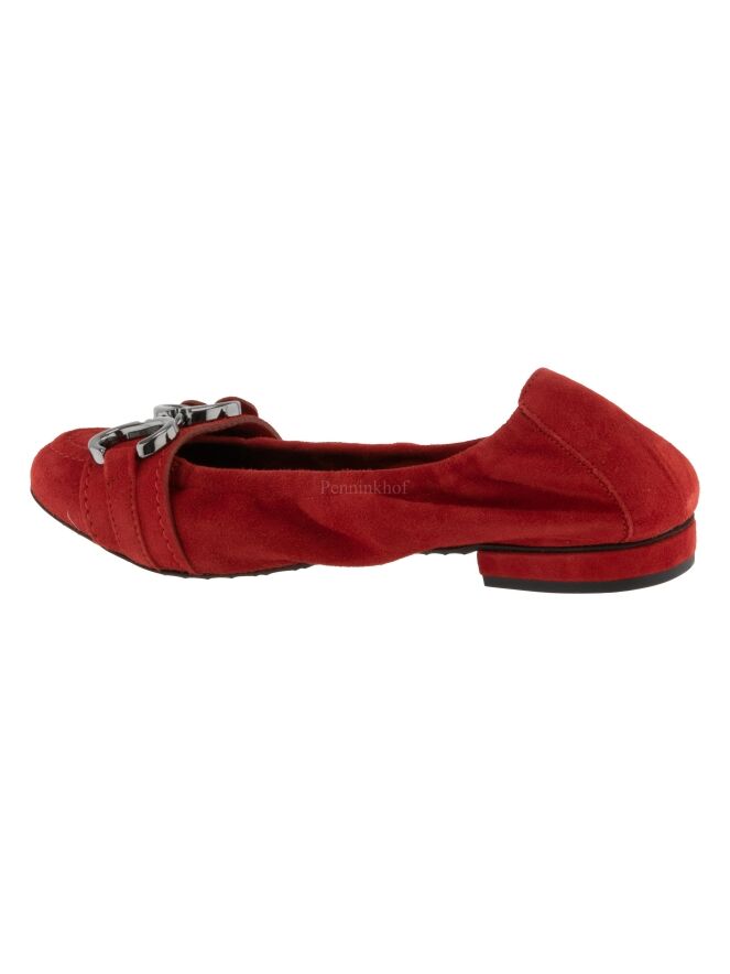 Ballerine de la marque Kennel & Schmenger, en daim camoscio rouge. L'avant-pied est orné d'une boucle métallique noire agémentée d'un cœur décoratif en daim. Le bord de la tige est élastique.