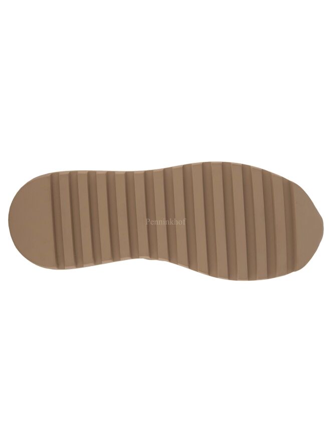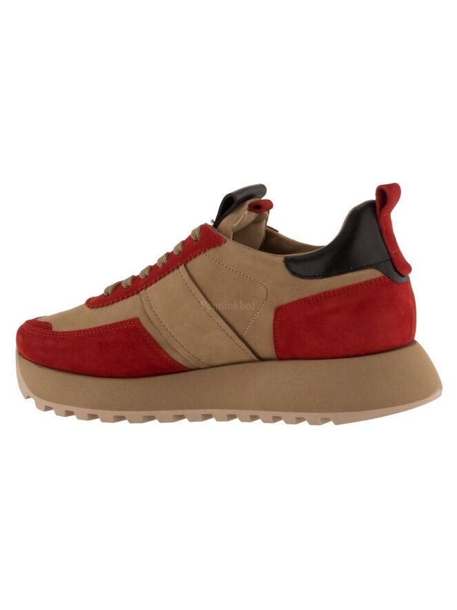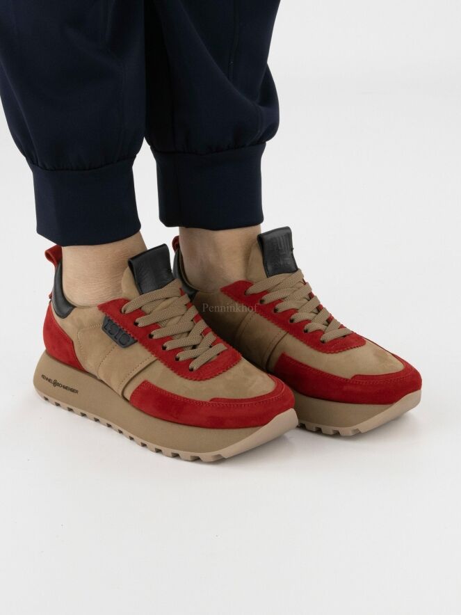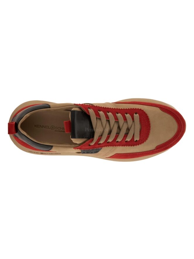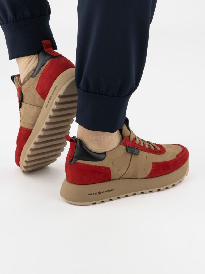 Chaussure de la marque Kennel & Schmenger, en daim camoscio rouge et chamois, dotée d'une semelle compensée crantée de couleur chamois. La languette et le talon sont en cuir noir.