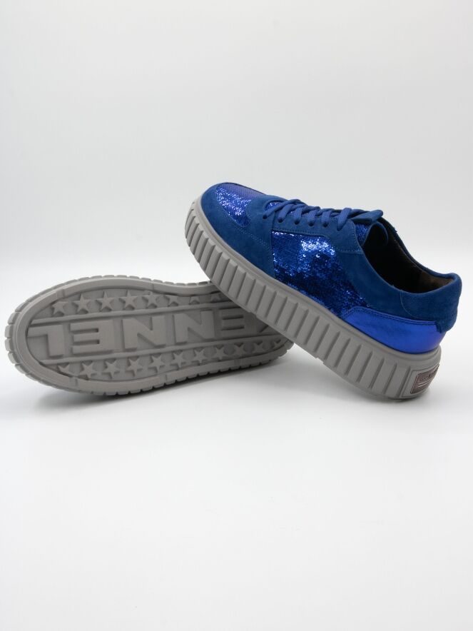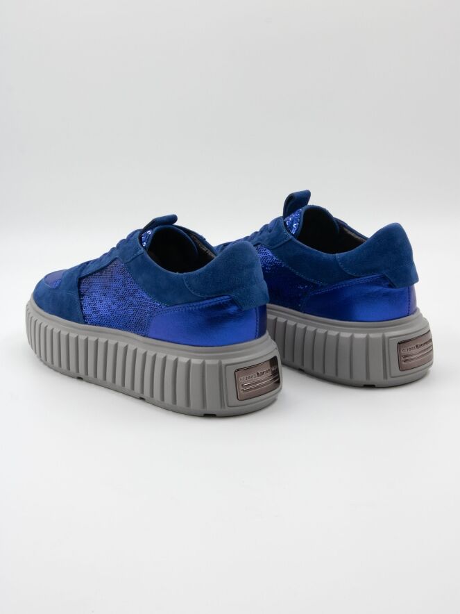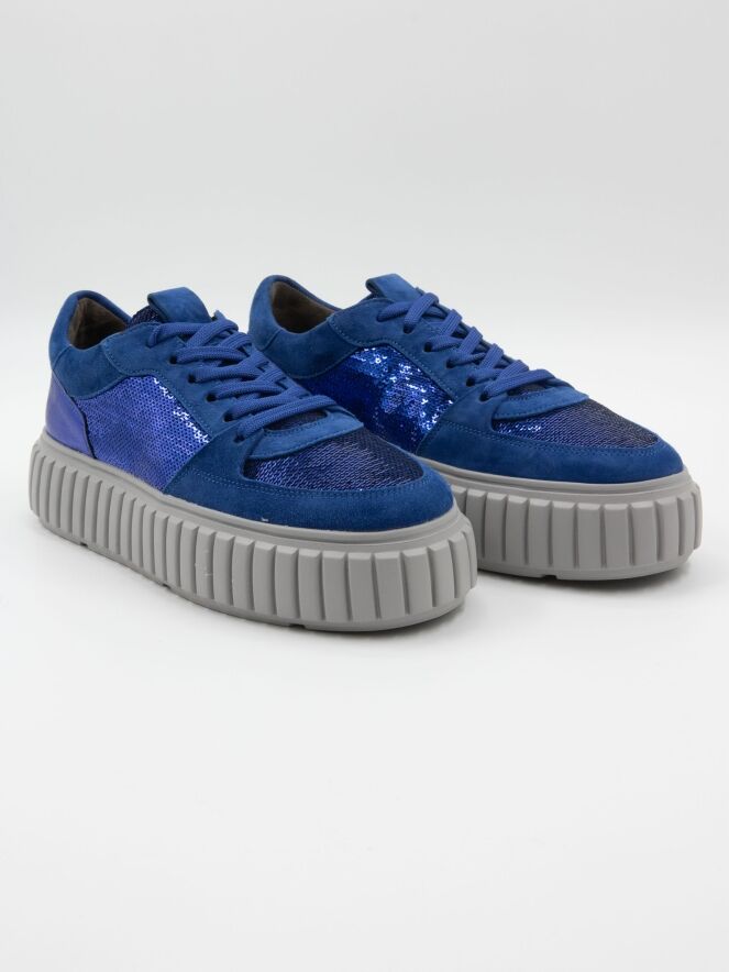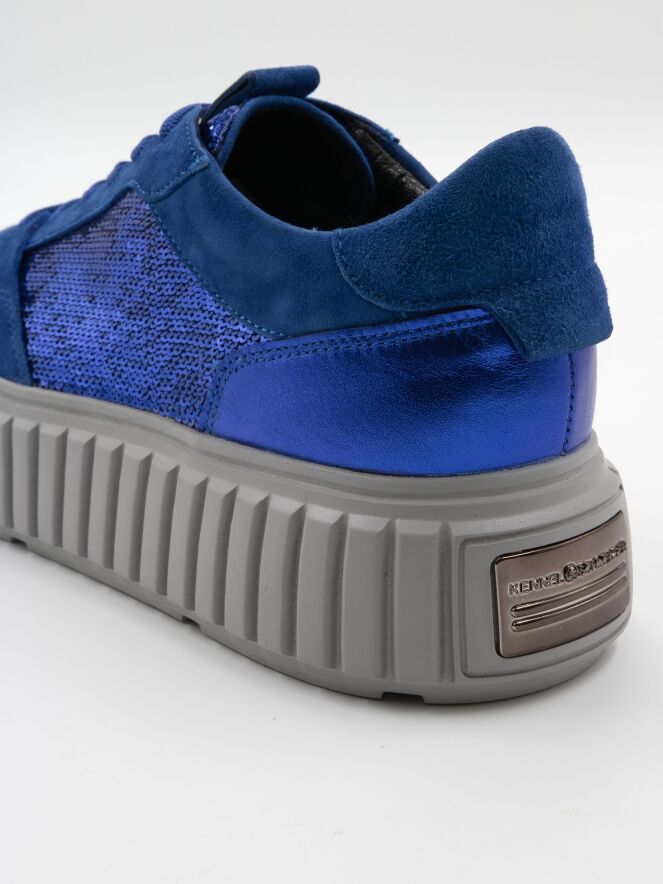 Chaussure de Kennel & Schmenger de couleur cobalt. Sur l'avant-pied et sur les côtés, la chaussure est bordée de paillettes argentées. La semelle compensée grise est dentelée.