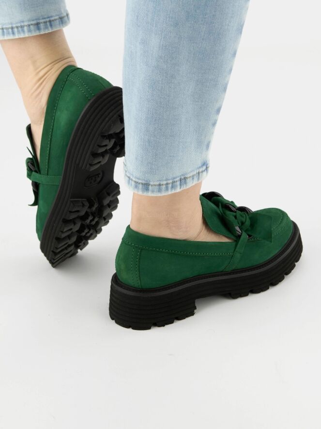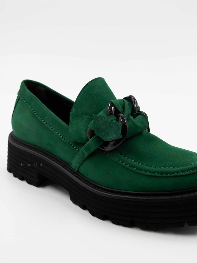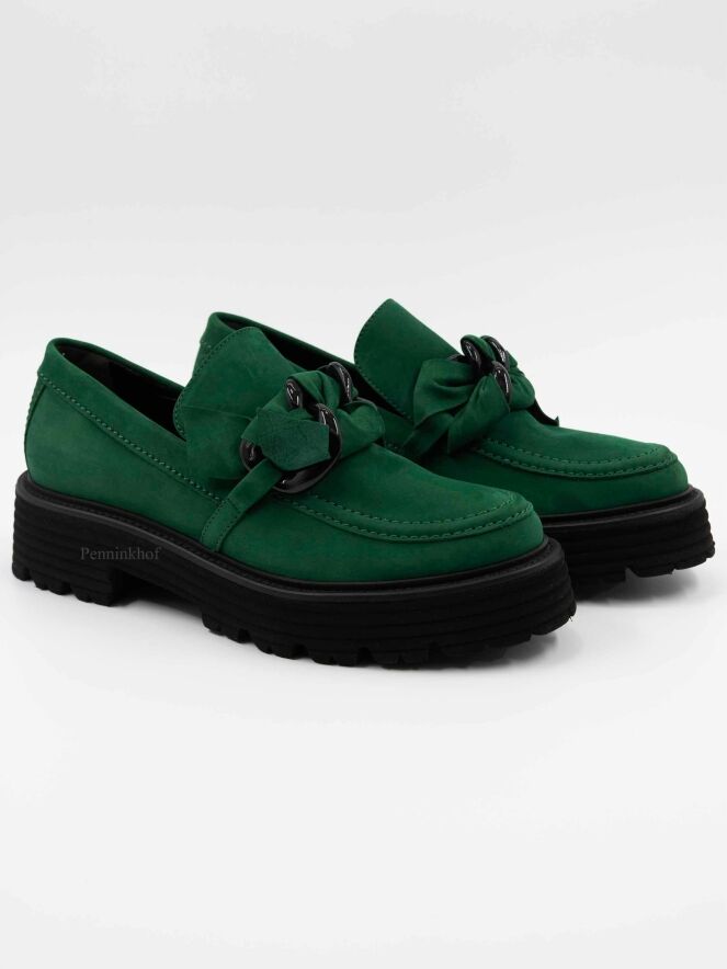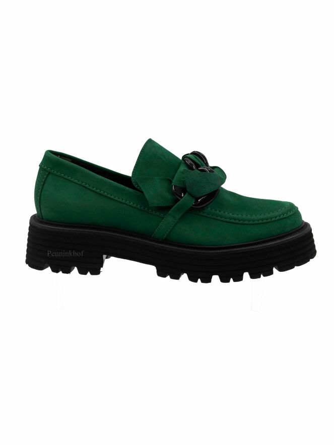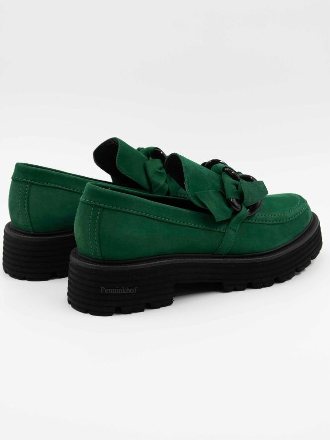 Une chaussure plate de Kennel & Schmenger en vert. Sur l'avant-pied se trouve une bride décorative nouée avec 2 boucles en vernis noir. La semelle nouée est de couleur noire.