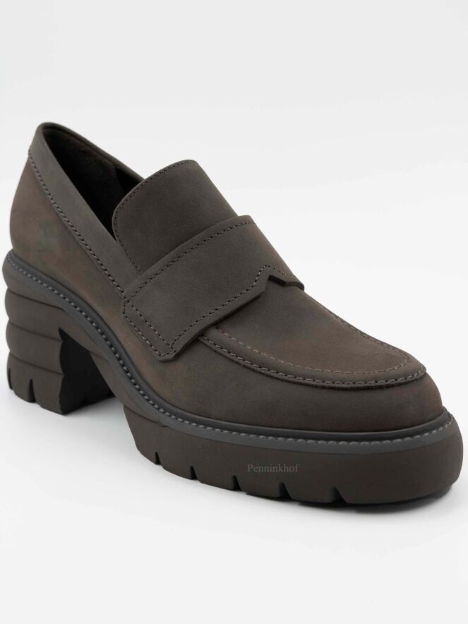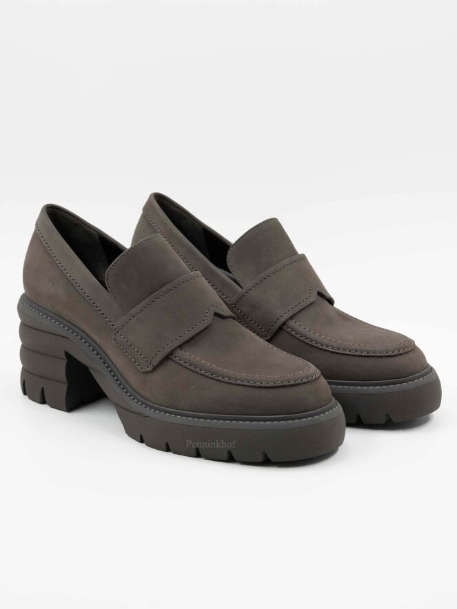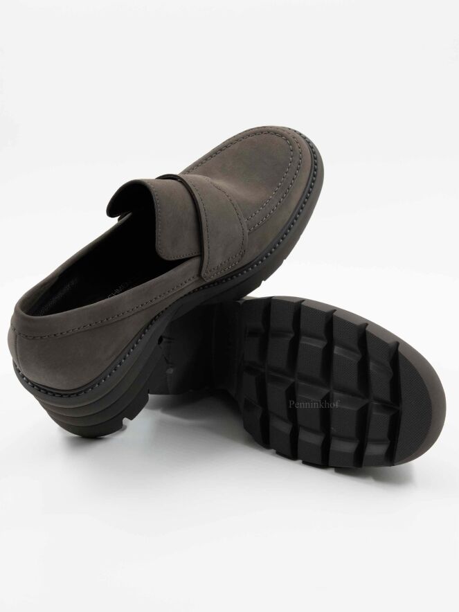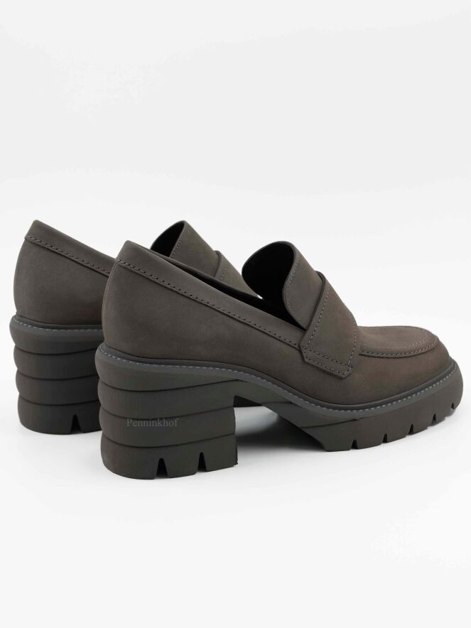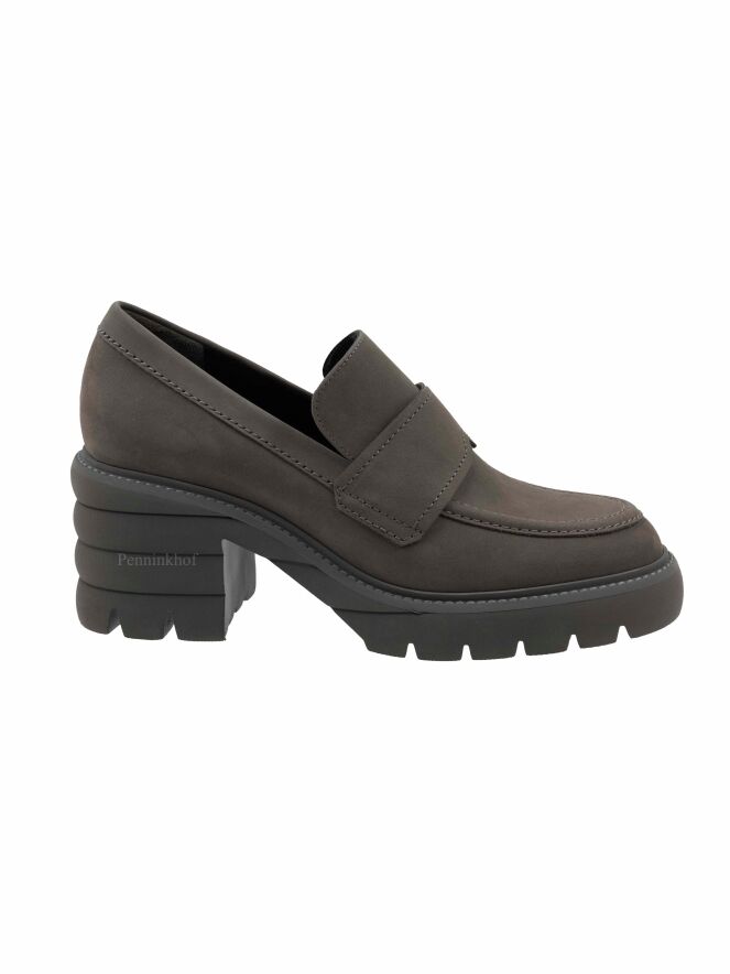Une chaussure plate de Kennel & Schmenger sur un talon bloc de couleur grise. Sur l'avant-pied se trouve une bride dans la même matière. La semelle grise est dentelée. L'intérieur est doublé de cuir.