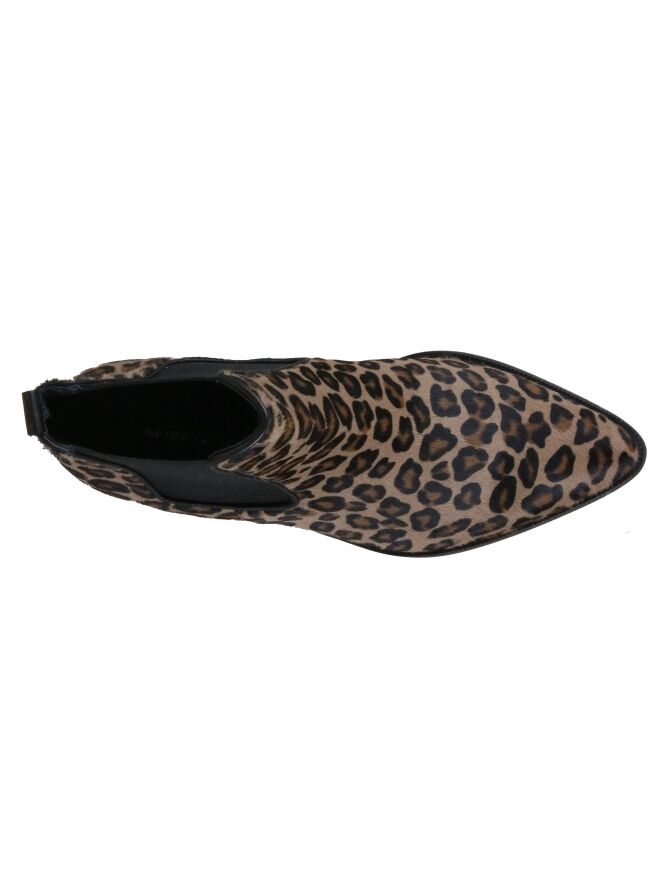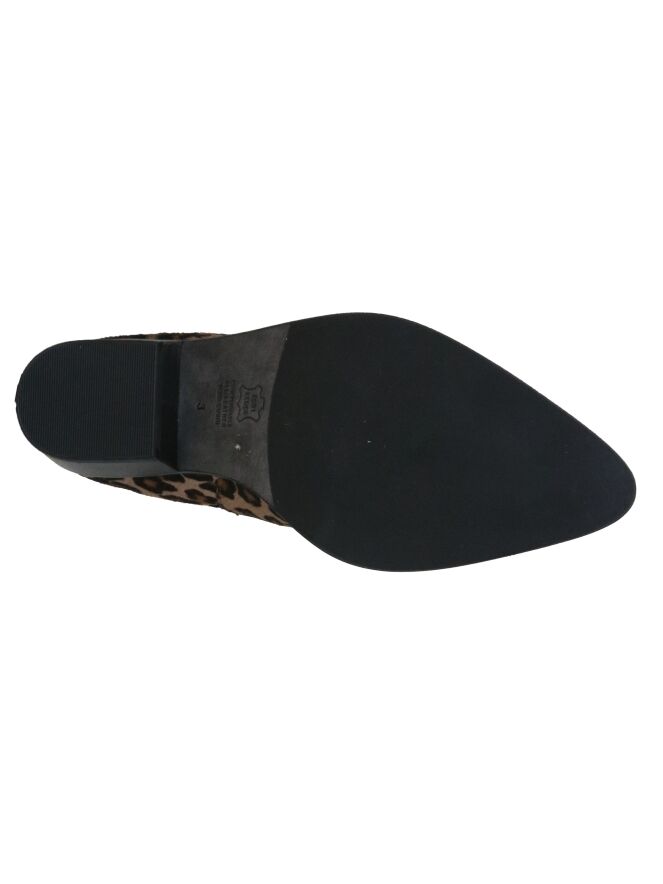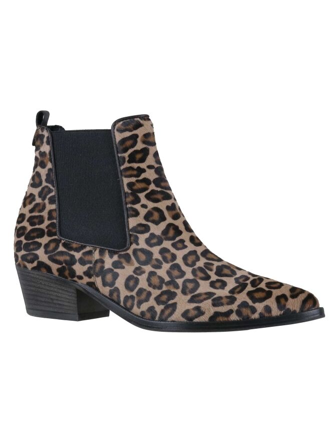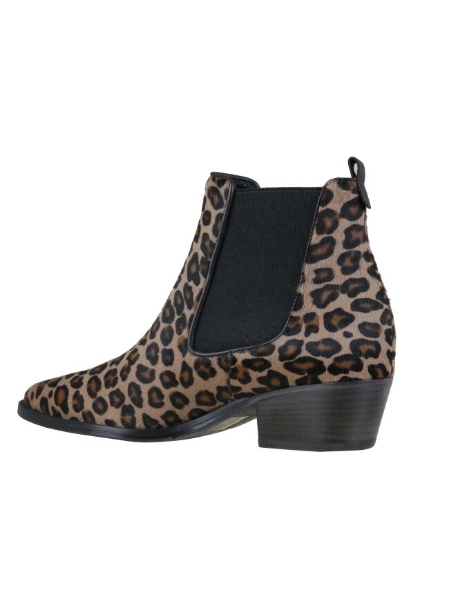 Bottine style western avec un nez pointu, de la marque Kennel & Schmenger, imprimée d'un motif léopard aux couleurs chamois, marron et noires. Une bande de tissu élastique noire de chaque côté assure le confort nécessaire pour la chausser. Intérieur doublé cuir.