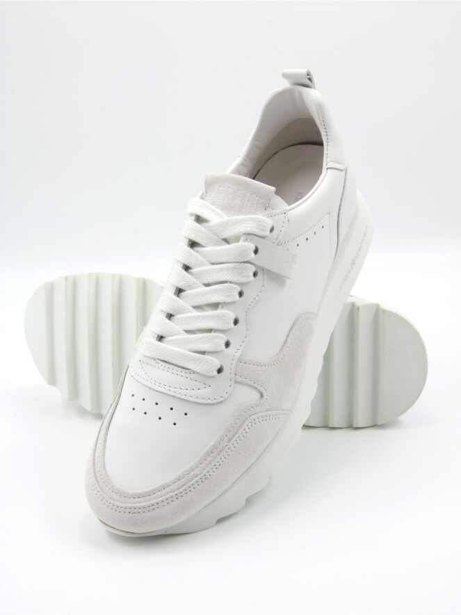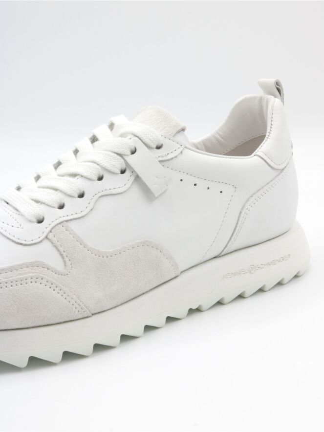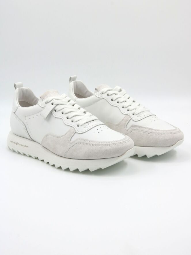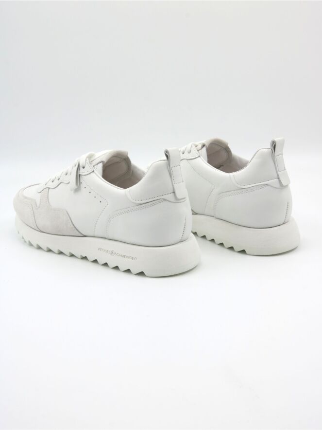 Une sneaker de Kennel & Schmenger en blanc. Le long du bord de l’avant-pied jusqu’aux côtés se trouve une large bande en suède camoscio couleur mozzarella. Ce détail est repris au talon et sur le bord intérieur de la tige. La semelle blanche est fortement crantée et l’intérieur est doublé de cuir.