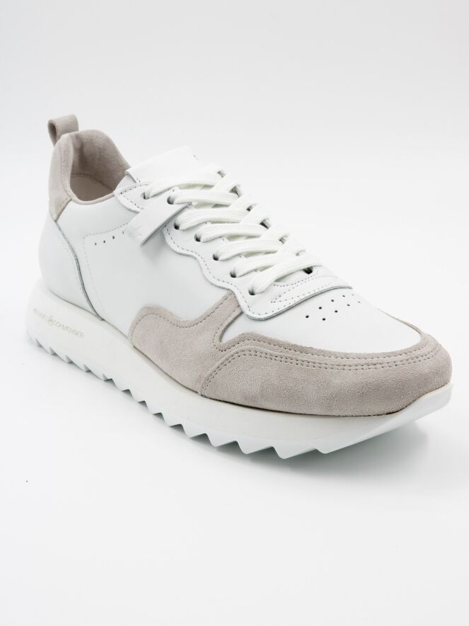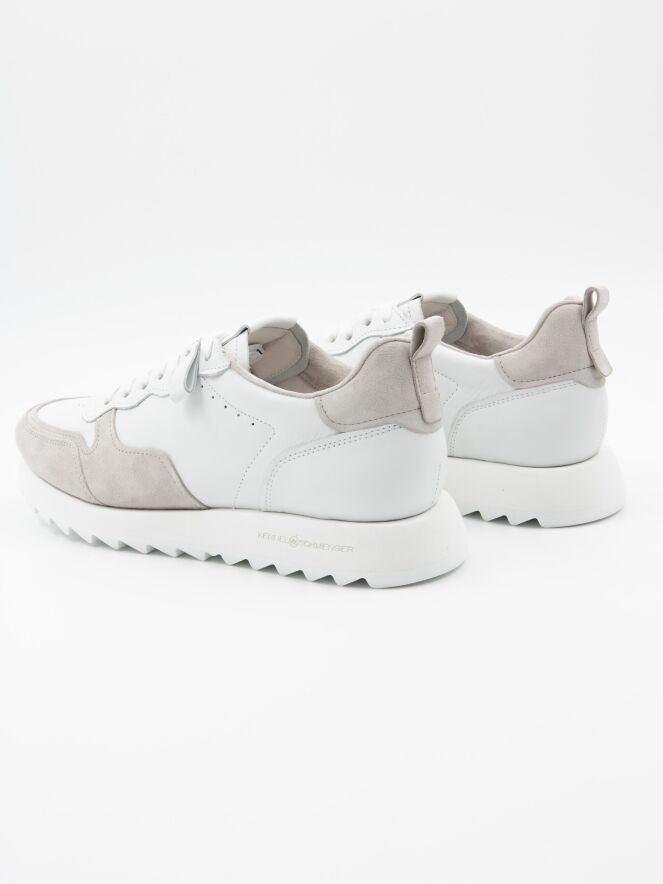 Ein Sneaker von Kennel & Schmenger in Weiß. Entlang des Randes von der Fußspitze zu den Seiten hin befindet sich ein breiter Teil aus einem hellgrauen Camoscio-Wildleder, der sich bis zur Ferse und entlang des inneren Randes des Schafts erstreckt. Die weiße Sohle ist stark gezackt, und das Innere ist mit Leder gefüttert.