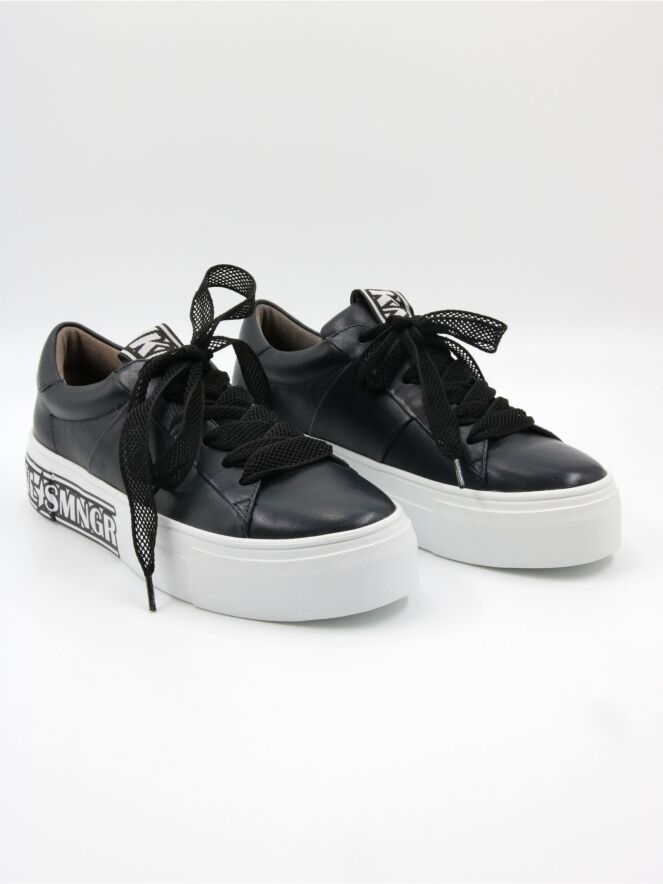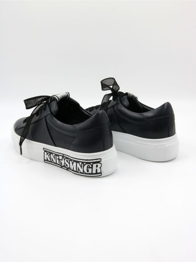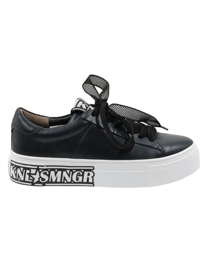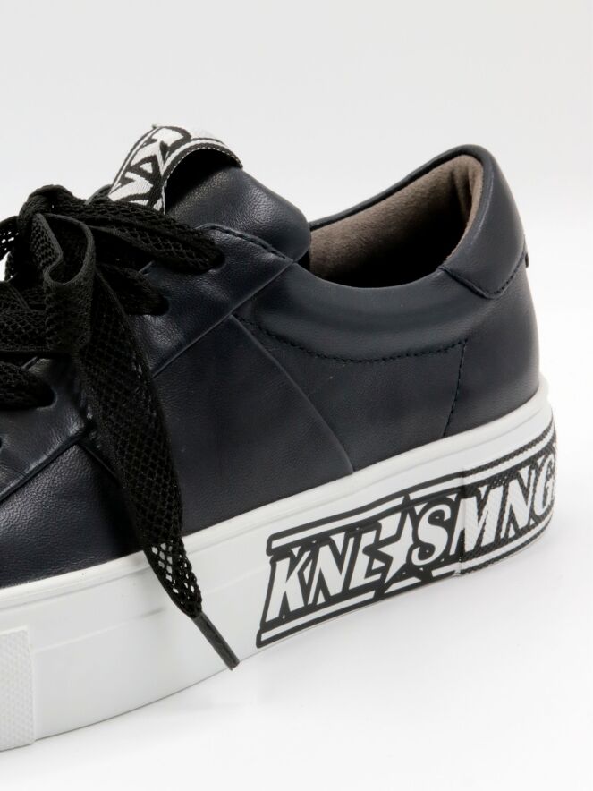 Une sneaker de Kennel und Schmenger en bleu marine. Sur le côté extérieur de la semelle blanc cassé, le texte « Kennel Schmenger » est imprimé en noir. Les lacets sont en maille perforée. L’intérieur de la chaussure est doublé de cuir.