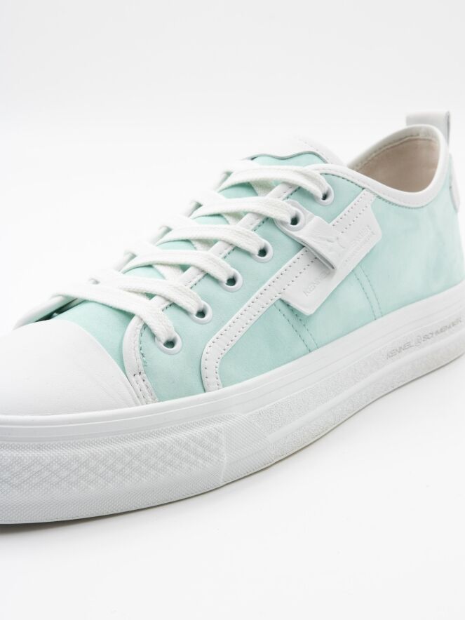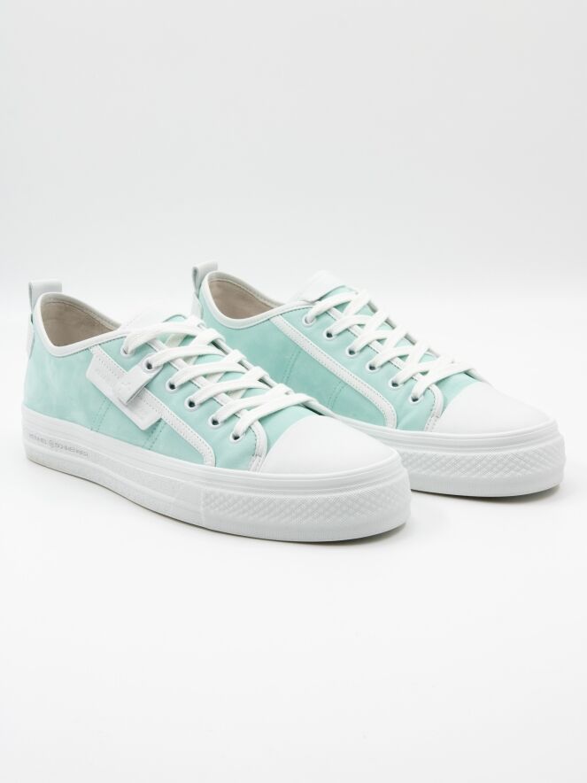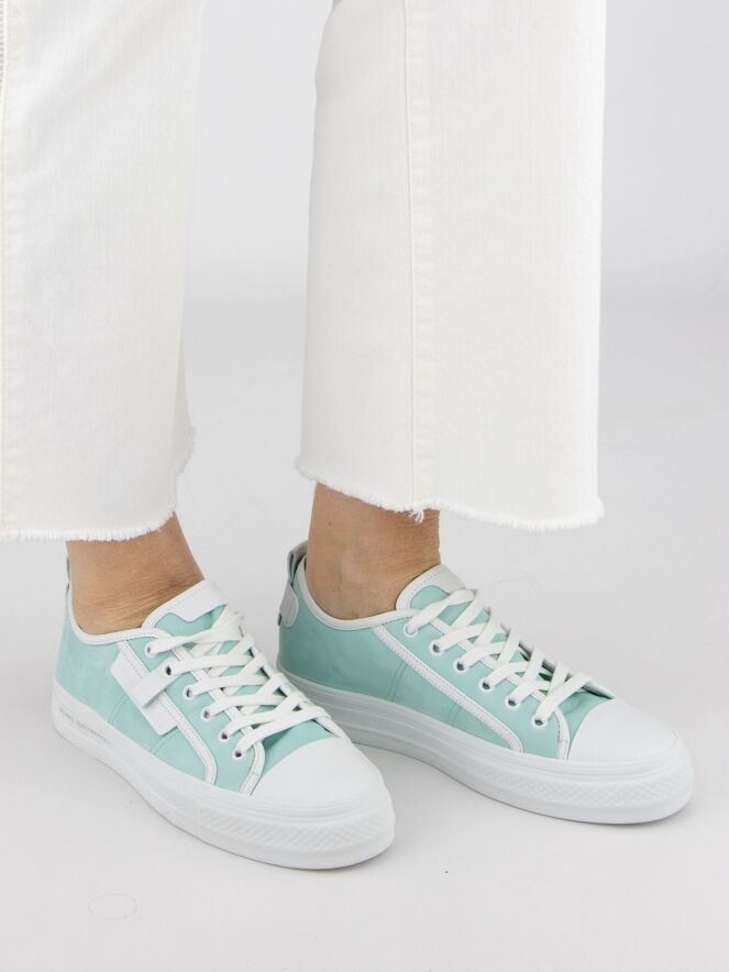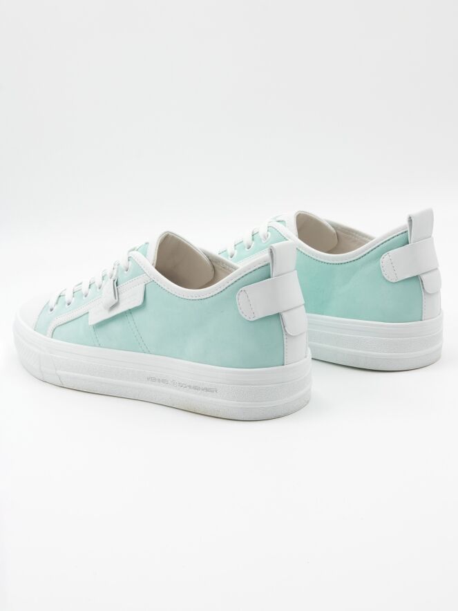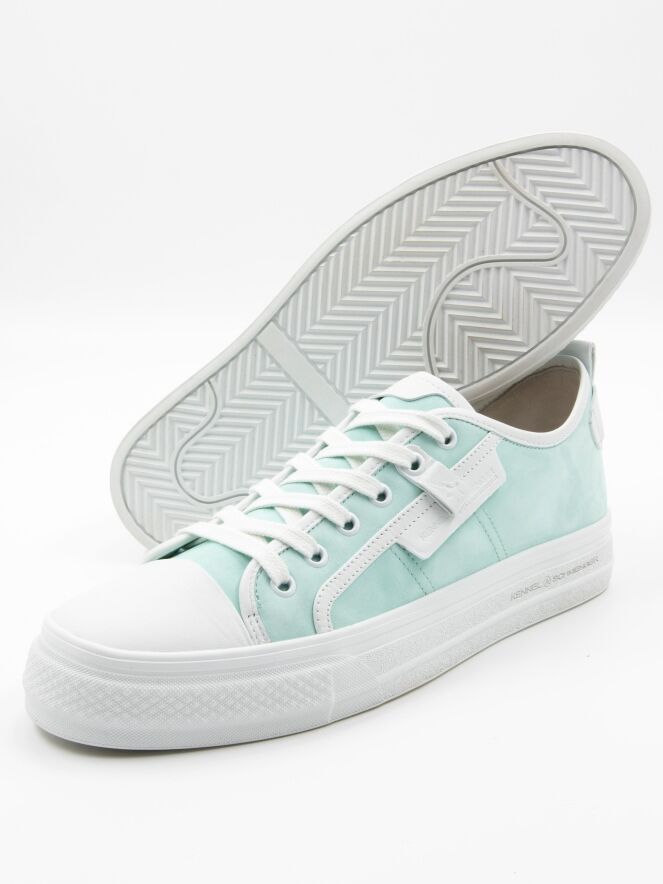 Une sneaker basse de Kennel & Schmenger de couleur turquoise. L'avant-pied est en cuir blanc et il y a plusieurs bandes blanches le long des côtés et de la tige. La semelle compensée est blanche et l'intérieur est doublé de cuir.