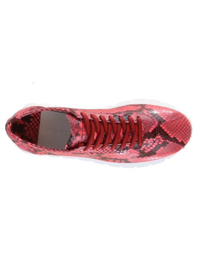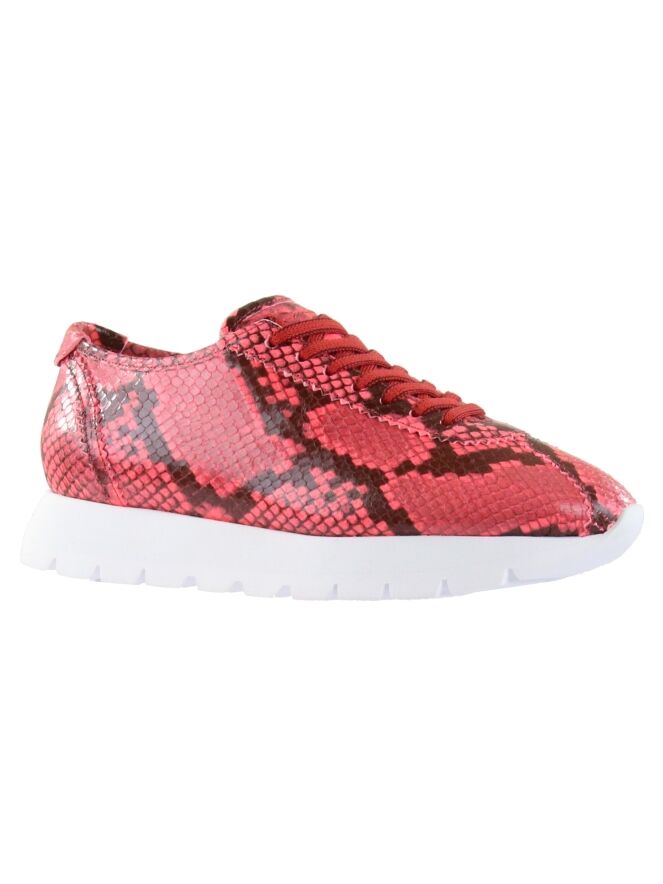 Sneaker de la marque Kennel & Schmenger, imprimée d'un motif peau de serpent aux couleurs rouge corail et marron moka. La semelle crantée est blanche. Les lacets de couleur rouge habillent le coup du pied. La semelle intérieure est amovible.
