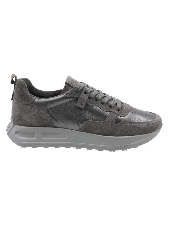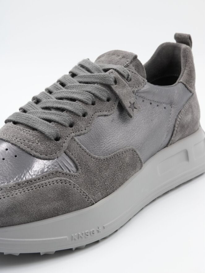 Une sneaker de Kennel & Schmenger en couleur gris métallique. Le long du bord du bout jusqu'aux côtés, au talon et le long des lacets, il y a un suède velours gris sportif. La semelle est légèrement surélevée au talon et l'intérieur est doublé de cuir.