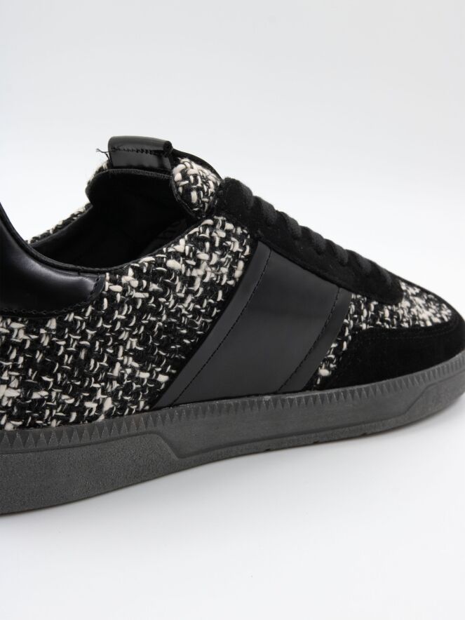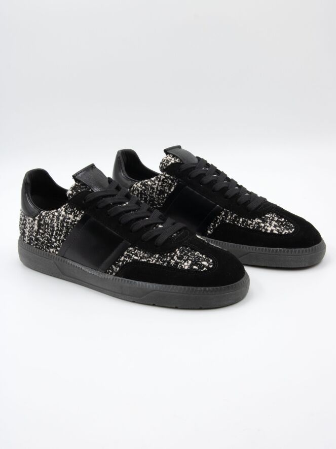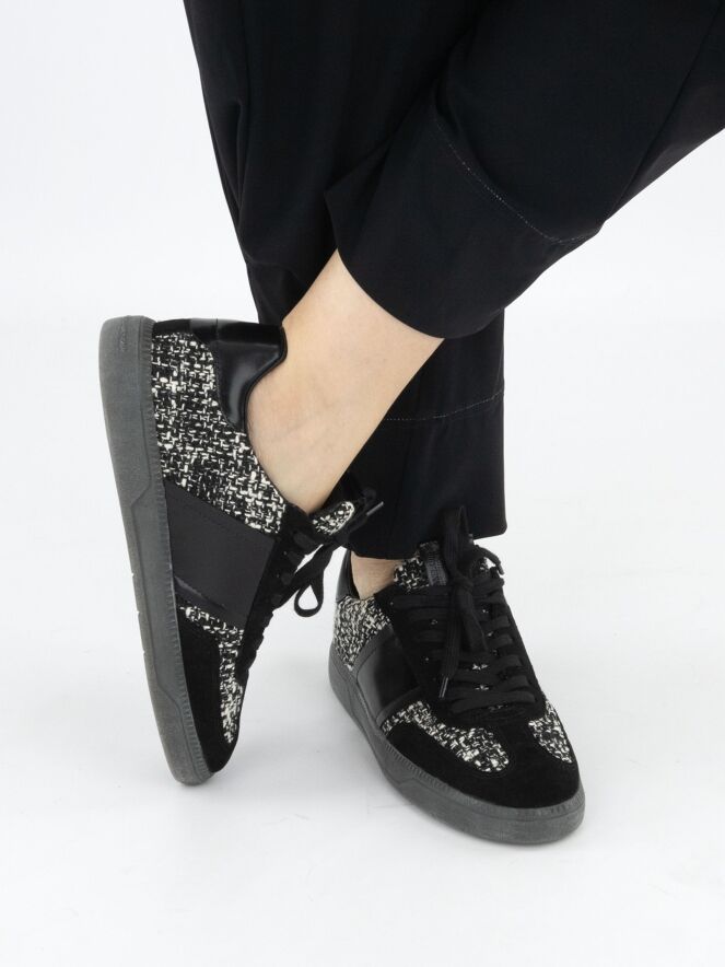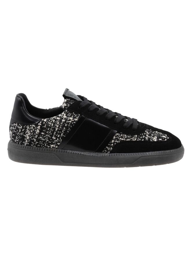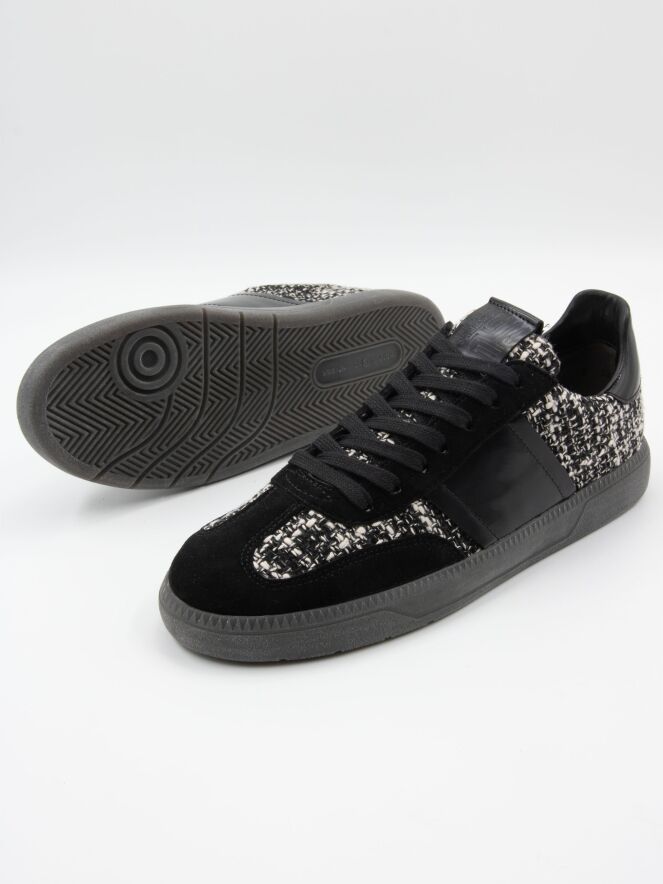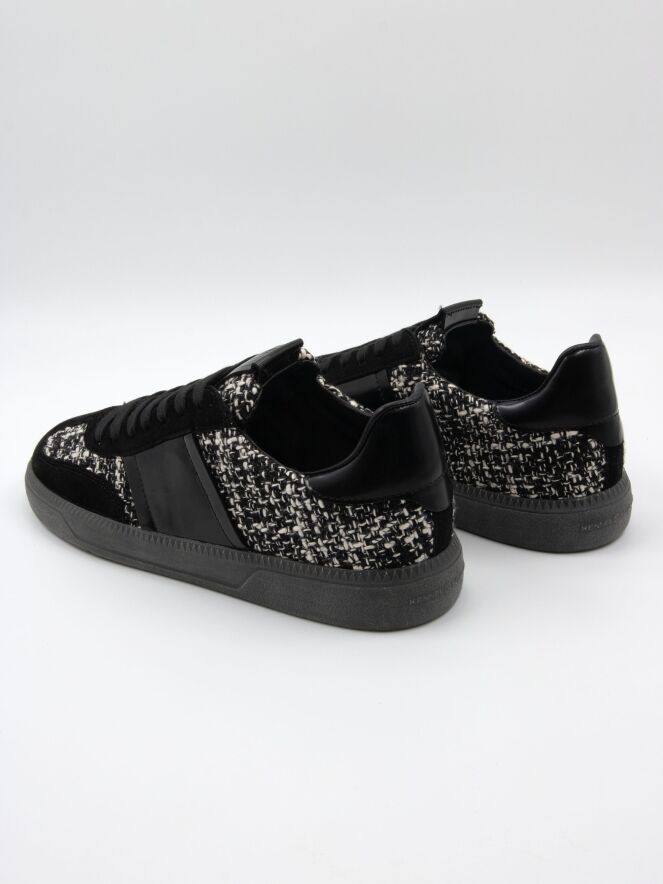 Une sneaker de luxe de Kennel & Schmenger en tissu noir et blanc, avec du suède camoscio noir le long du bord de l'avant-pied et près des lacets. Le talon et les côtés sont en cuir spazzolato décoratif. La semelle est gris foncé et l'intérieur est doublé de cuir.