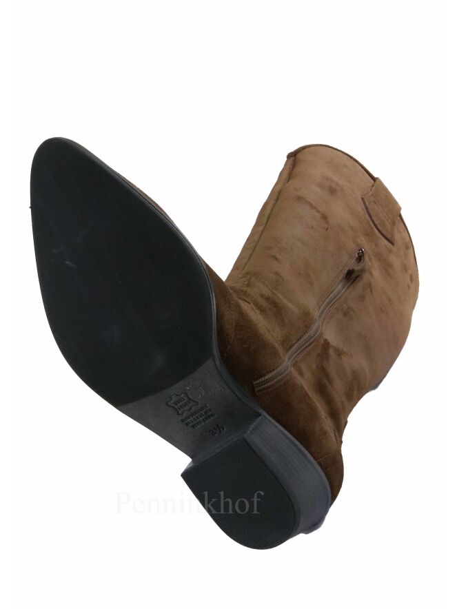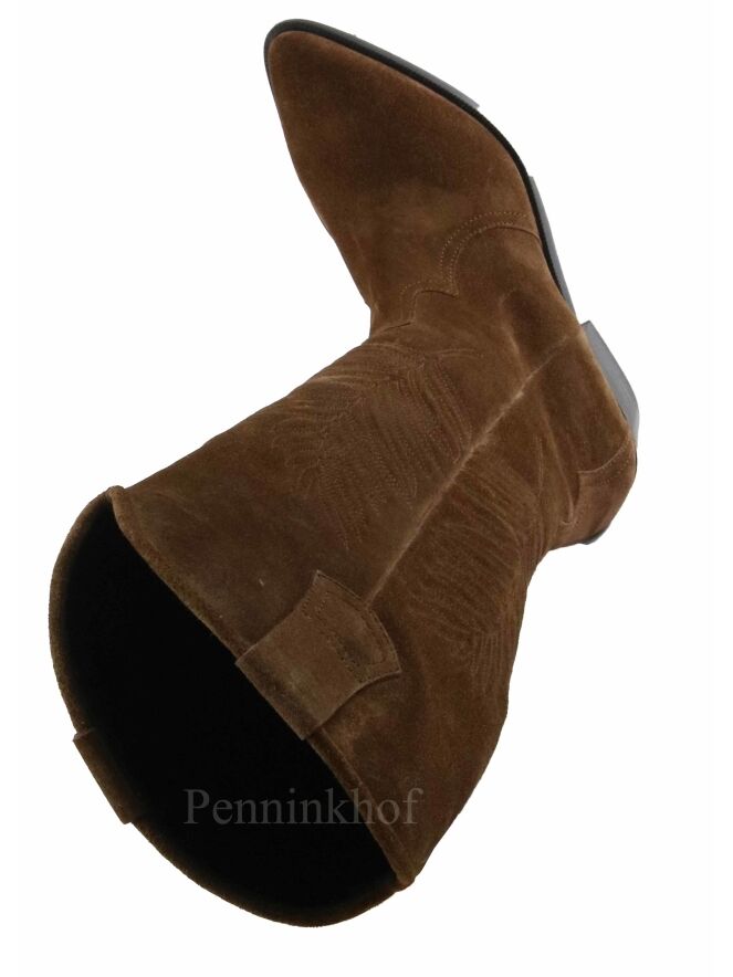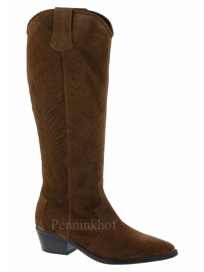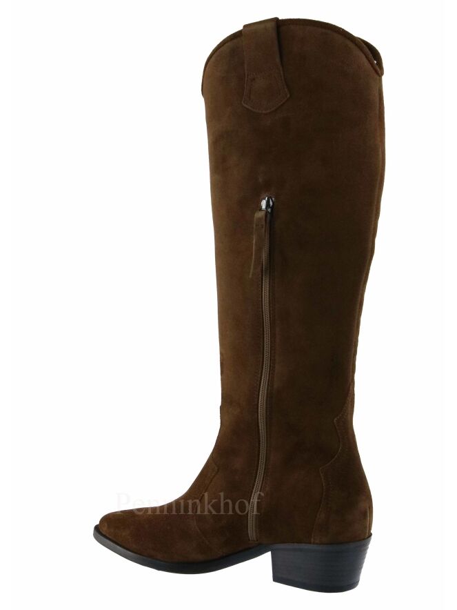 Botte haute western de la marque Kennel & Schmenger, de couleur cognac. Un motif de feuille est cousu à l'extérieur de la tige. La botte présente un nez pointu. La fermeture Eclair se situe sur le côté intérieur et s'arrête à mi hauteur de la tige. Intérieur doublé cuir.