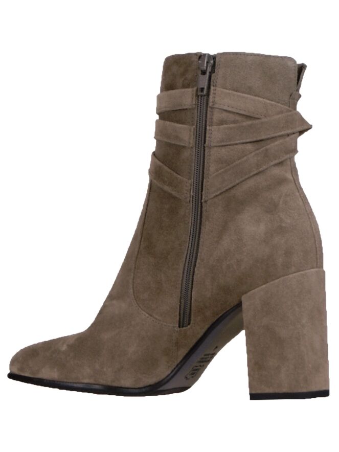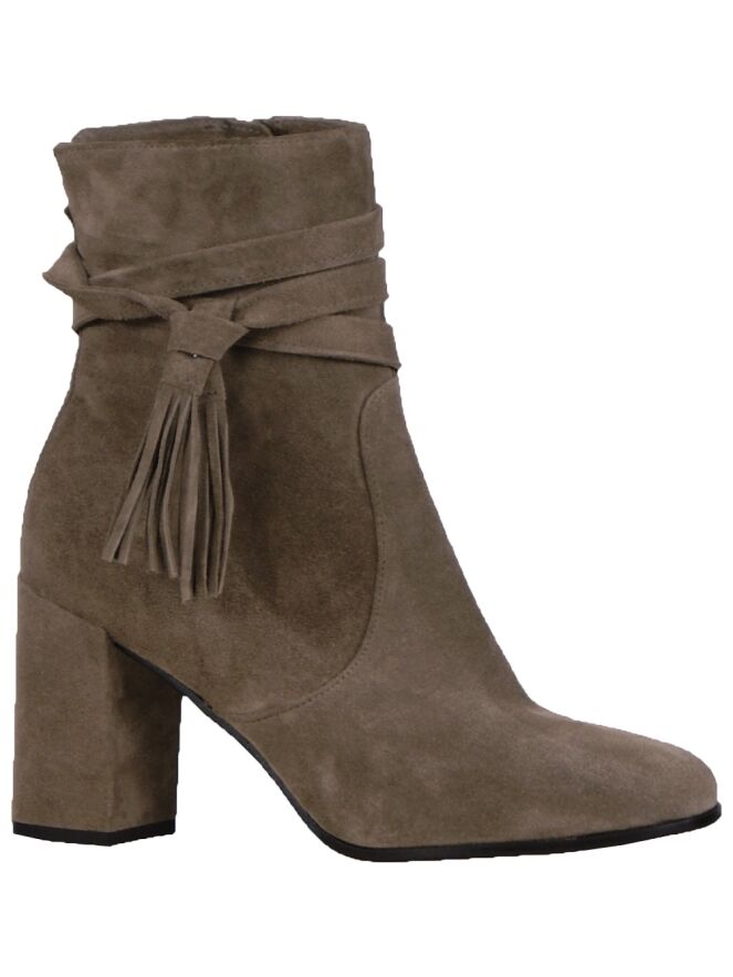 Bottine en nubuck de la marque Kennel & Schmenger de couleur beige. A hauteur de la cheville, trois lanières partent de la fermeture Eclair côté intérieure pour se nouer sur le côté extérieur en deux glands. Le talon de 7 cm est couvert du même nubuck. Modèle sans doublure intérieure, à semelle anti-dérapante.
