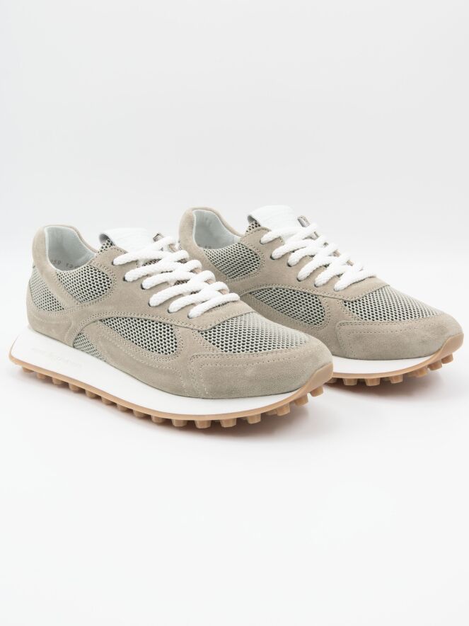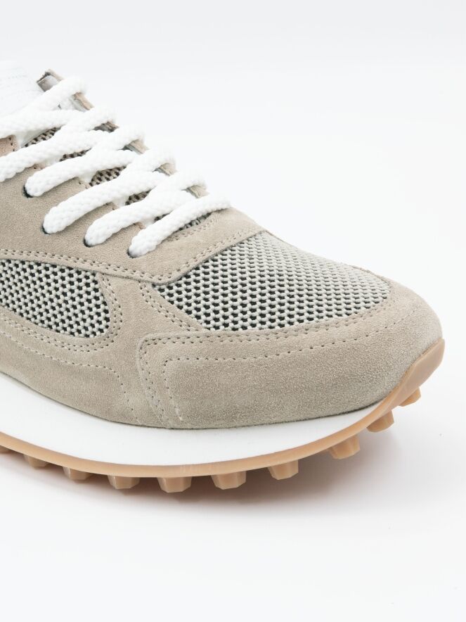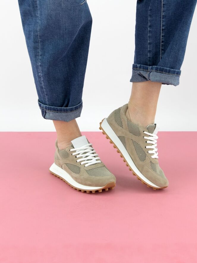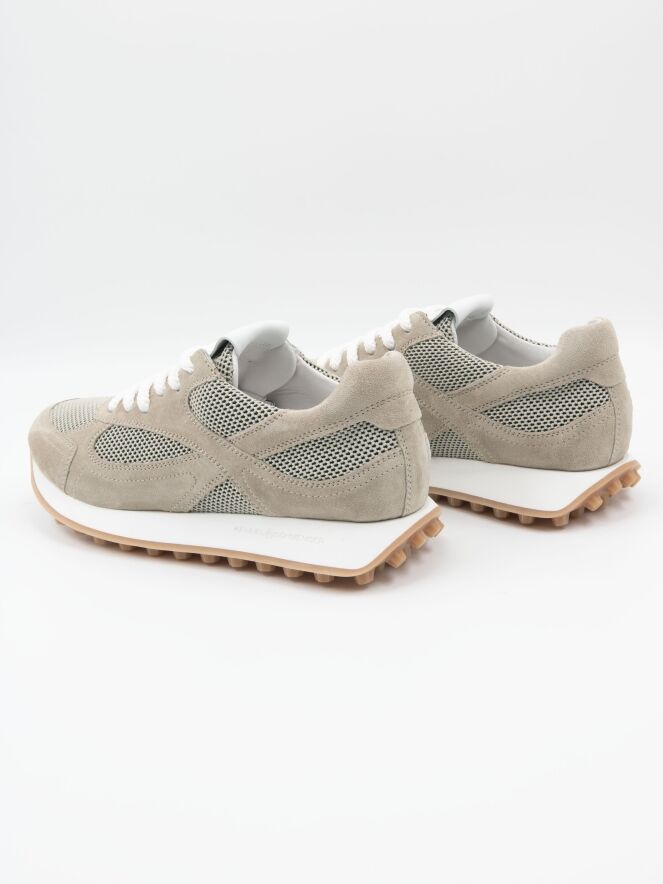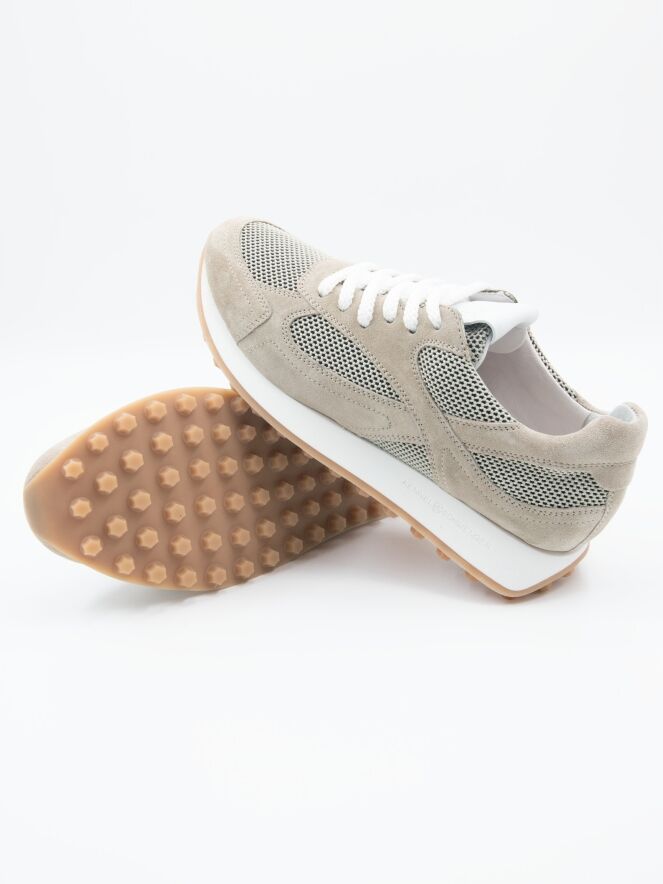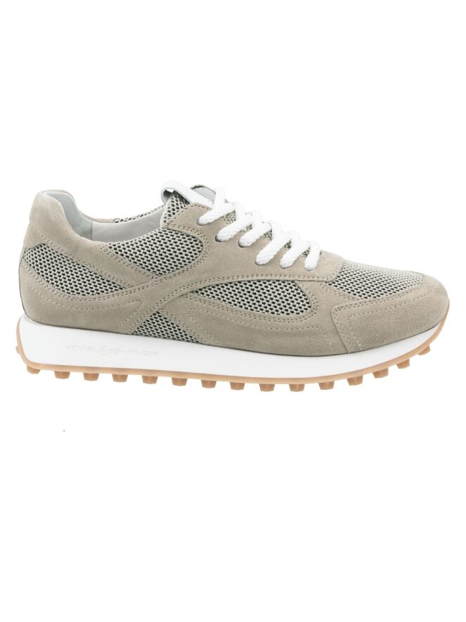 Une sneaker luxueuse de Kennel und Schmenger en couleur sable. La sneaker associe du suède camoscio à un tissu élastique en structure filet. Elle possède une semelle blanche et des lacets blancs.