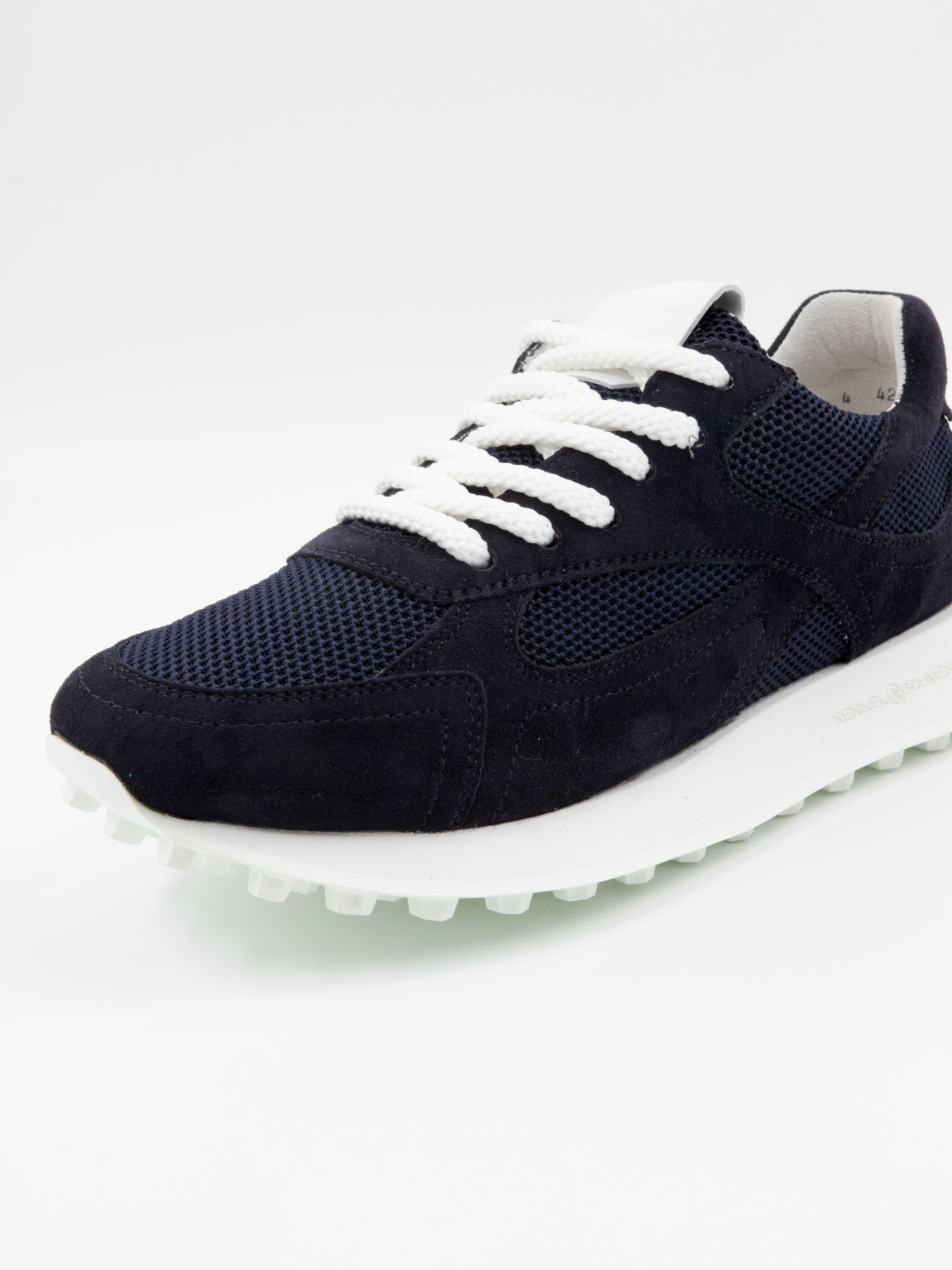 Une sneaker de luxe de Kennel und Schmenger en bleu marine. La sneaker associe du suède camoscio à un tissu élastique en structure filet. Elle possède une semelle blanche et des lacets blancs.