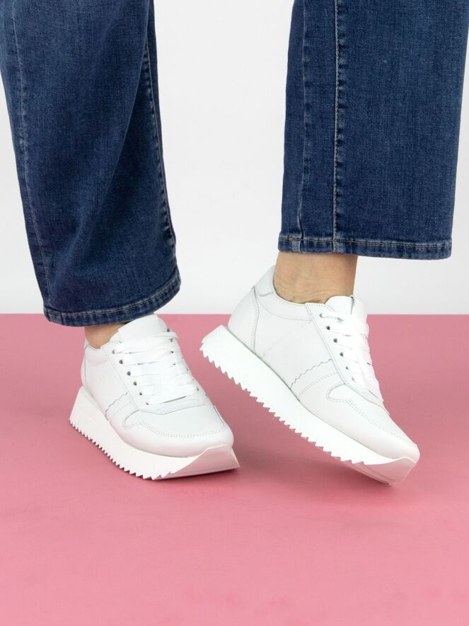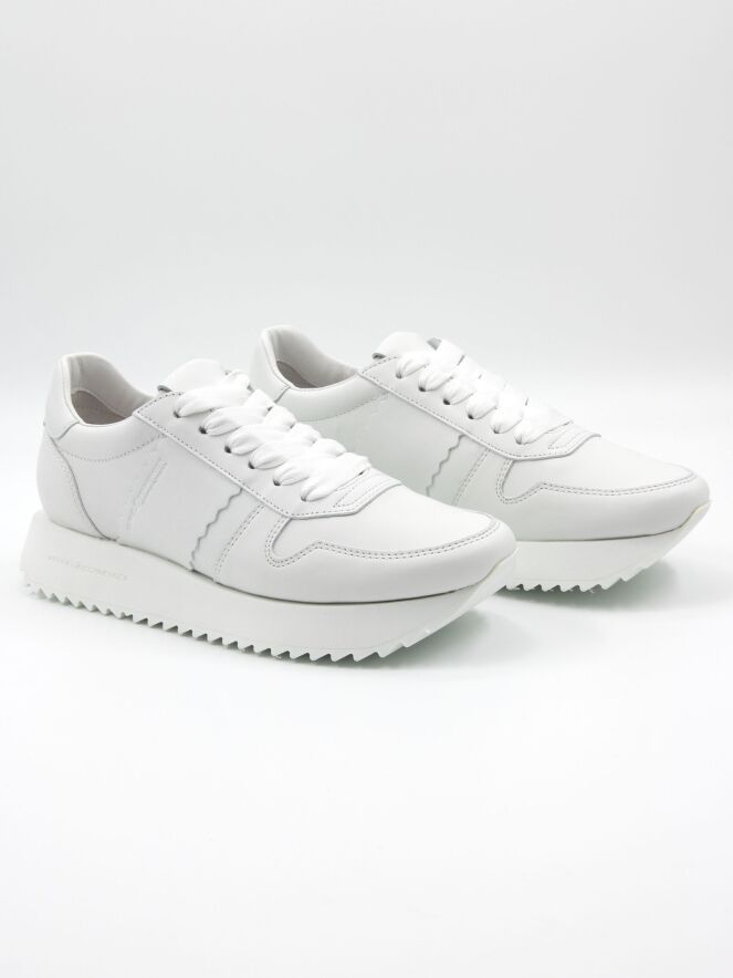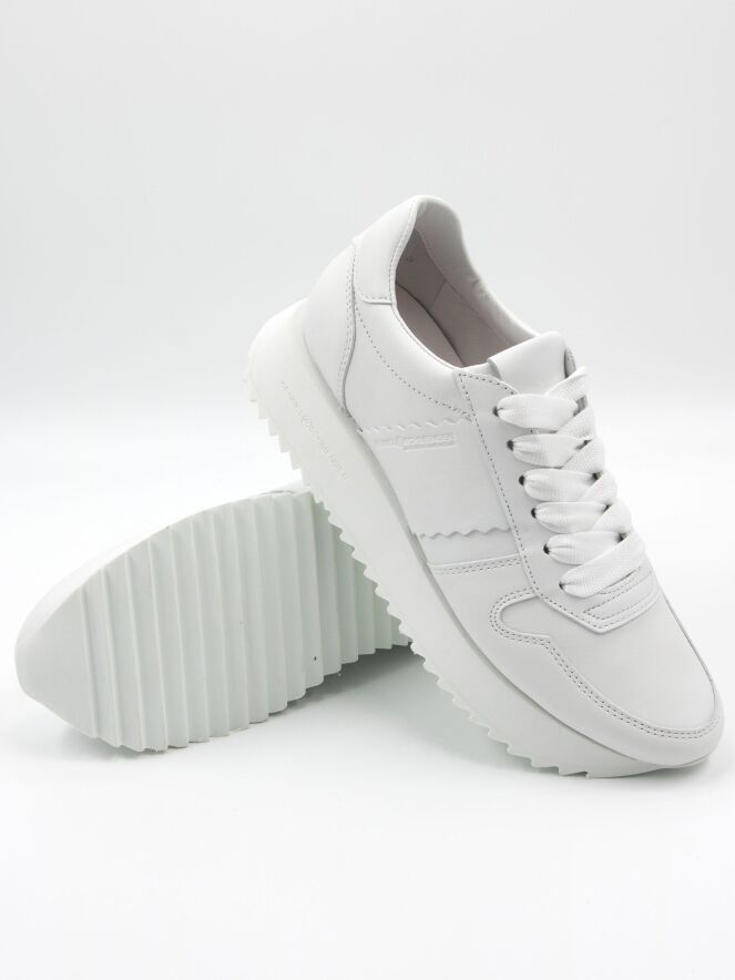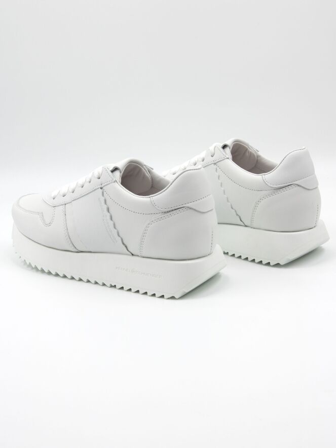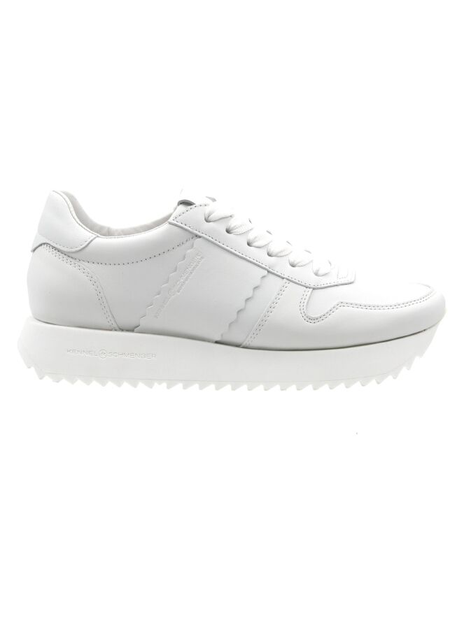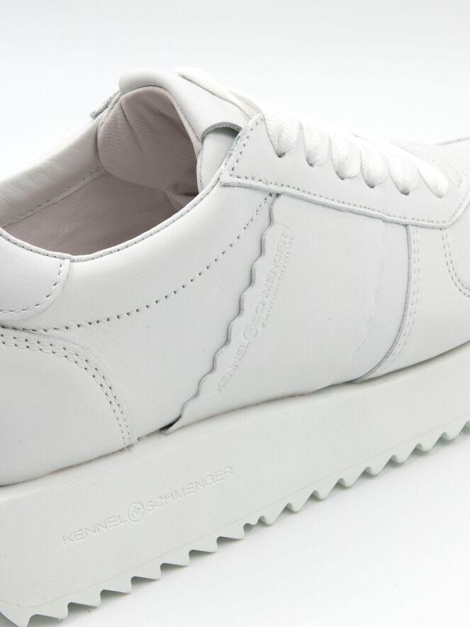 Une sneaker de Kennel und Schmenger en blanc. La semelle sportive est finement crantée sur le dessous. L’intérieur est doublé en cuir.