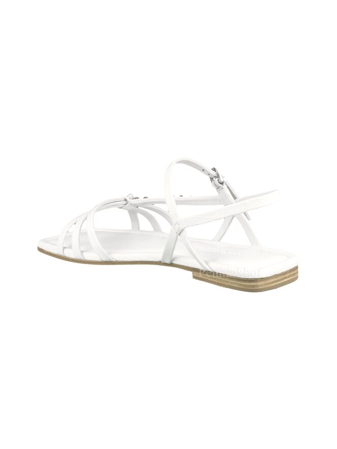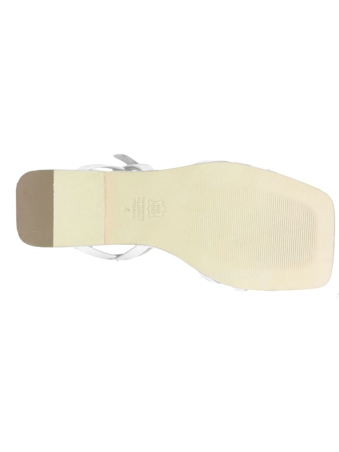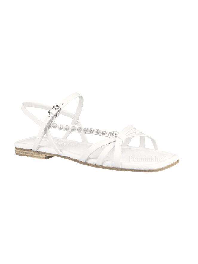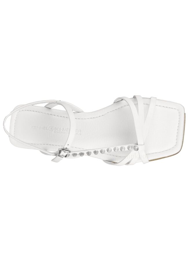 Sandale de la marque Kennel & Schmenger, en cuir de couleur blanche. 3 étroites sangles se croisent sur l'avant du pied. La sangle extérieure du pied est ornée d'une rangée de clous décoratifs de couleur argentée. La sangle du talon est réglable. La sandale présente un nez et un arrière carrés.