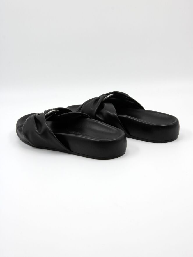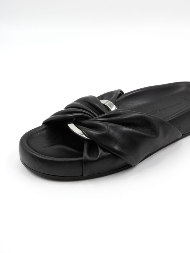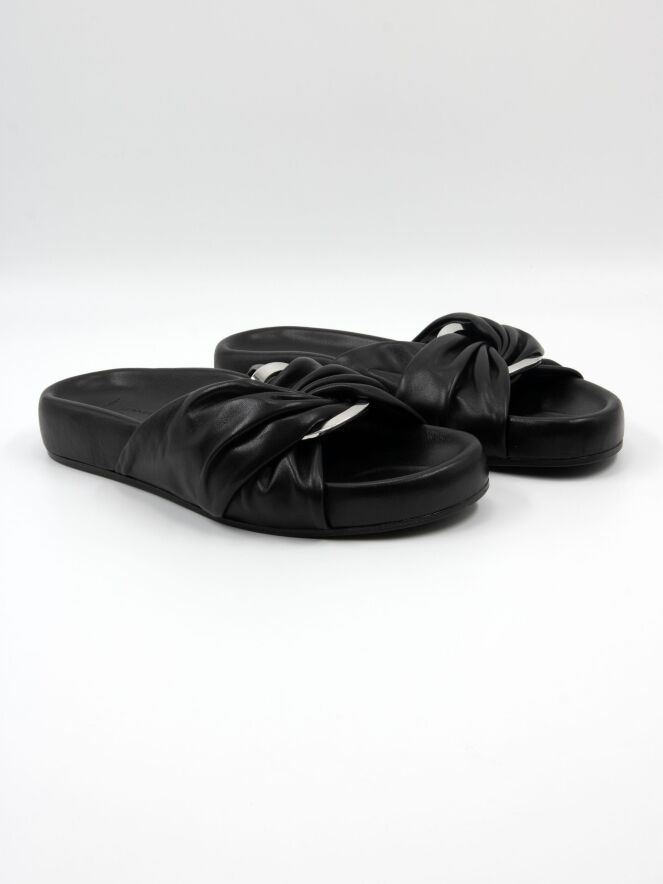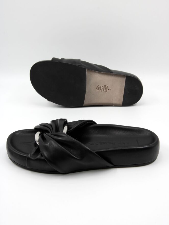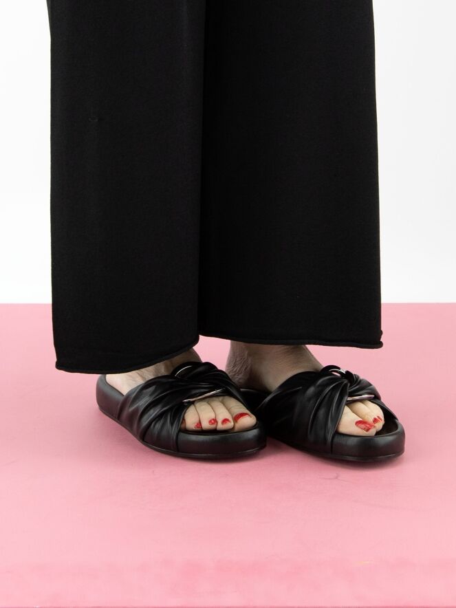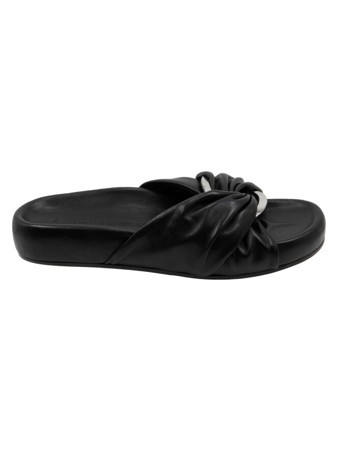 Une mule luxueuse de Kennel und Schmenger en noir. Au centre de la bride en cuir sur l’avant-pied, une boucle ovale argentée est placée. La semelle intérieure souple est dans la même couleur que le cuir.