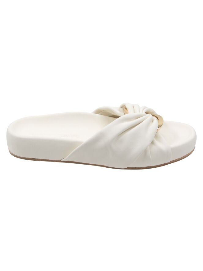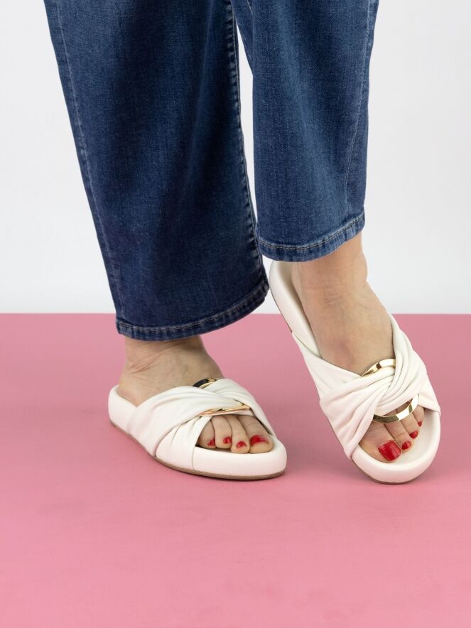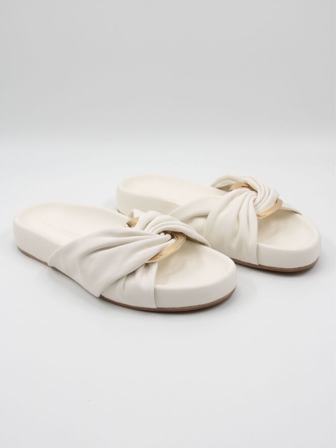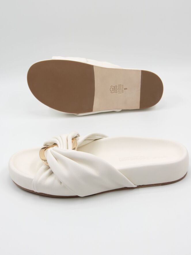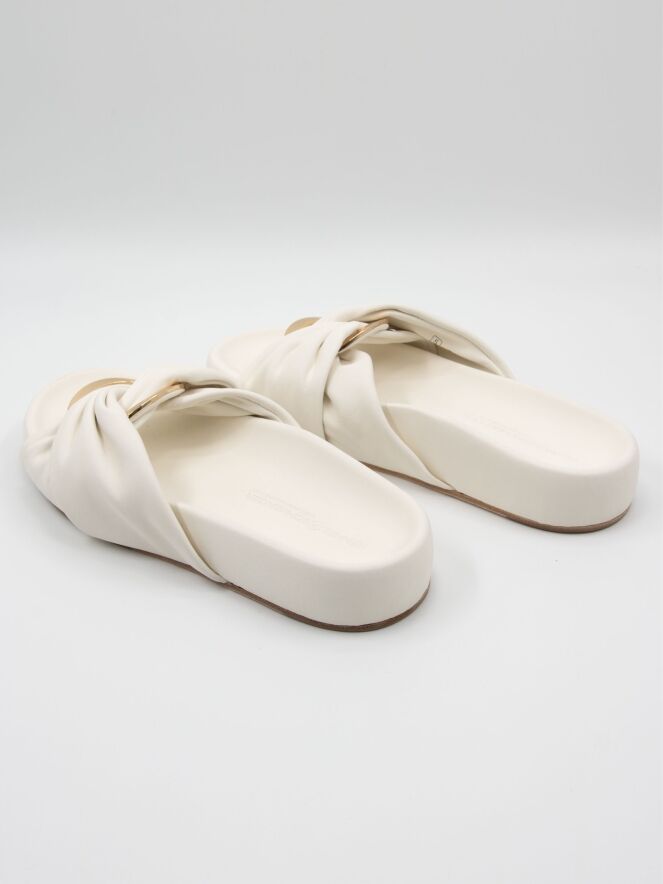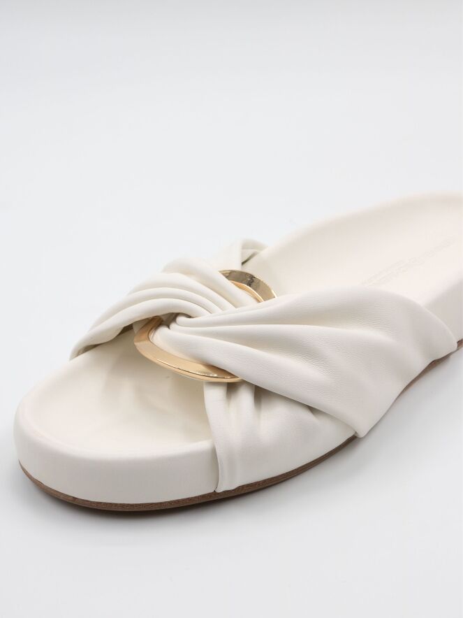 Une mule luxueuse de Kennel und Schmenger en blanc crème. Au centre du cuir sur l’avant-pied se trouve une boucle ovale dorée. La semelle intérieure souple est de la même couleur que le cuir.