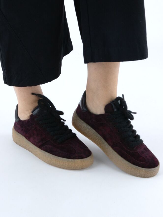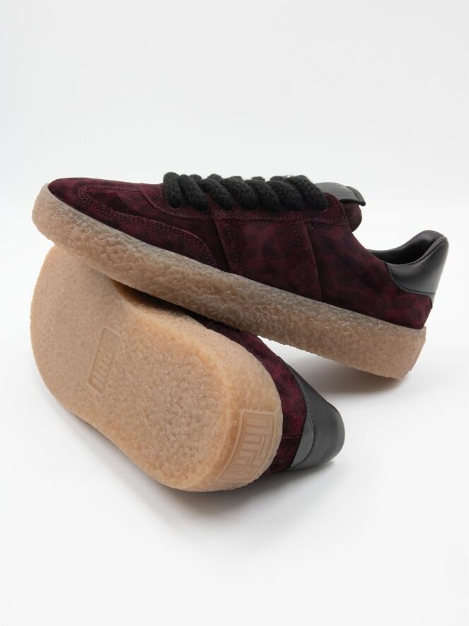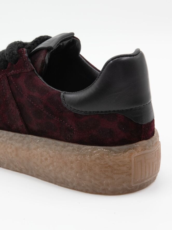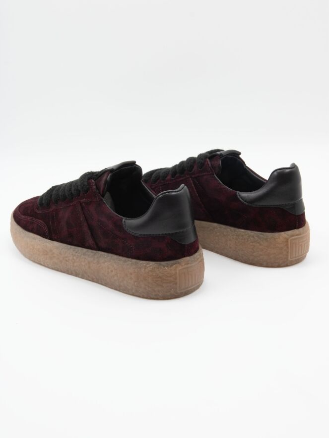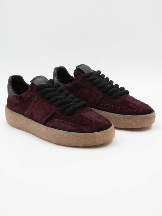 Une sneaker basse de la marque Kennel & Schmenger avec un imprimé léopard noir sur un fond bordeaux. L’avant est en daim camoscio. Du cuir noir est utilisé au niveau du talon et de la languette. L’intérieur est doublé de cuir.