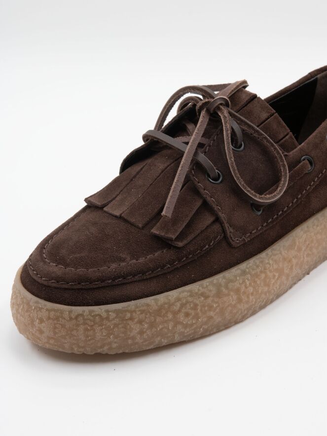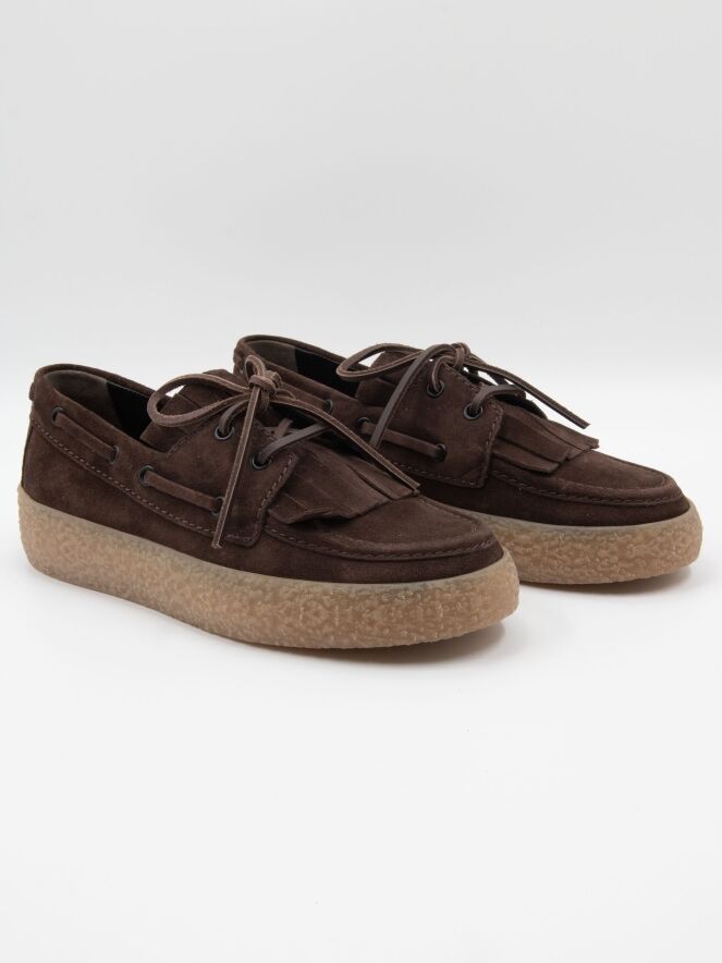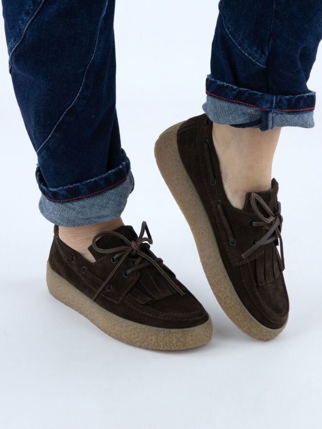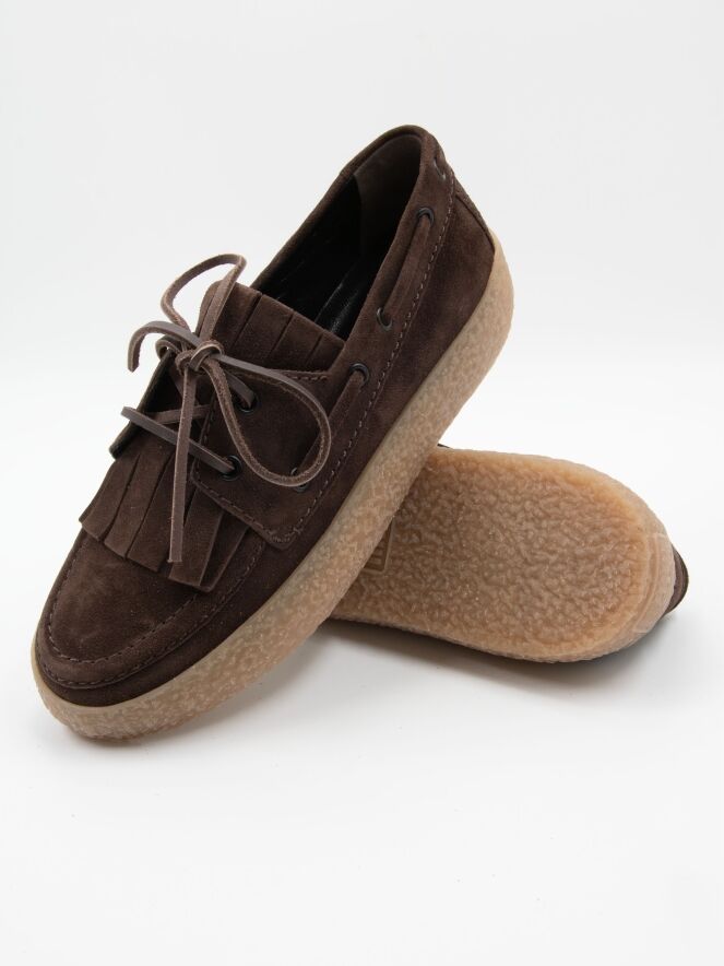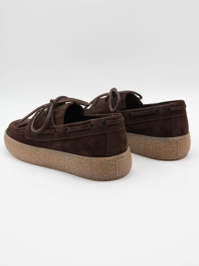 Un mocassin de la marque Kennel & Schmenger en brun foncé. Un nœud décoratif orne l’avant du pied et une courte languette jamboree est présente sur le dessus. La semelle épaisse de couleur camel est crantée. L’intérieur est doublé de cuir.