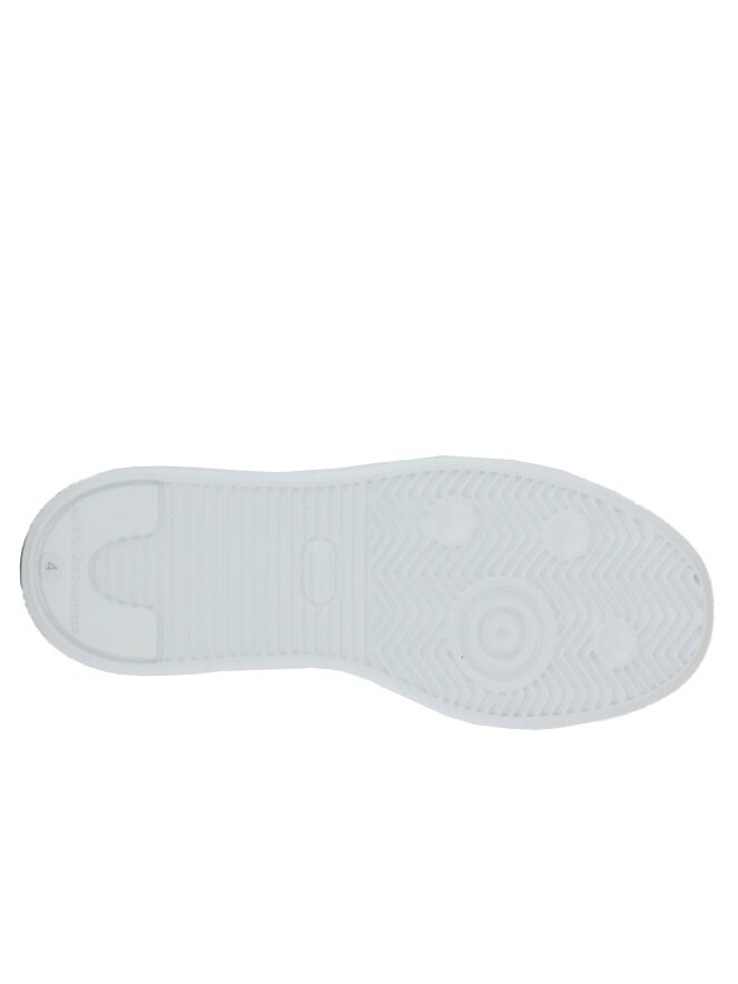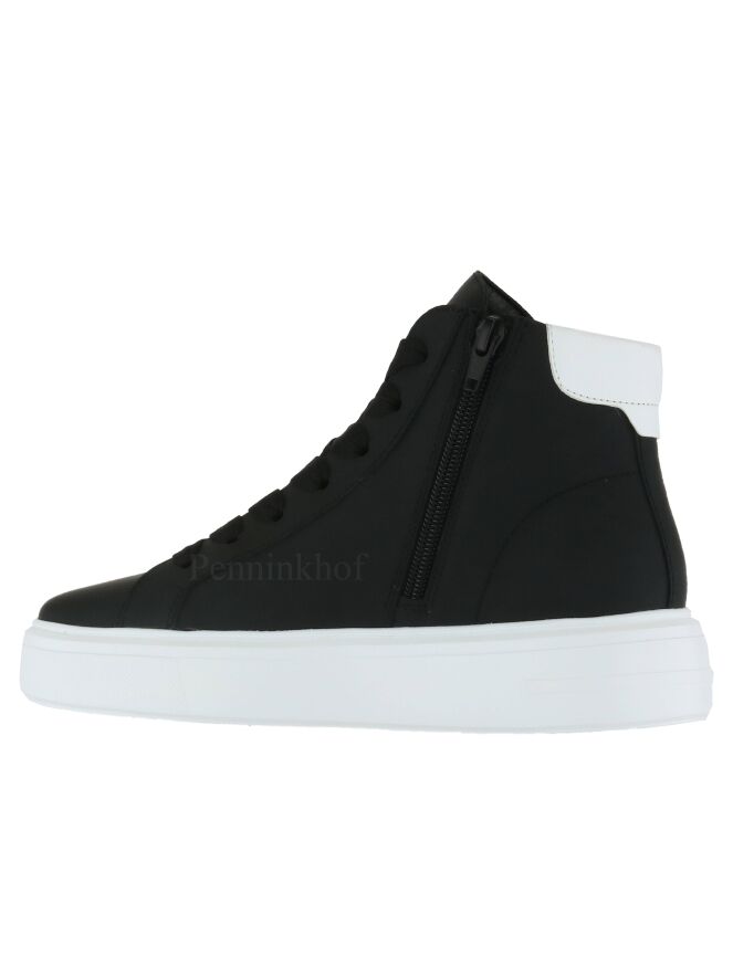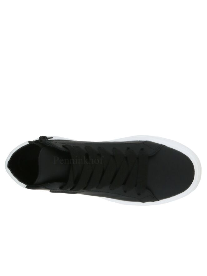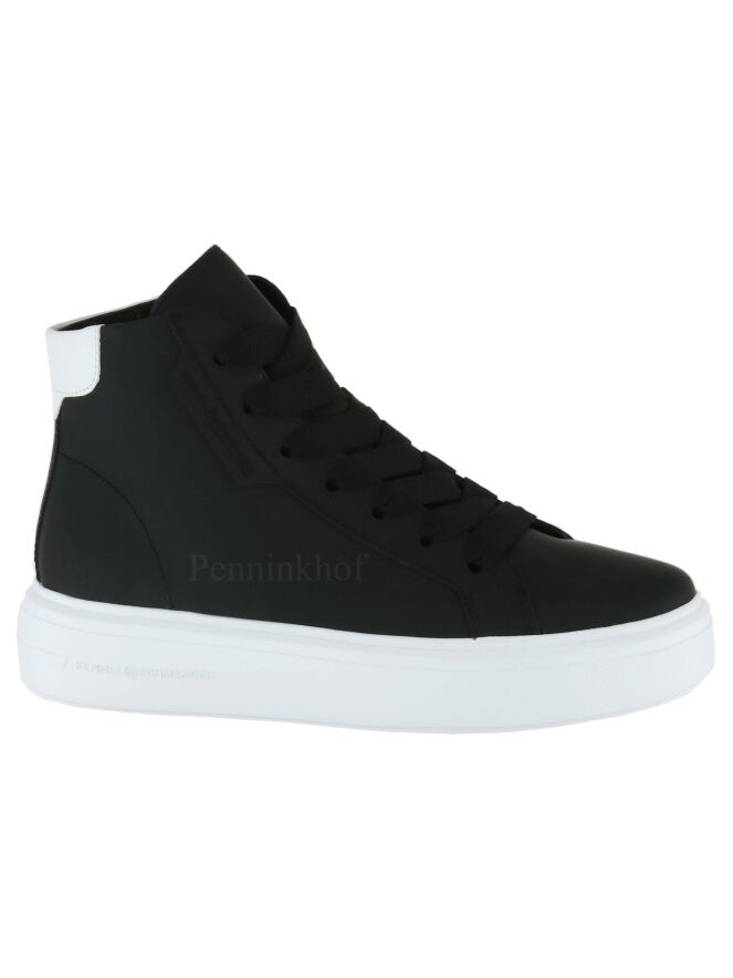Sneakers hautes de la marque Kennel & Schmenger, de couleur noir mat. La semelle de couleur blanche trouve un rappel de couleur sur un empiècement en cuir blanc cousu sur le talon. La sneaker s'ouvre grâce à un zip présent sur l'intérieur. La semelle intérieure est amovible. Intérieur doublé cuir.