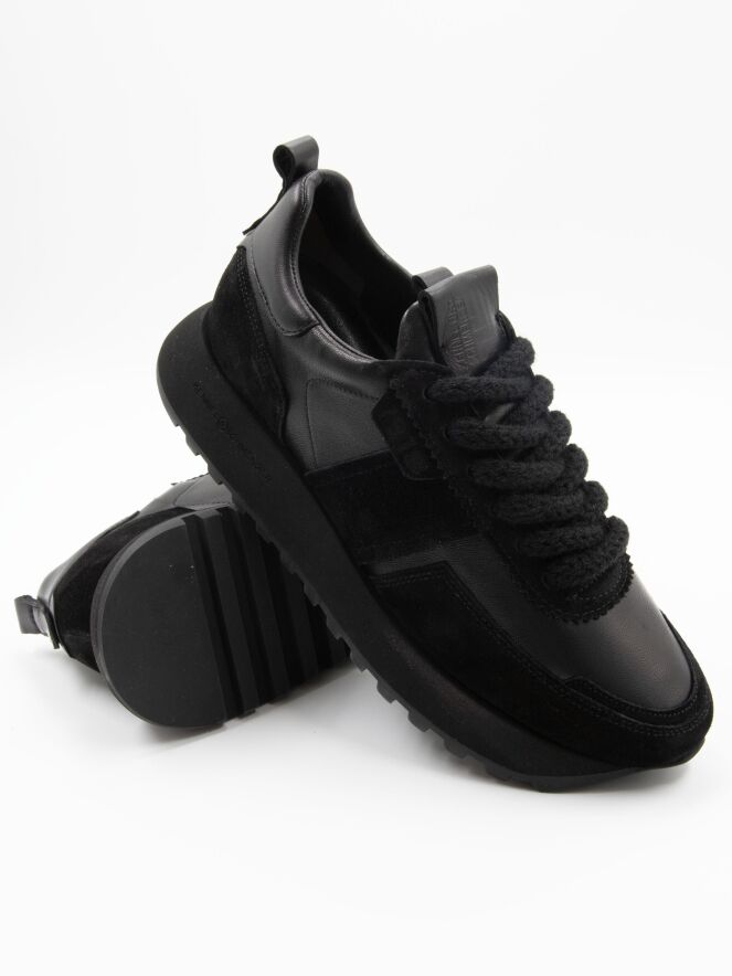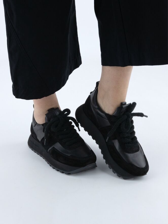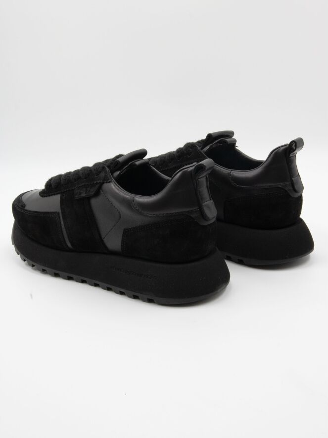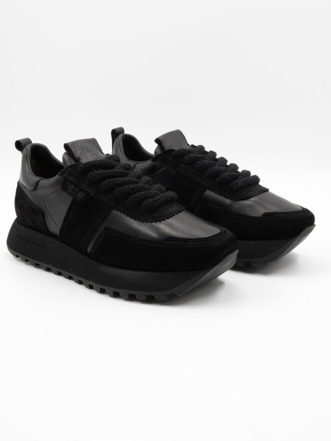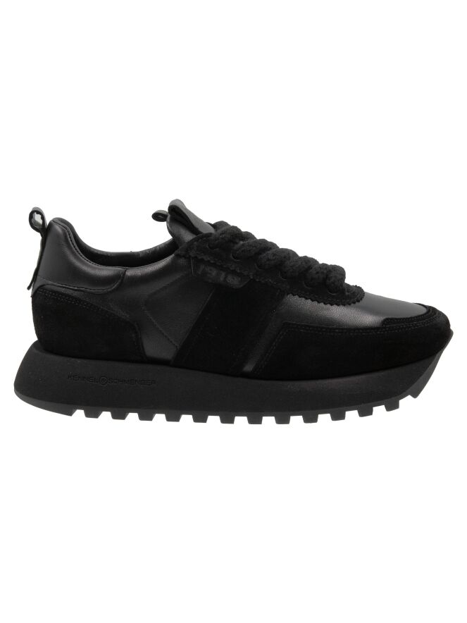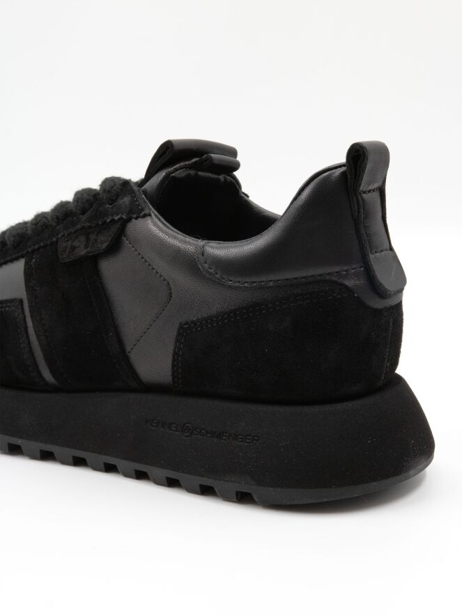 Une sneaker de la marque Kennel & Schmenger en noir. Le long du bord de la pointe vers les côtés, au niveau du talon et autour des lacets, se trouve un daim velours noir à l’allure sportive. La semelle est légèrement rehaussée au niveau du talon et l’intérieur est doublé de cuir.