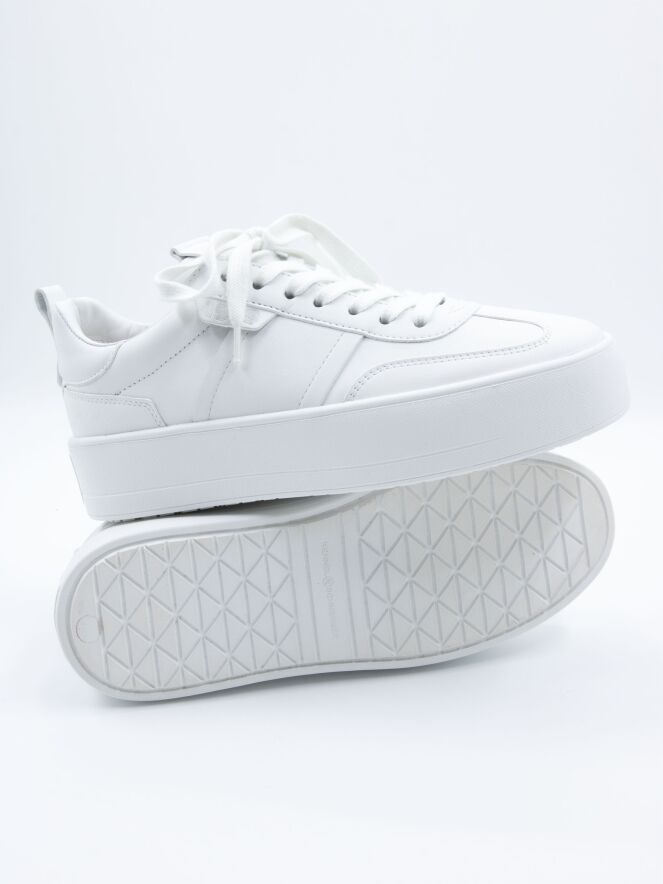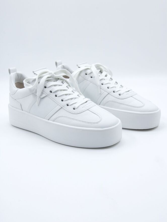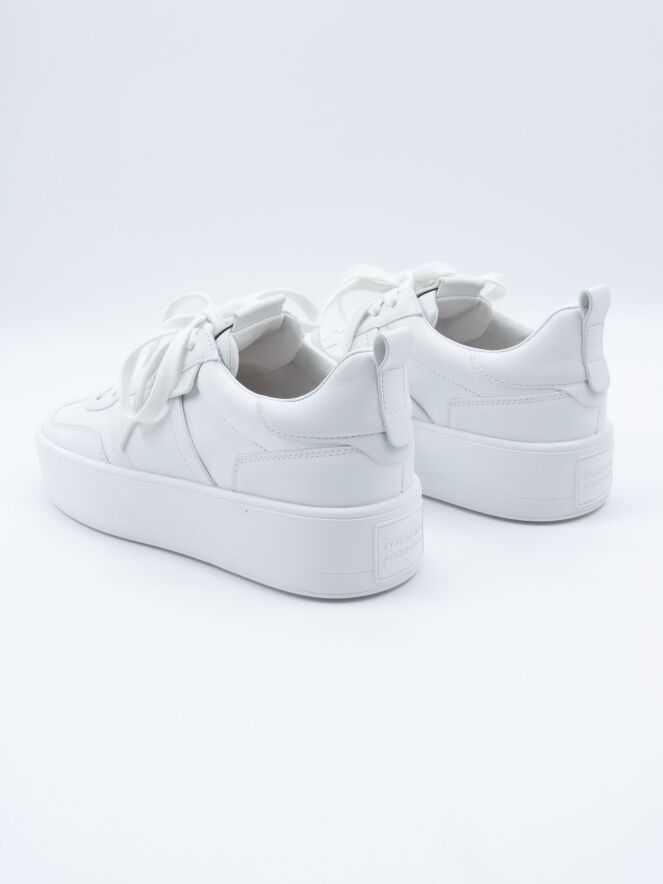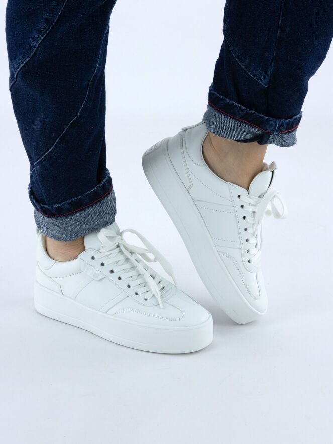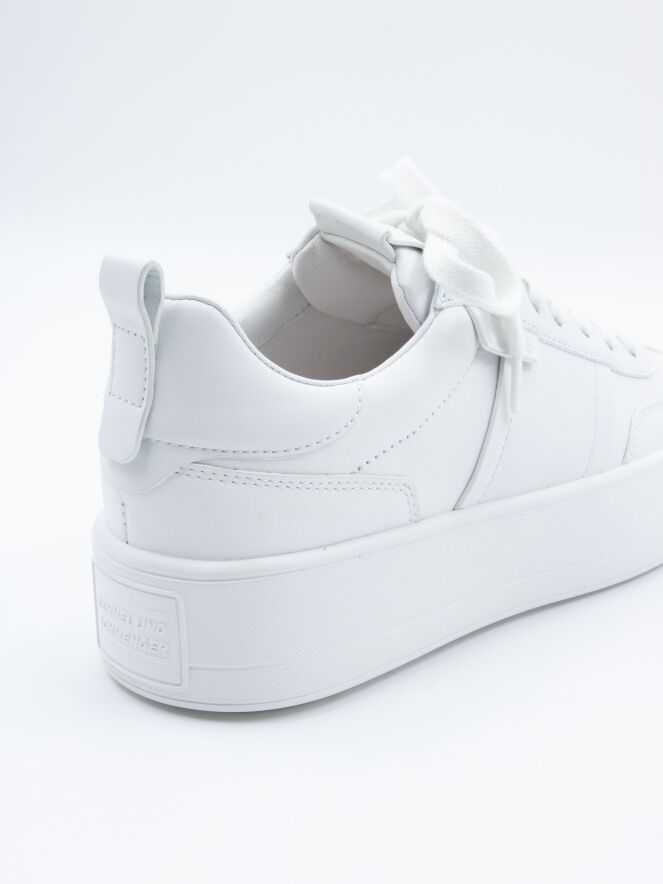 Une sneaker de Kennel & Schmenger en blanc. La semelle plateau et les lacets sont également blancs. L’intérieur est doublé en cuir.