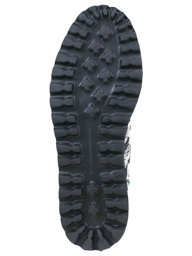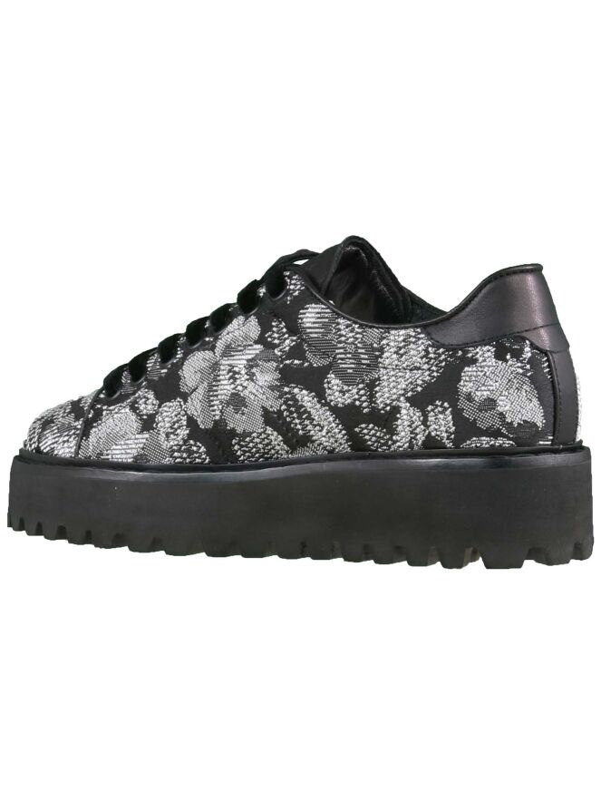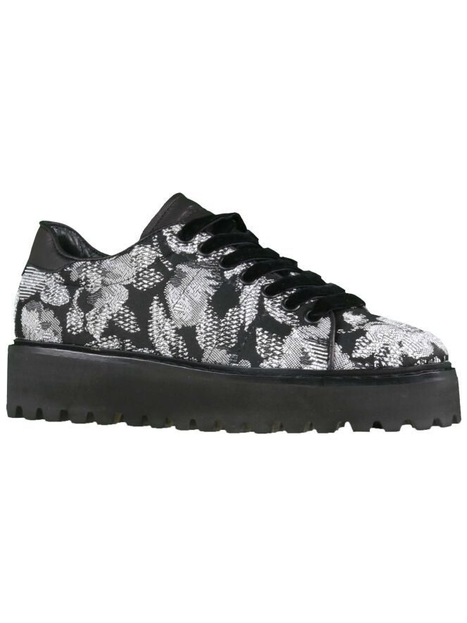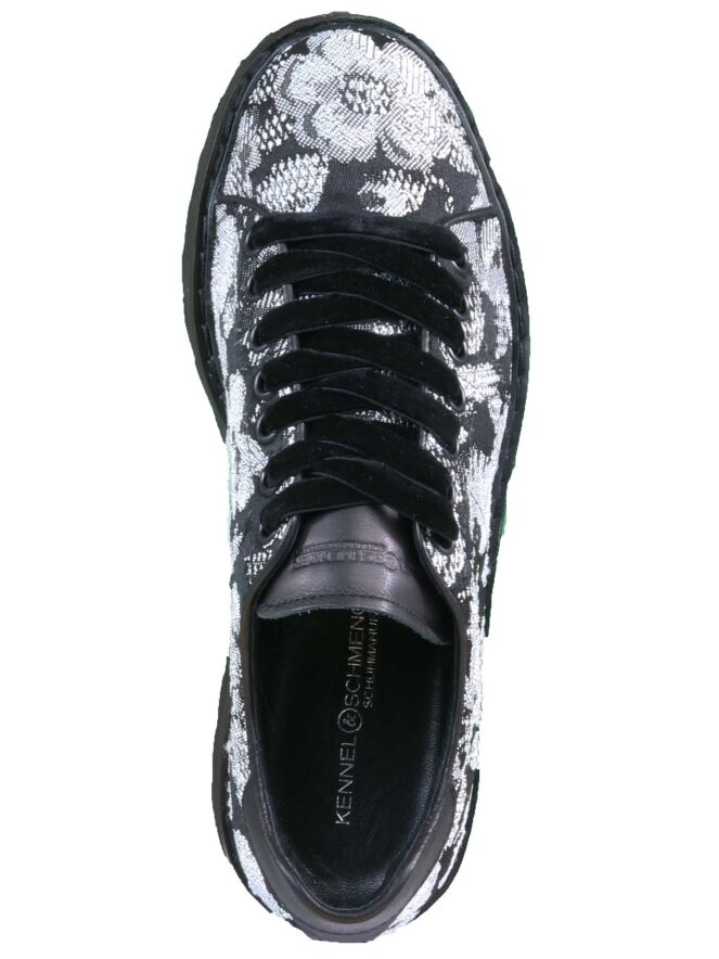 Sneaker en tissu de la marque Kennel & Schmenger, aux motifs de fleurs mélangés noir et blanc. Les lacets sont en tissu de velours. La chaussure est bordée de fins liserés en cuir noir. Modèle à semelle crantée. Intérieur doublé cuir.