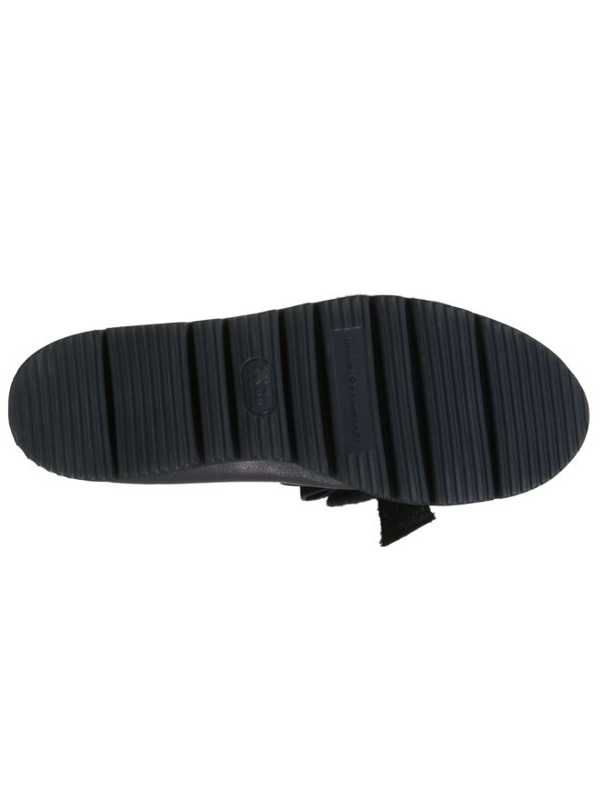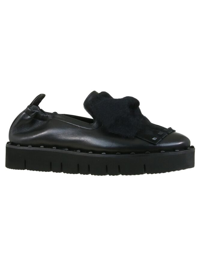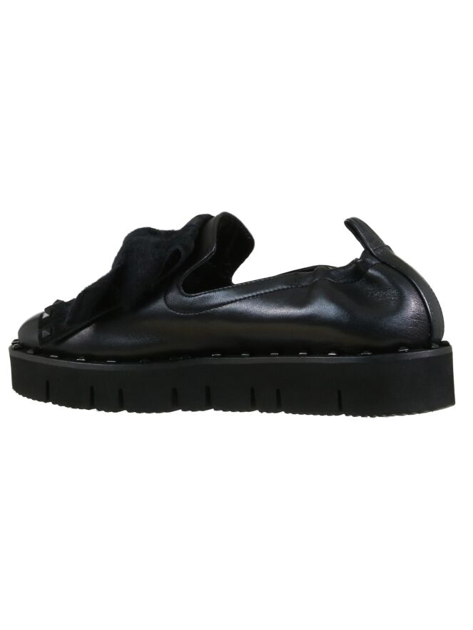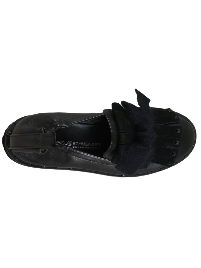 Sneaker de luxe en cuir de couleur noir, de la marque Kennel & Schmenger. L'avant du pied est couvert d'une languette à larges franges et d'un nœud papillon en jute noir. Des goujons noirs ornent l'extrémité de la languette et le bord de la semelle. Un élastique est inséré au bord du talon. Intérieur partiellement doublé de cuir.