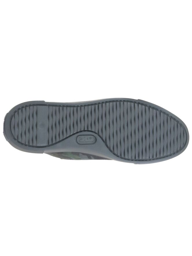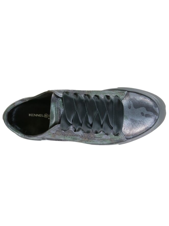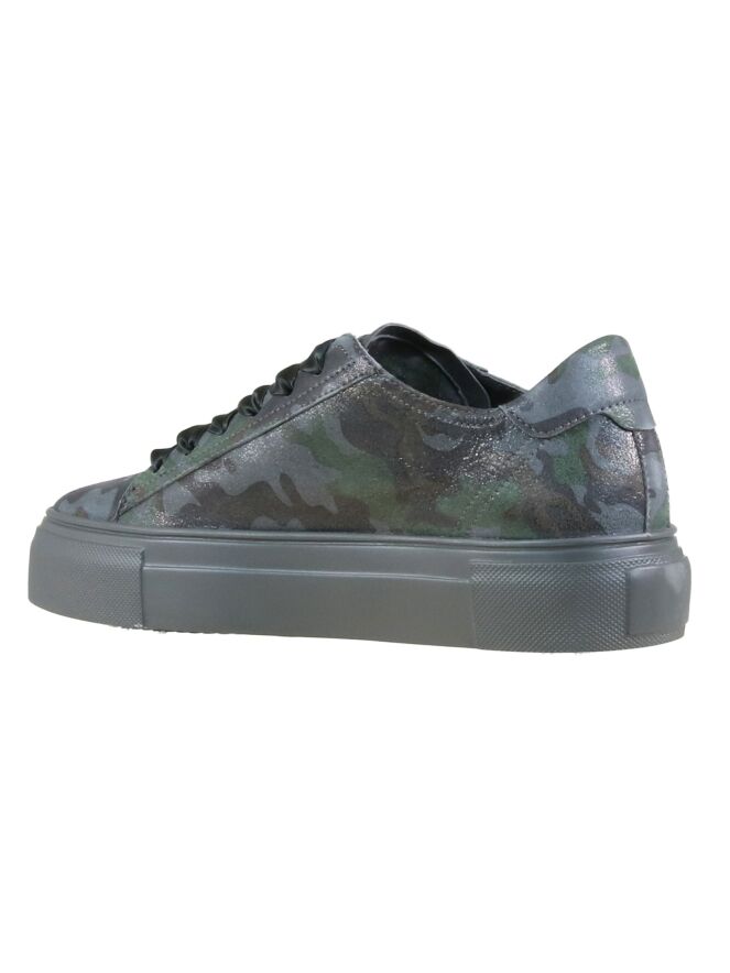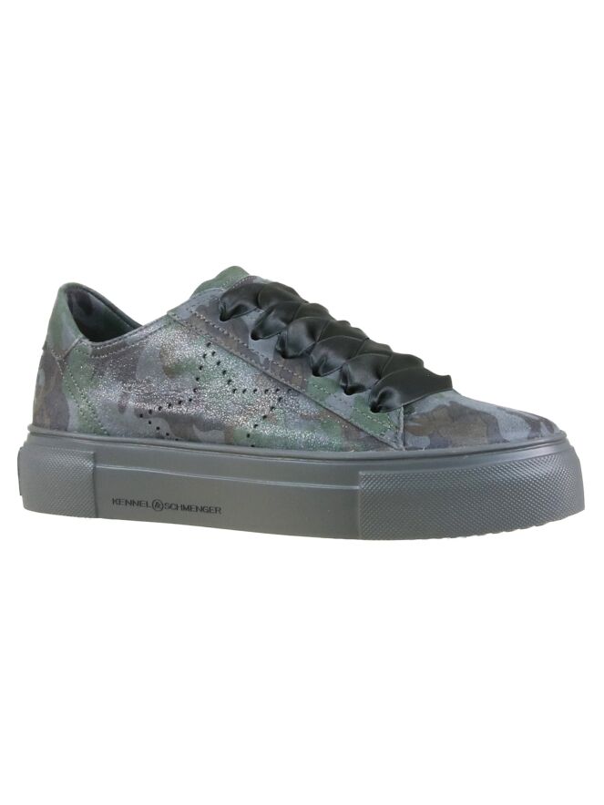 Sneaker de luxe en cuir satiné, de la marque Kennel & Schmenger. Elle est imprimée d'un motif de camouflage d'armée. La chaussure ferme à l'aide d'un ruban croisé en satin mat noir. Semelle intérieure amovible et intérieur partiellement doublé de cuir.