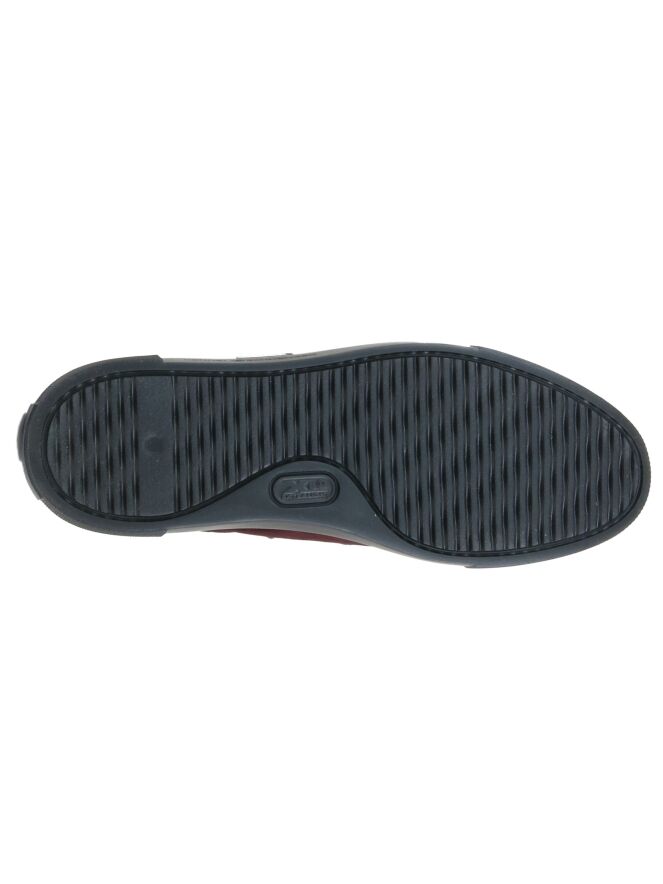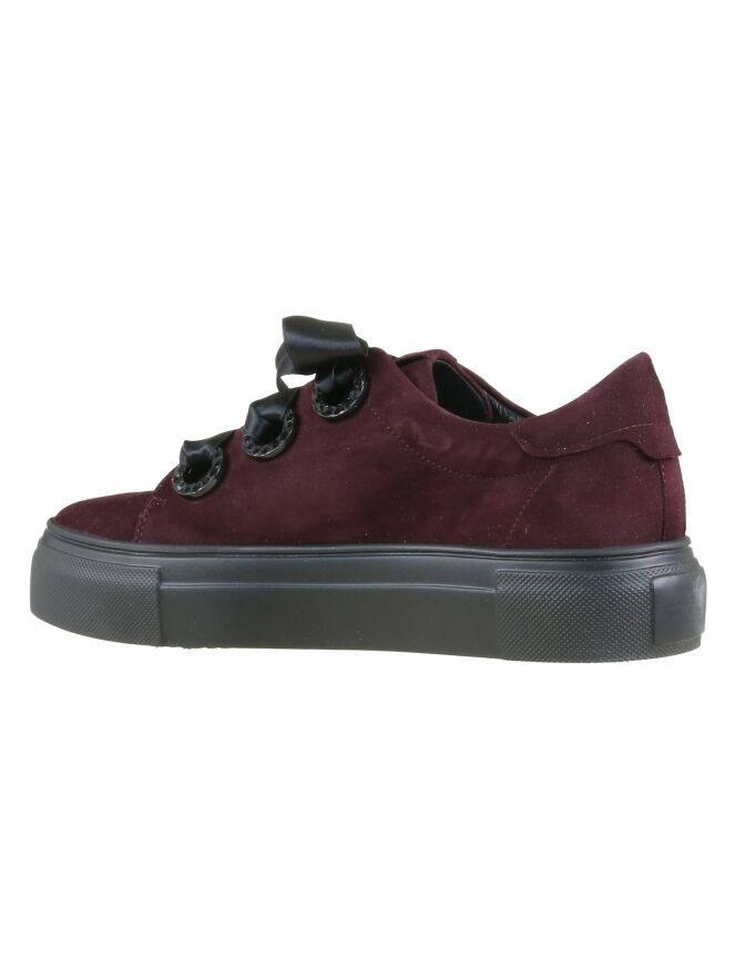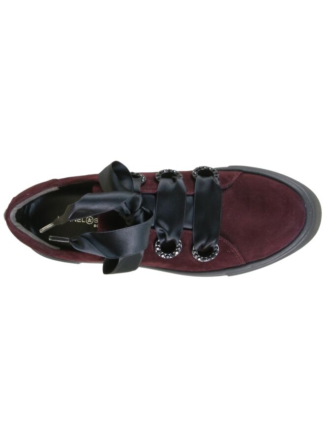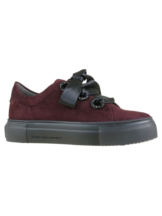 Sneaker de luxe en daim Camoscio de couleur rouge bordeaux, de la marque Kennel & Schmenger. La chaussure ferme à l'aide d'un large ruban en satin mat noir qui passe au travers de six gros œillets à anneaux en strass noirs. Intérieur partiellement doublé de cuir.