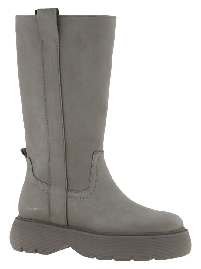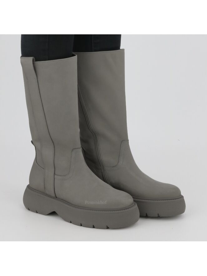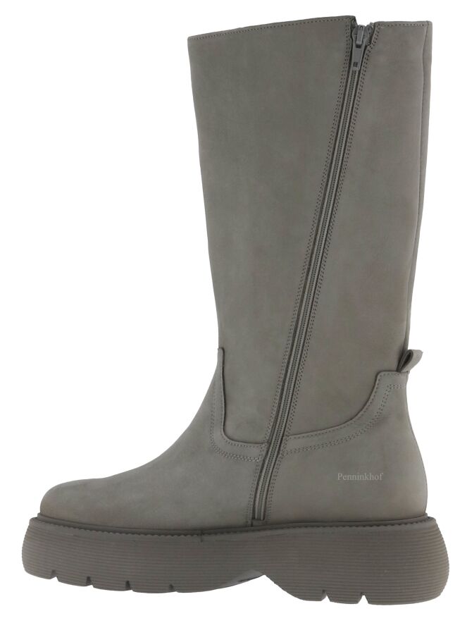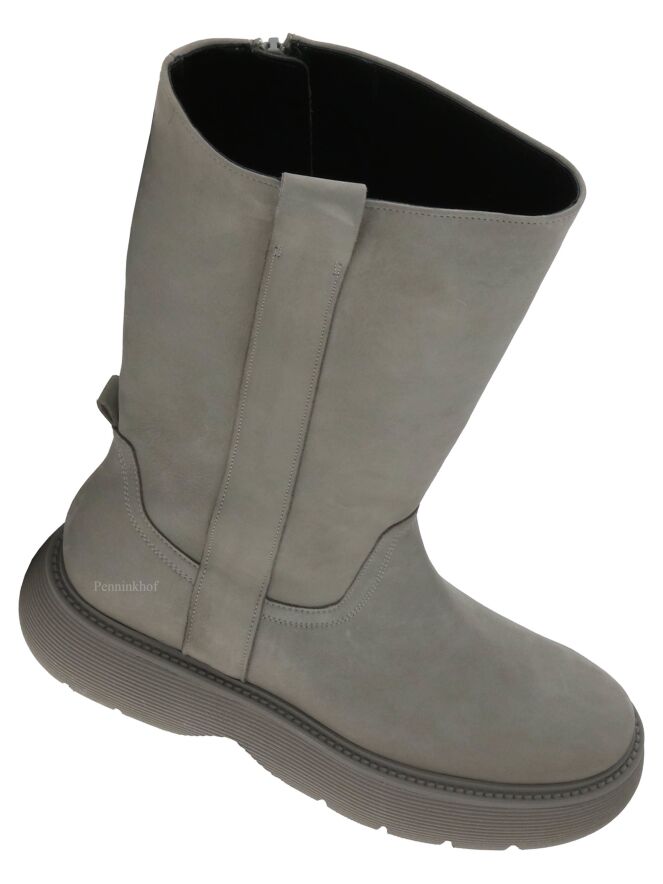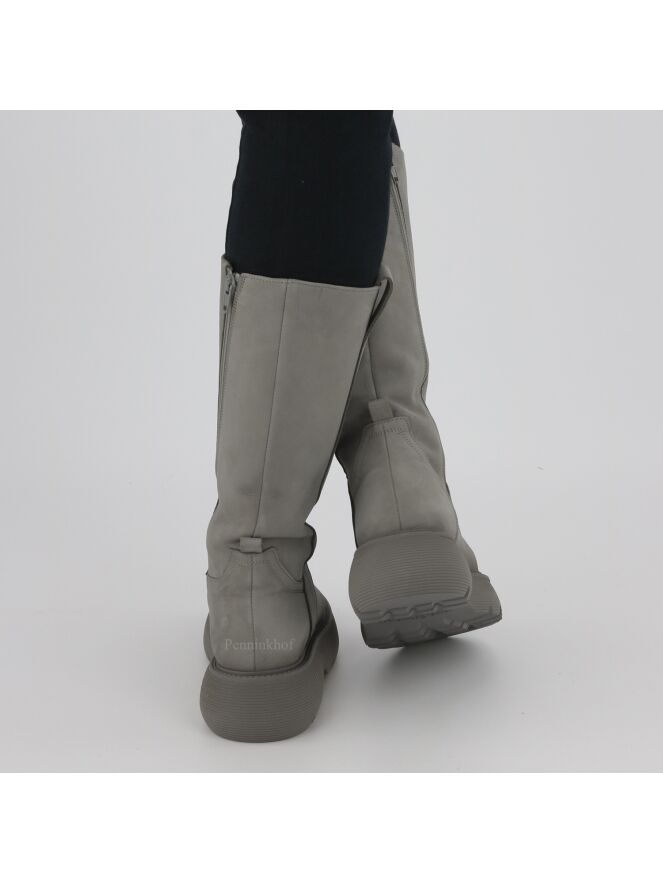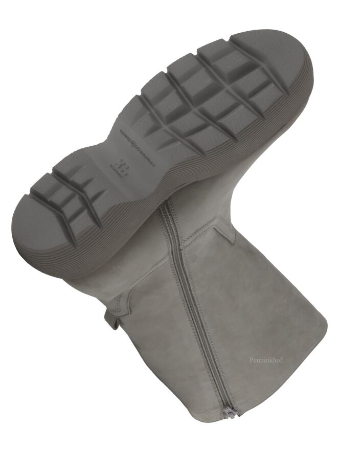 Botte mi-haute de Kennel & Schmenger de couleur grise. La botte est dotée d'une semelle compensée noire finement nervurée. A l'intérieur, une fermeture éclair en diagonale se trouve sur toute la longueur de la tige. L'intérieur de la tige est doublé de cuir.